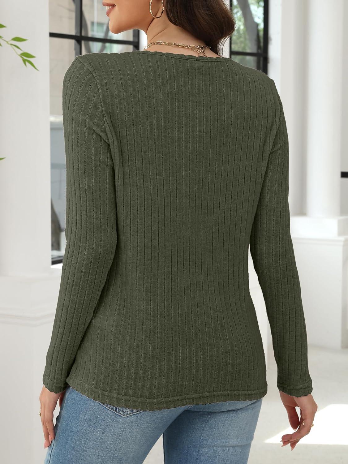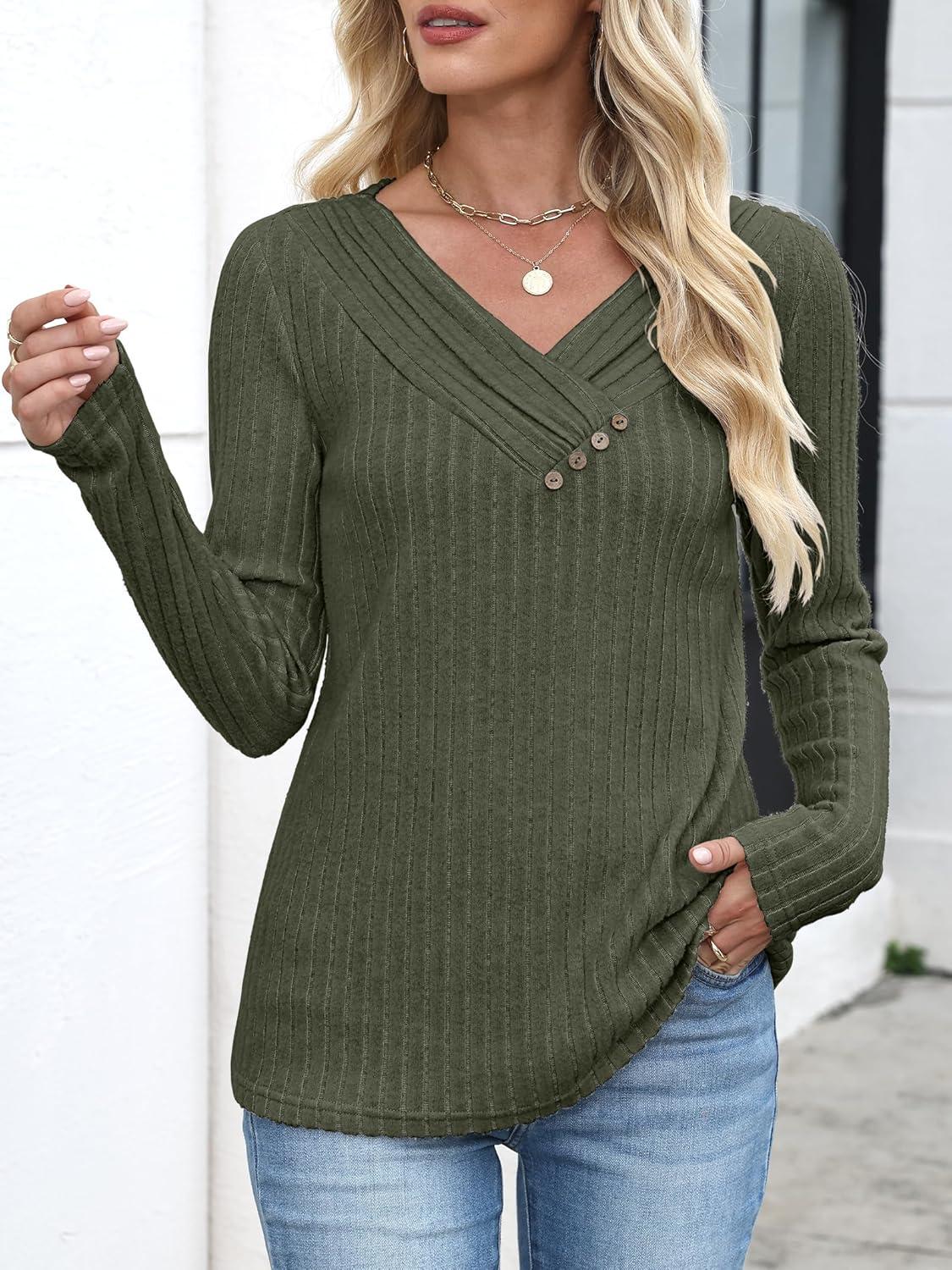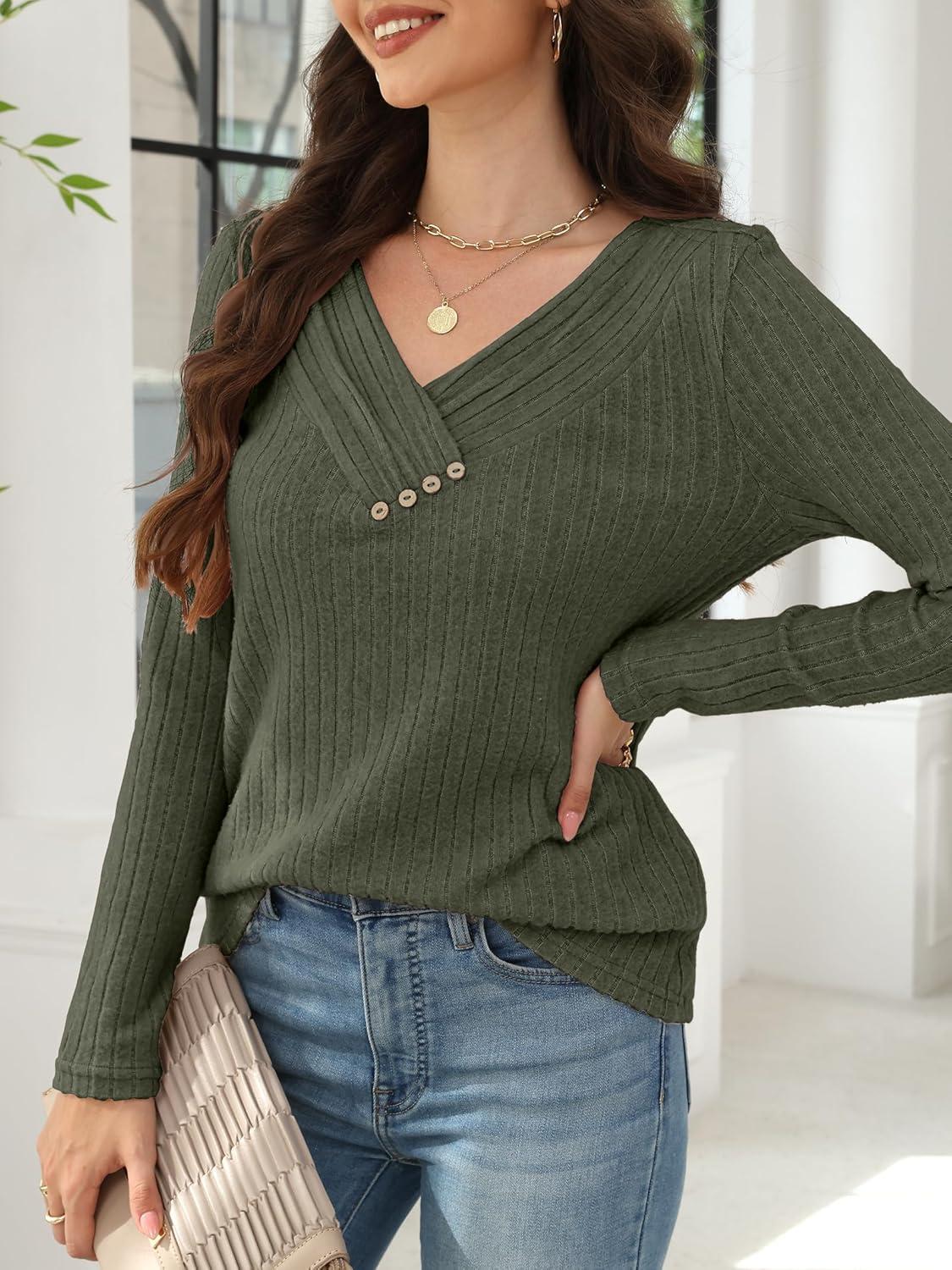 ANRABESS Women’s Long Sleeve Tunic Tops for Leggings Casual V Neck Button Shirts 2025 Fall Light Pullover Sweaters Blouse(Deep Green)