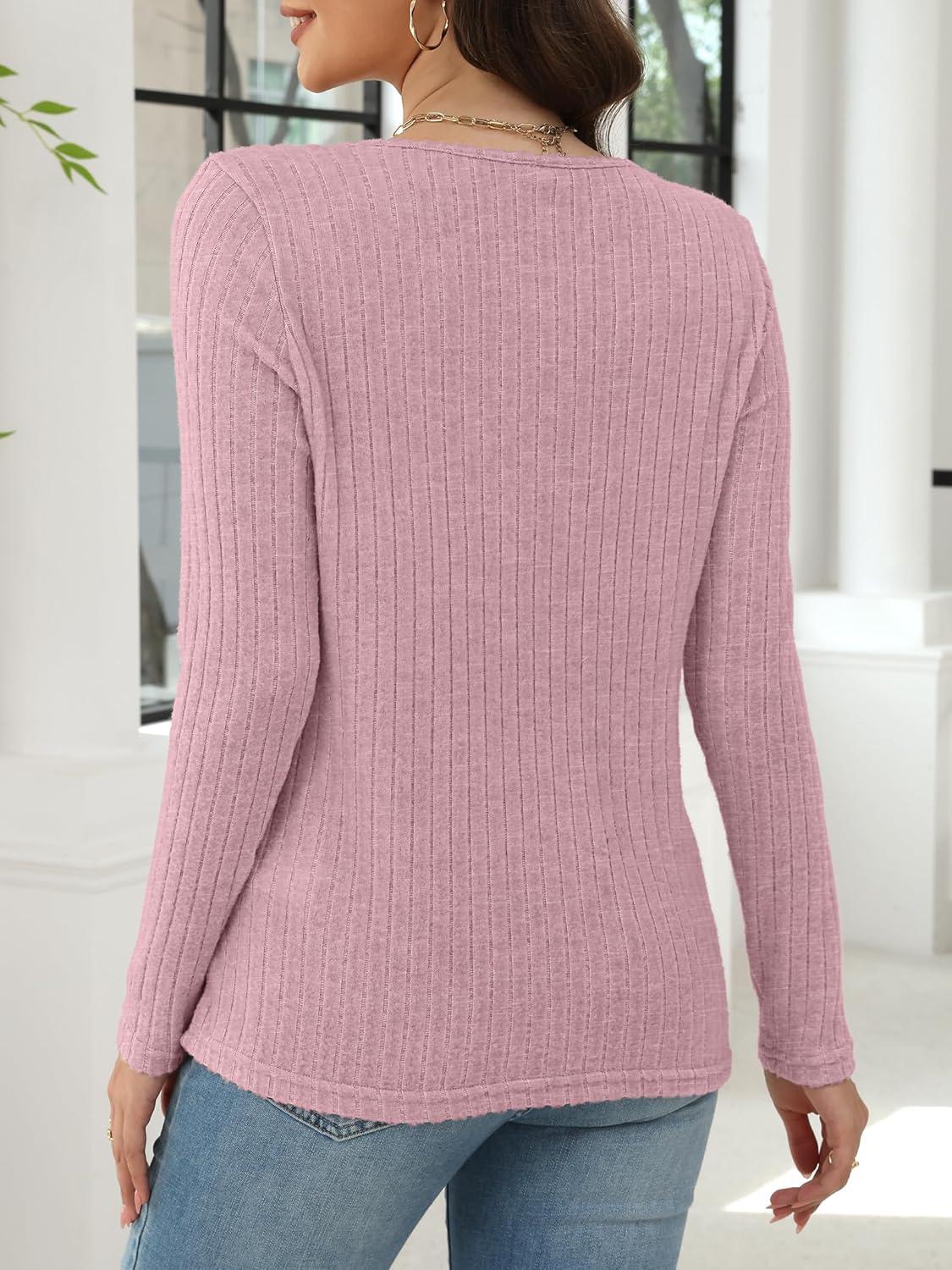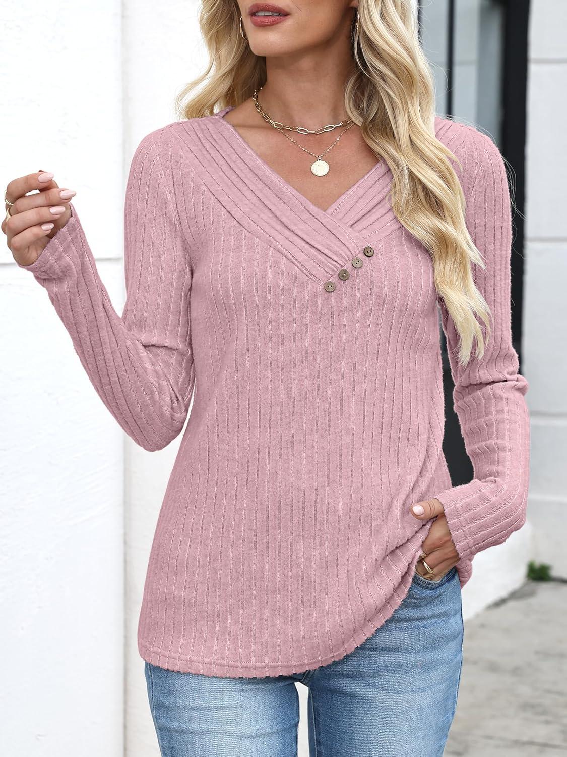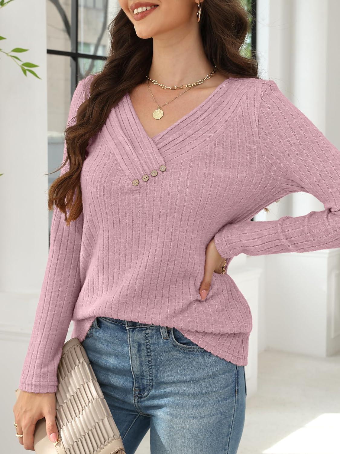 ANRABESS Women’s Long Sleeve Tunic Tops for Leggings Casual V Neck Button Shirts 2025 Fall Light Pullover Sweaters Blouse(Grey Begie)
