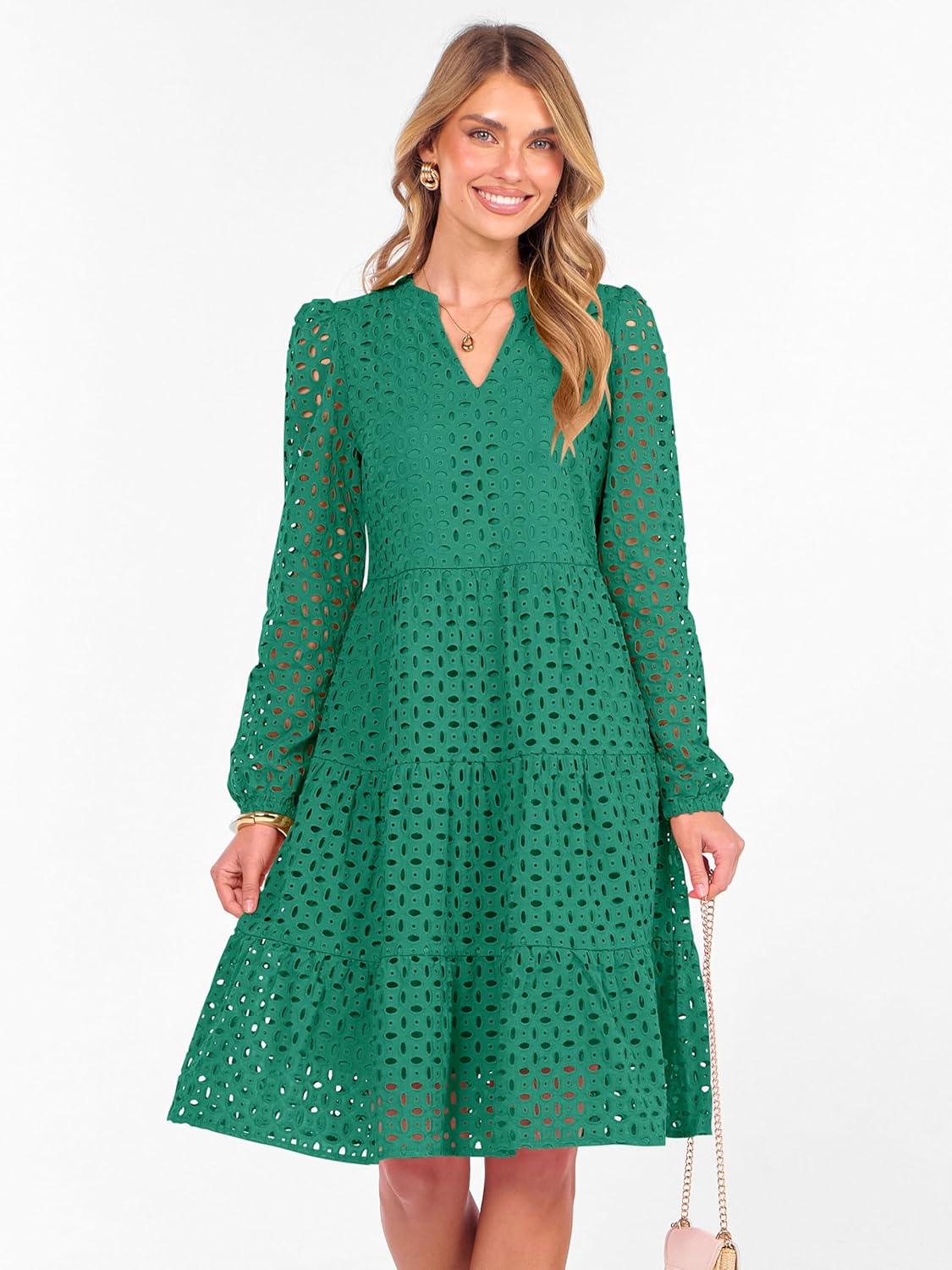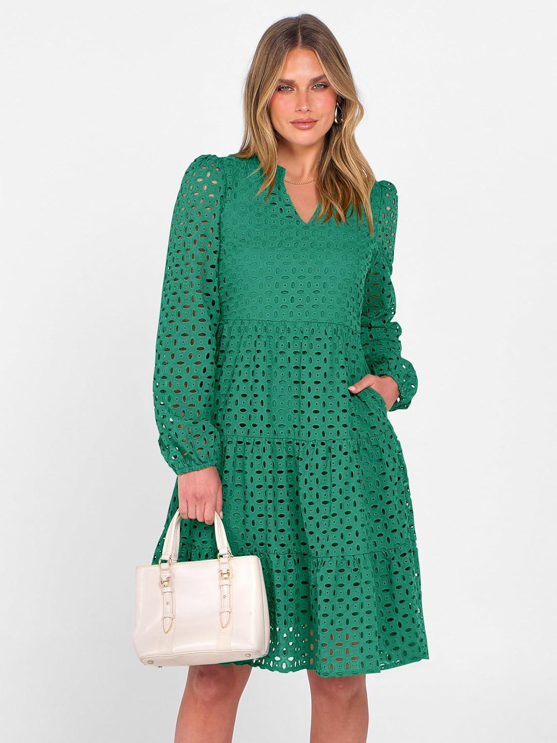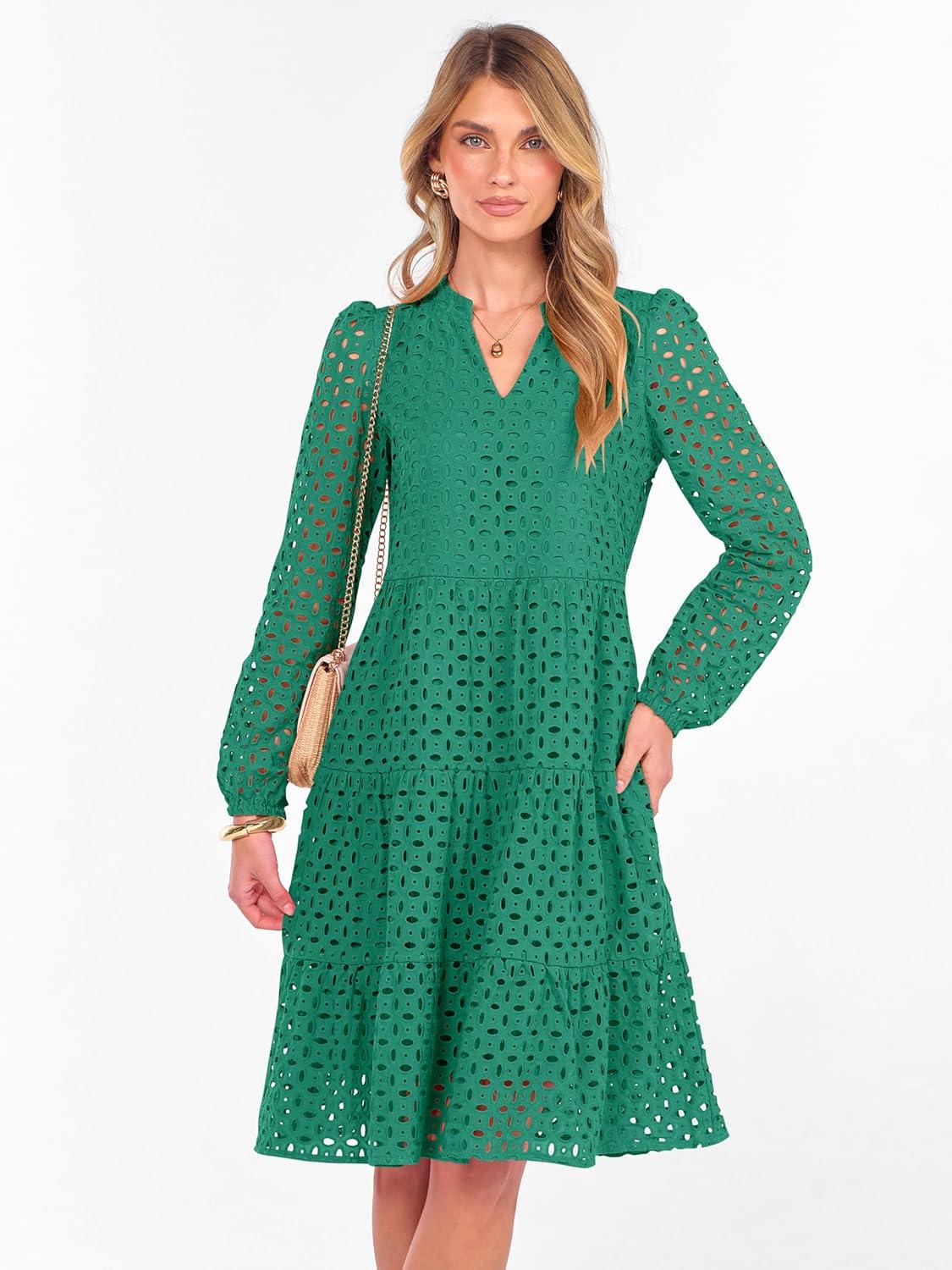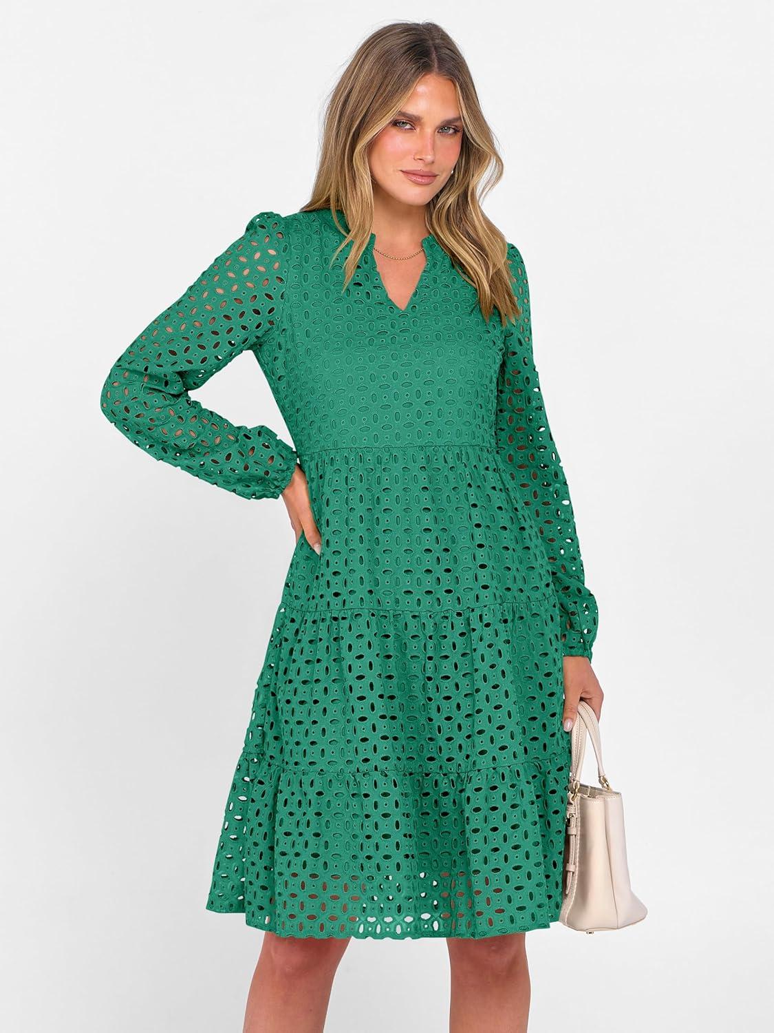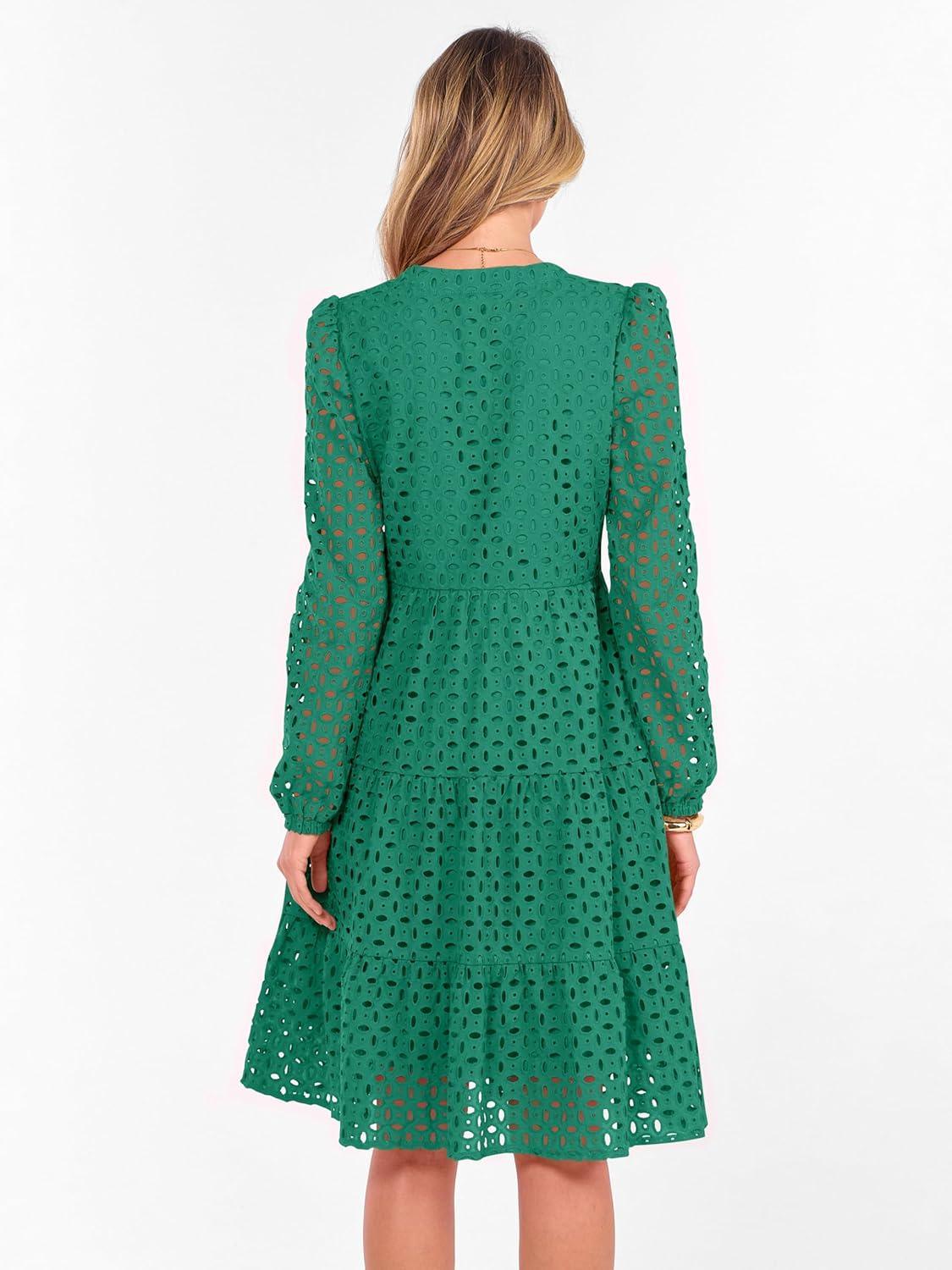 ANRABESS Womens Long Sleeve V Neck MIdi Dresses Hollow Out Eyelet Casual Tiered 2025 Fall Beach Vacation Dress with Pockets(Green)