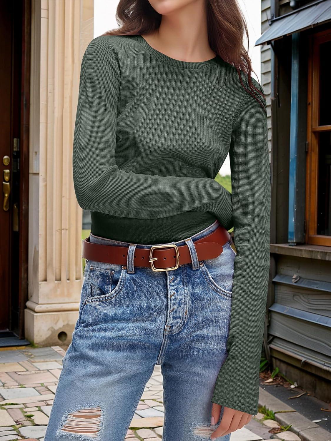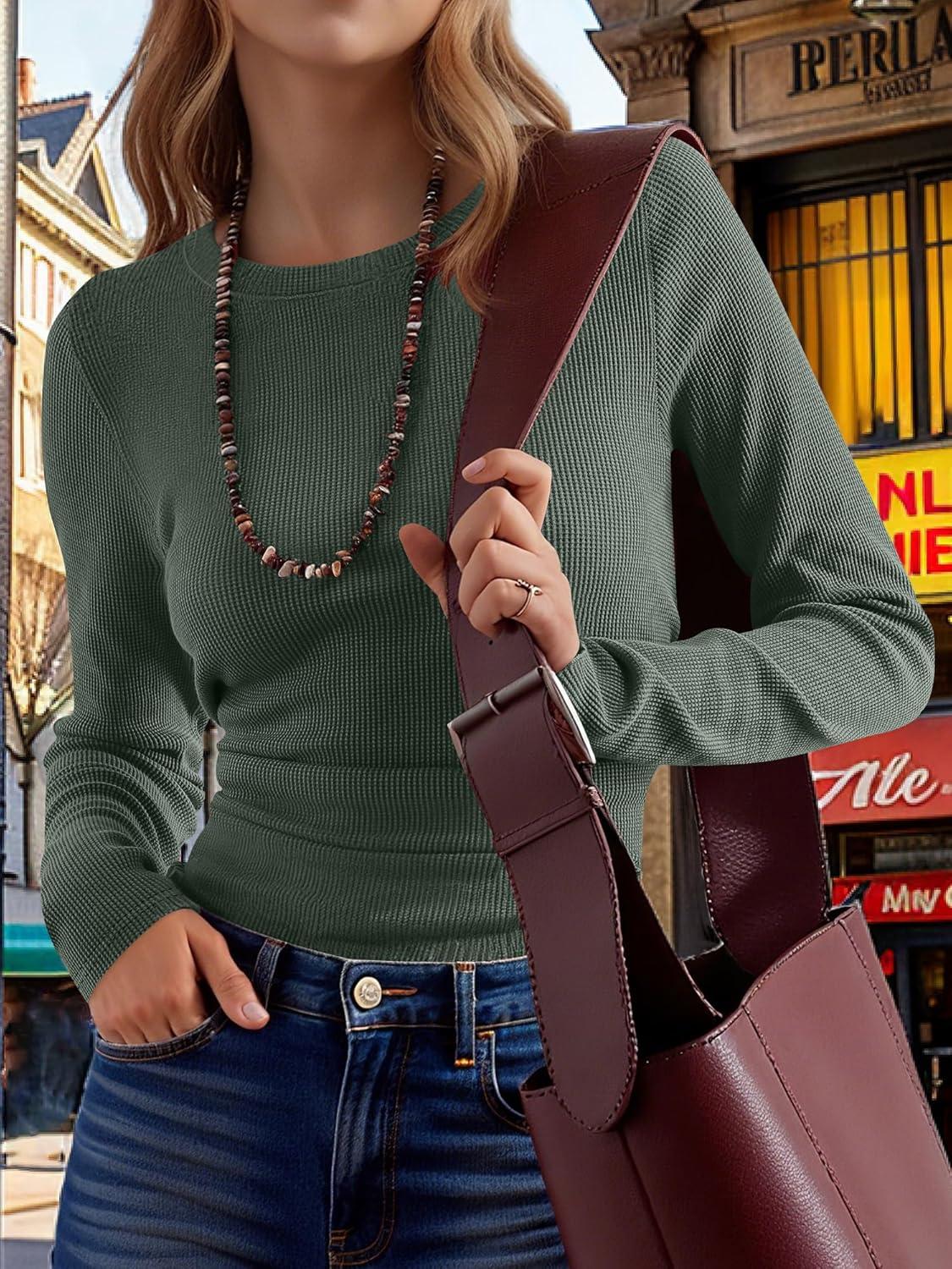 ANRABESS Women’s Long Sleeve Waffle Knit Shirts Casual Slim Fitted Crew Neck Thermal Tops Basic Tee 2025 Fall Trendy Outfits(Army Green)