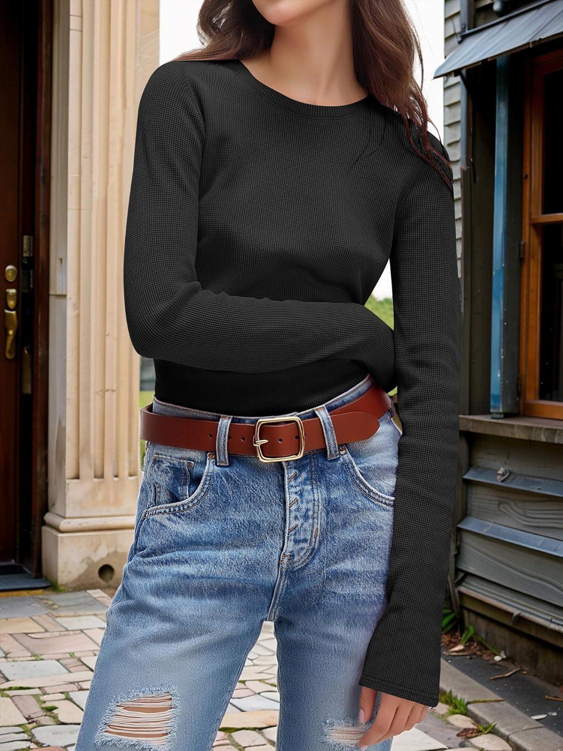 ANRABESS Women’s Long Sleeve Waffle Knit Shirts Casual Slim Fitted Crew Neck Thermal Tops Basic Tee 2025 Fall Trendy Outfits(Black)