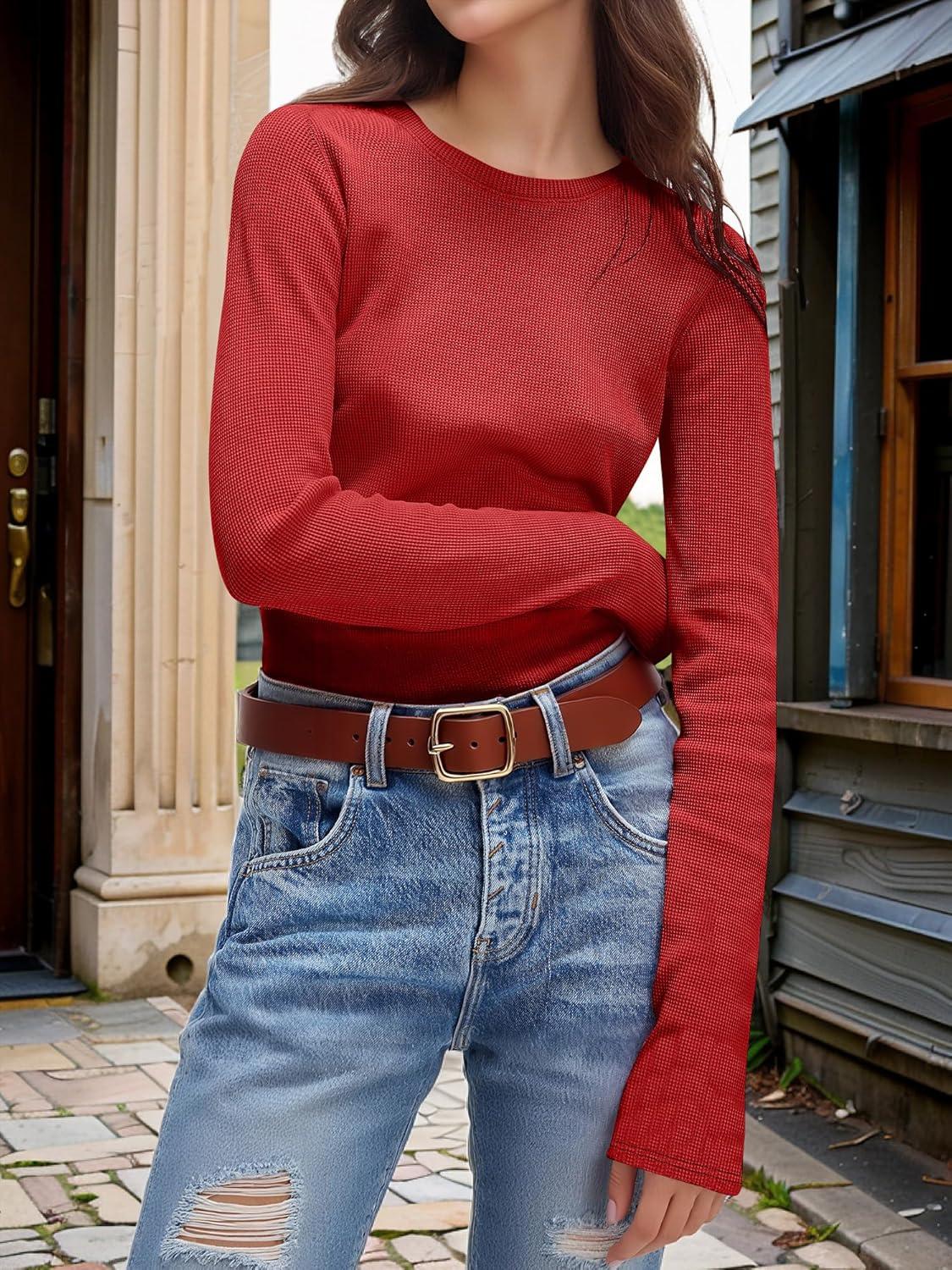 ANRABESS Women’s Long Sleeve Waffle Knit Shirts Casual Slim Fitted Crew Neck Thermal Tops Basic Tee 2025 Fall Trendy Outfits(Bright Red)
