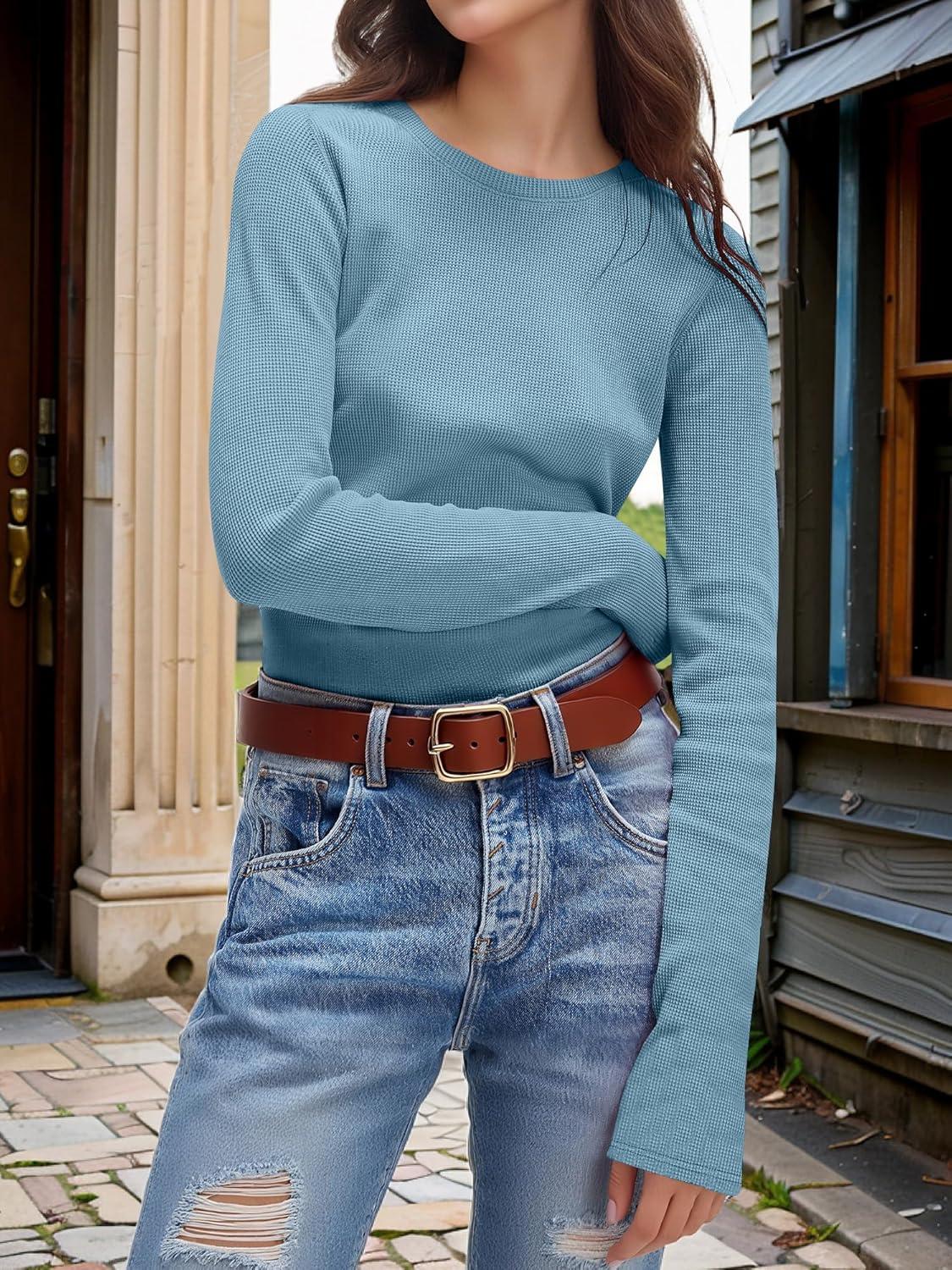ANRABESS Women’s Long Sleeve Waffle Knit Shirts Casual Slim Fitted Crew Neck Thermal Tops Basic Tee 2025 Fall Trendy Outfits(Dusty Blue)