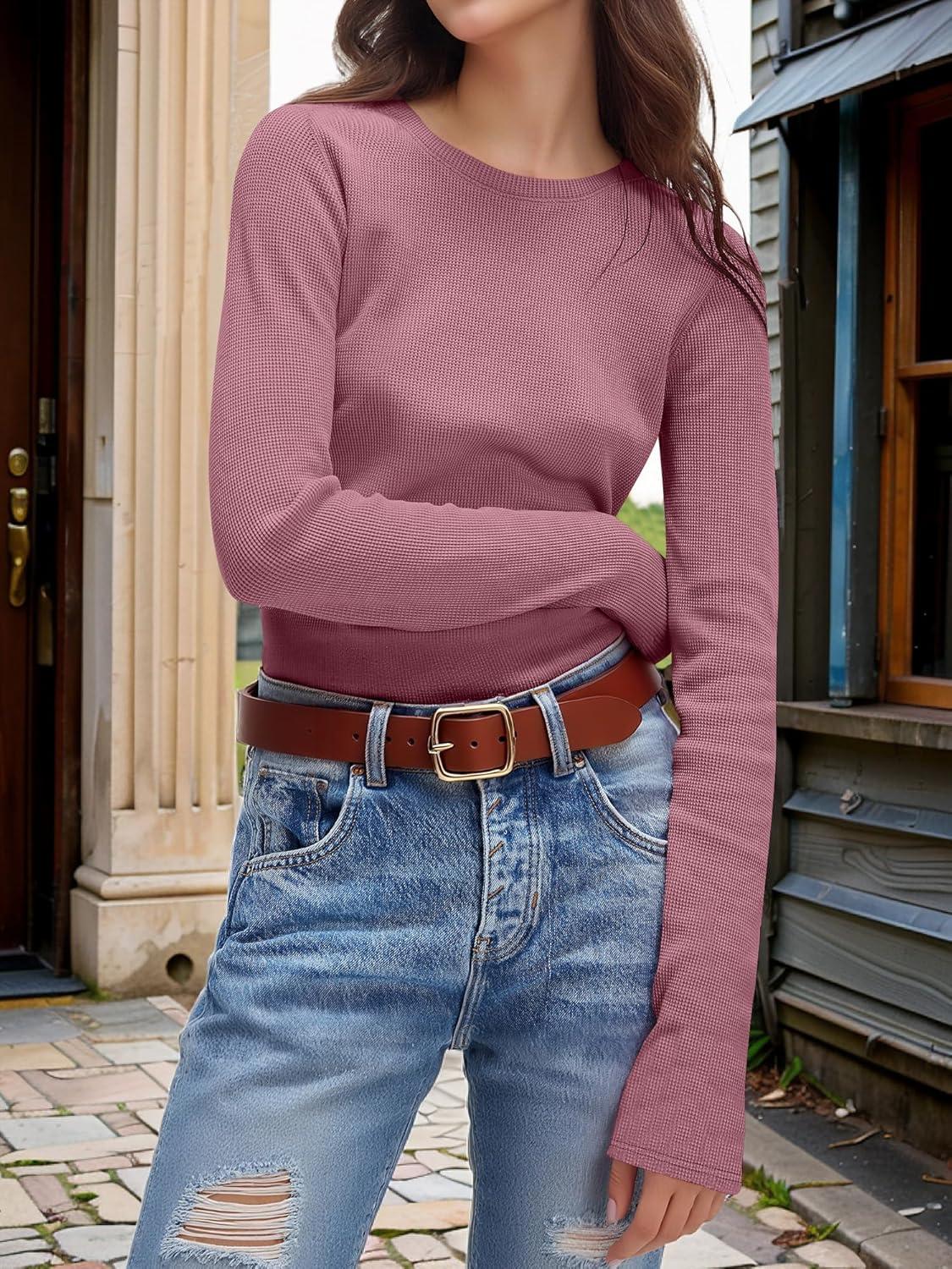 ANRABESS Women’s Long Sleeve Waffle Knit Shirts Casual Slim Fitted Crew Neck Thermal Tops Basic Tee 2025 Fall Trendy Outfits(Mauve)