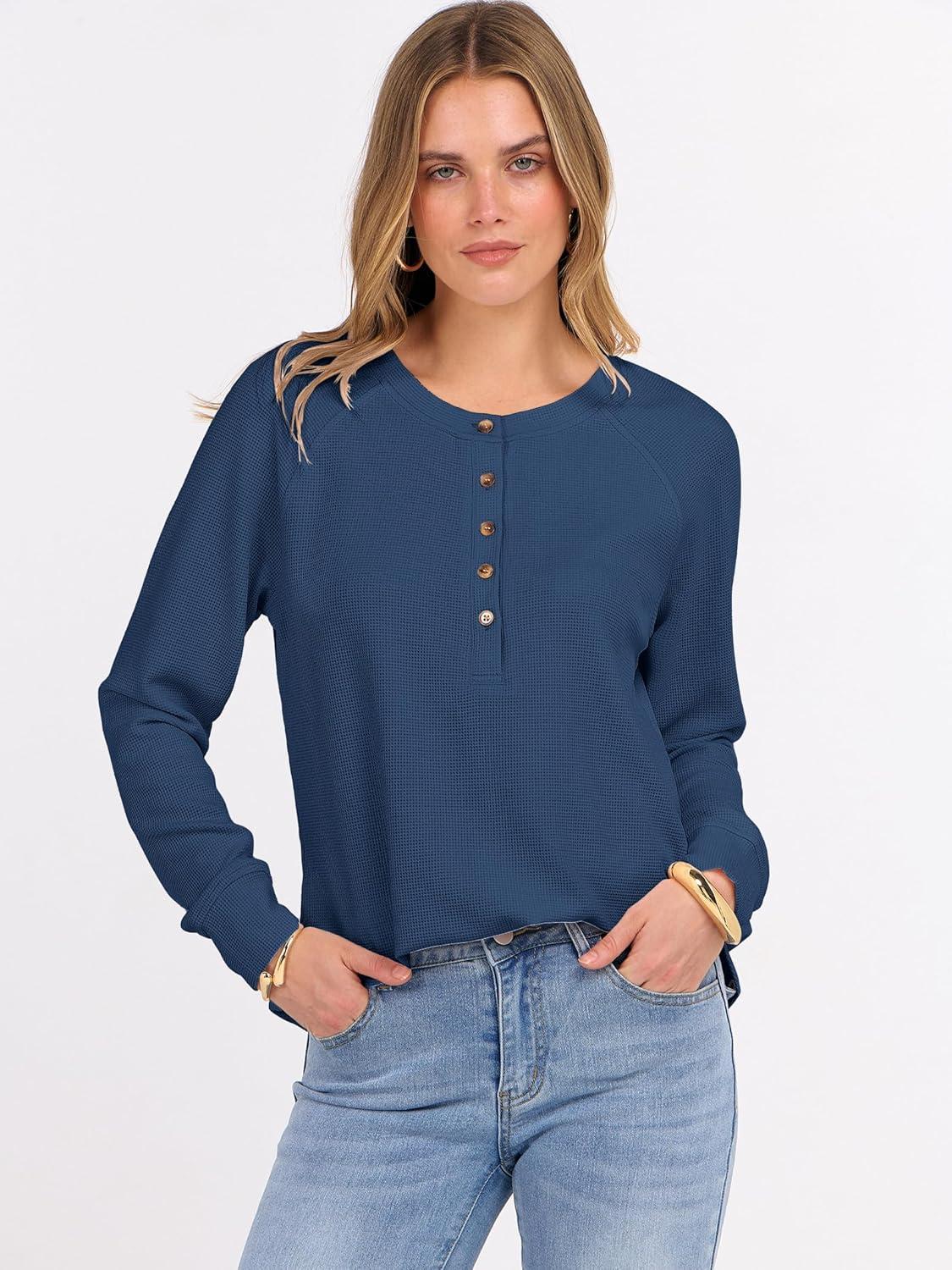 ANRABESS Women’s Long Sleeve Waffle Knit Shirts Dressy Casual Loose Button Up V Neck Henley Tops 2025 Fall Basic Tee Blouse(Navy Blue)
