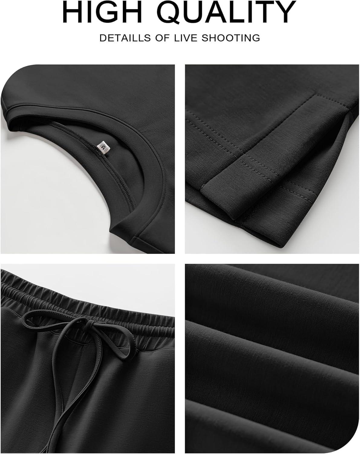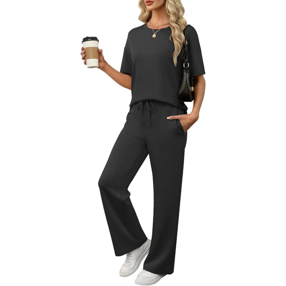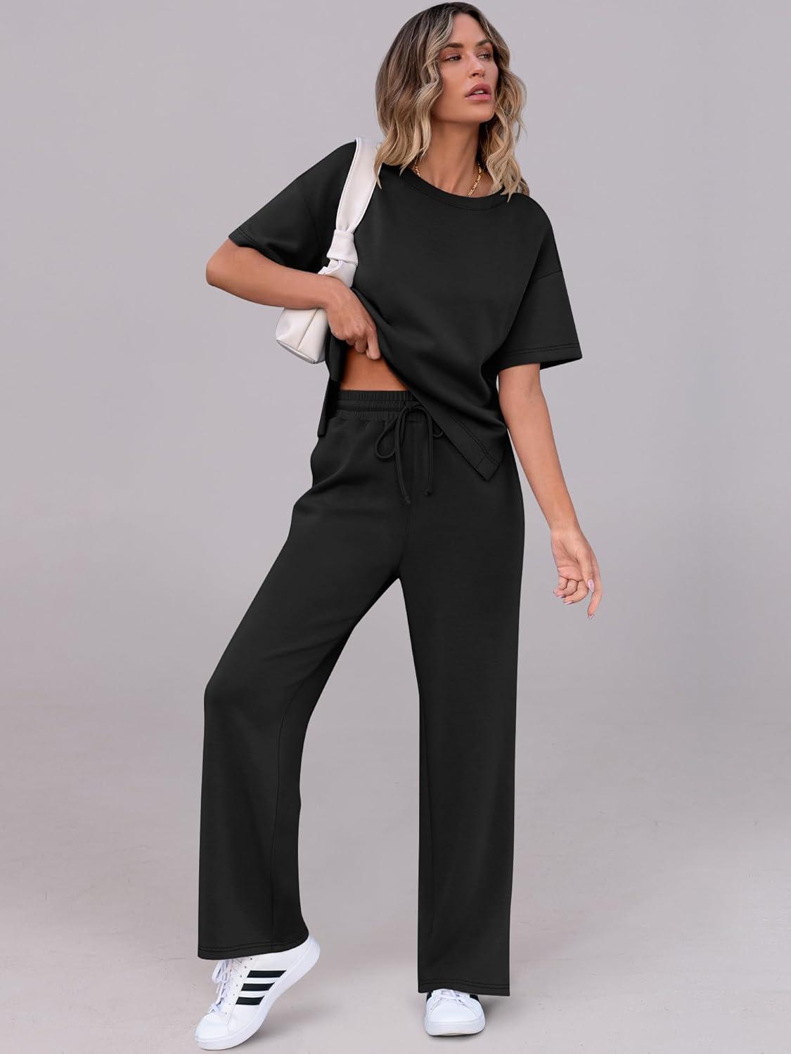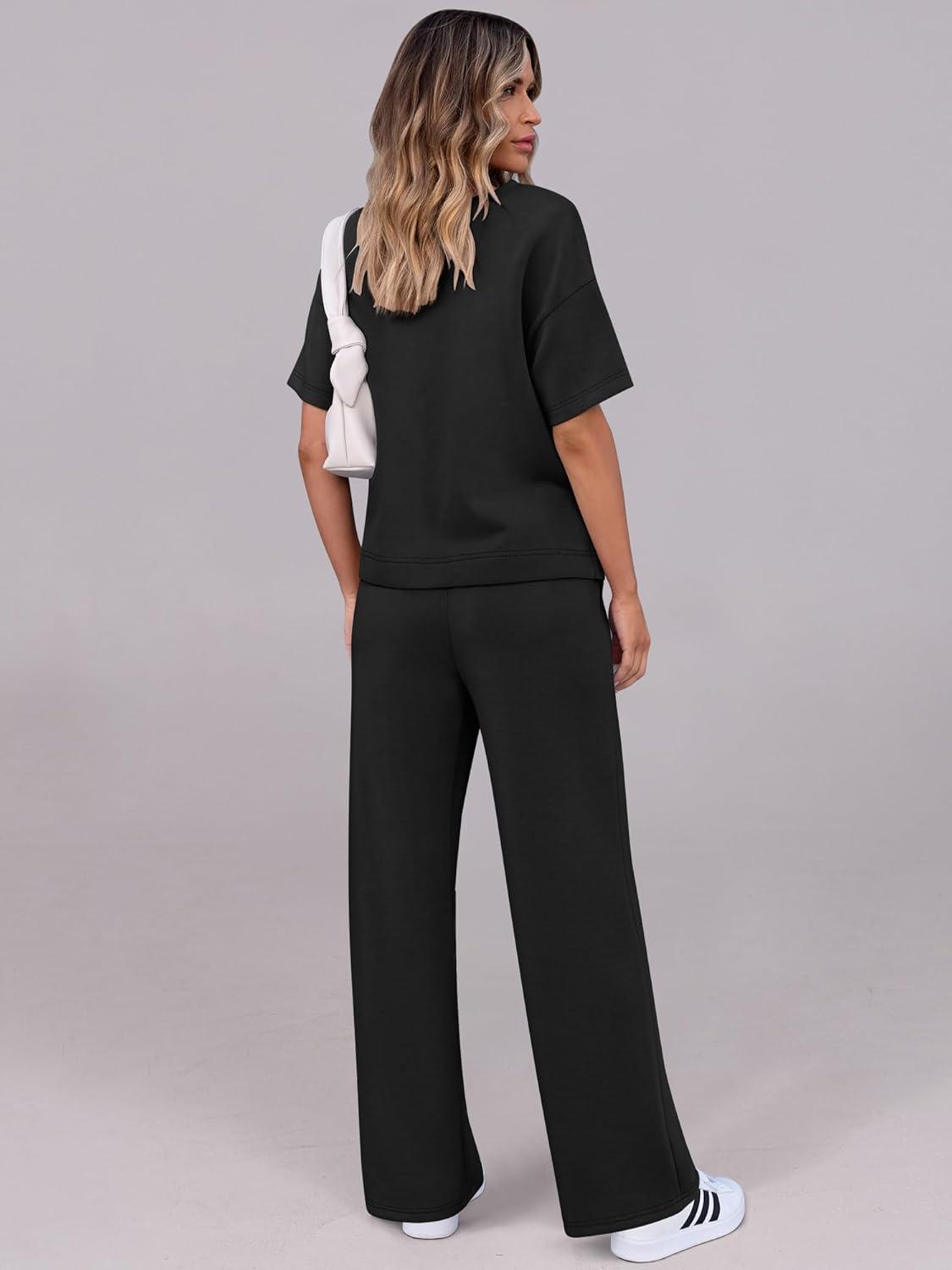 ANRABESS Women’s Lounge Sets 2 Piece Outfits Summer Casual Short Sleeve Sweatsuits Matching Tracksuits Wide Leg Pant Set(Black)