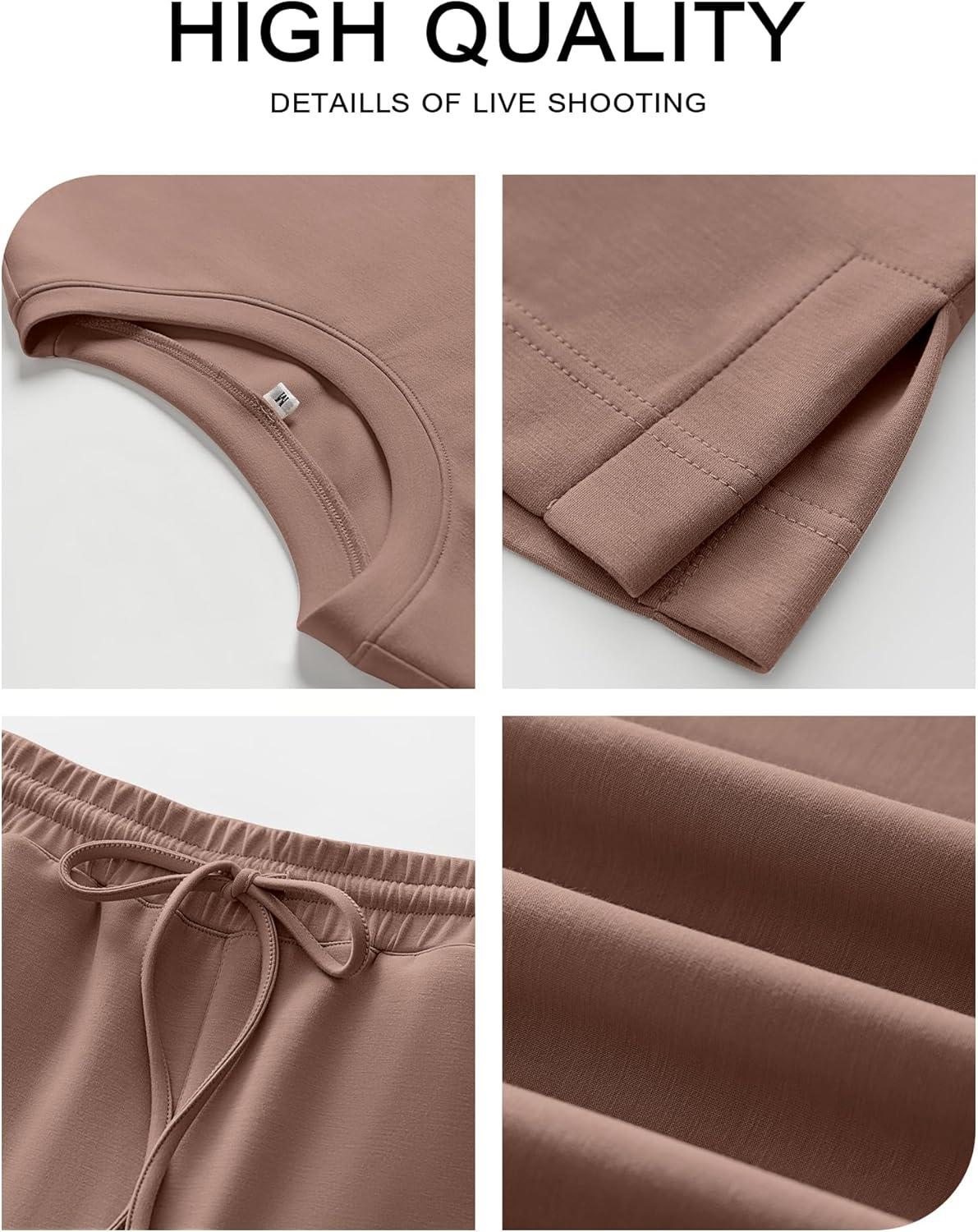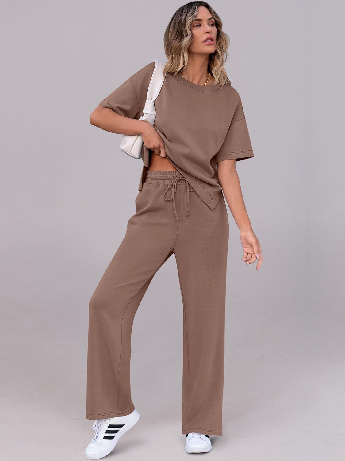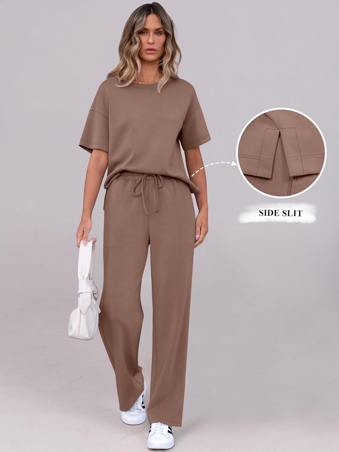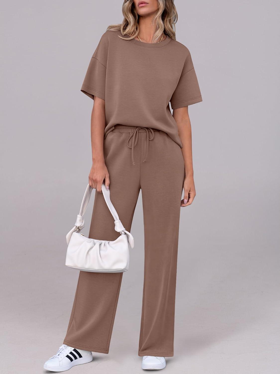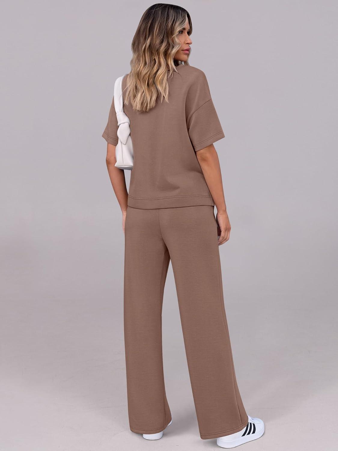 ANRABESS Women’s Lounge Sets 2 Piece Outfits Summer Casual Short Sleeve Sweatsuits Matching Tracksuits Wide Leg Pant Set(Brown)