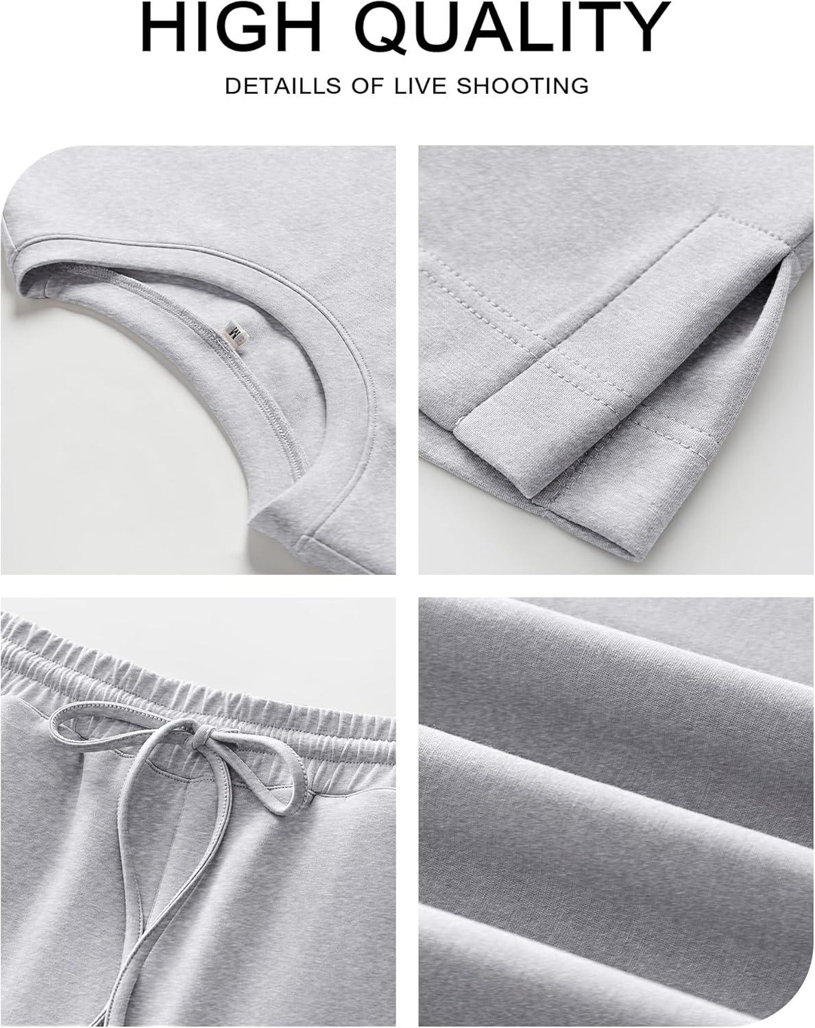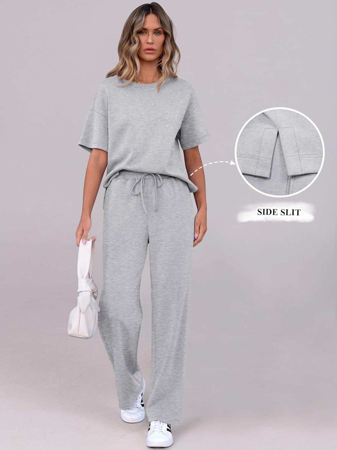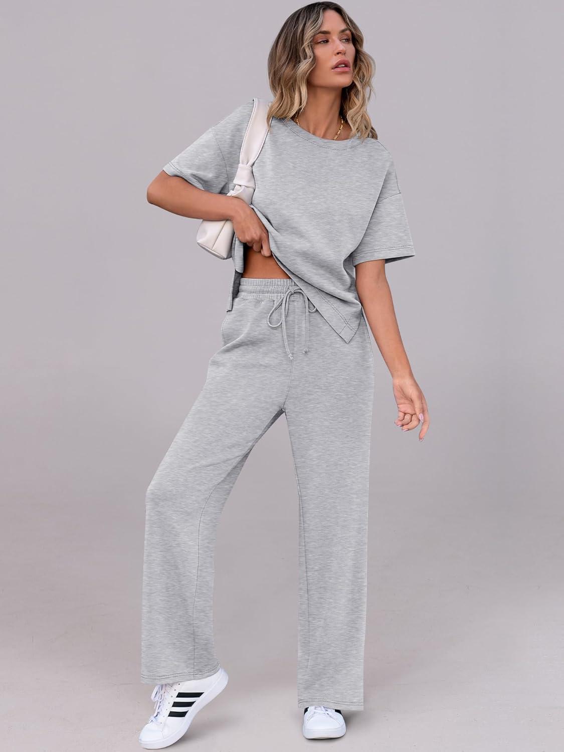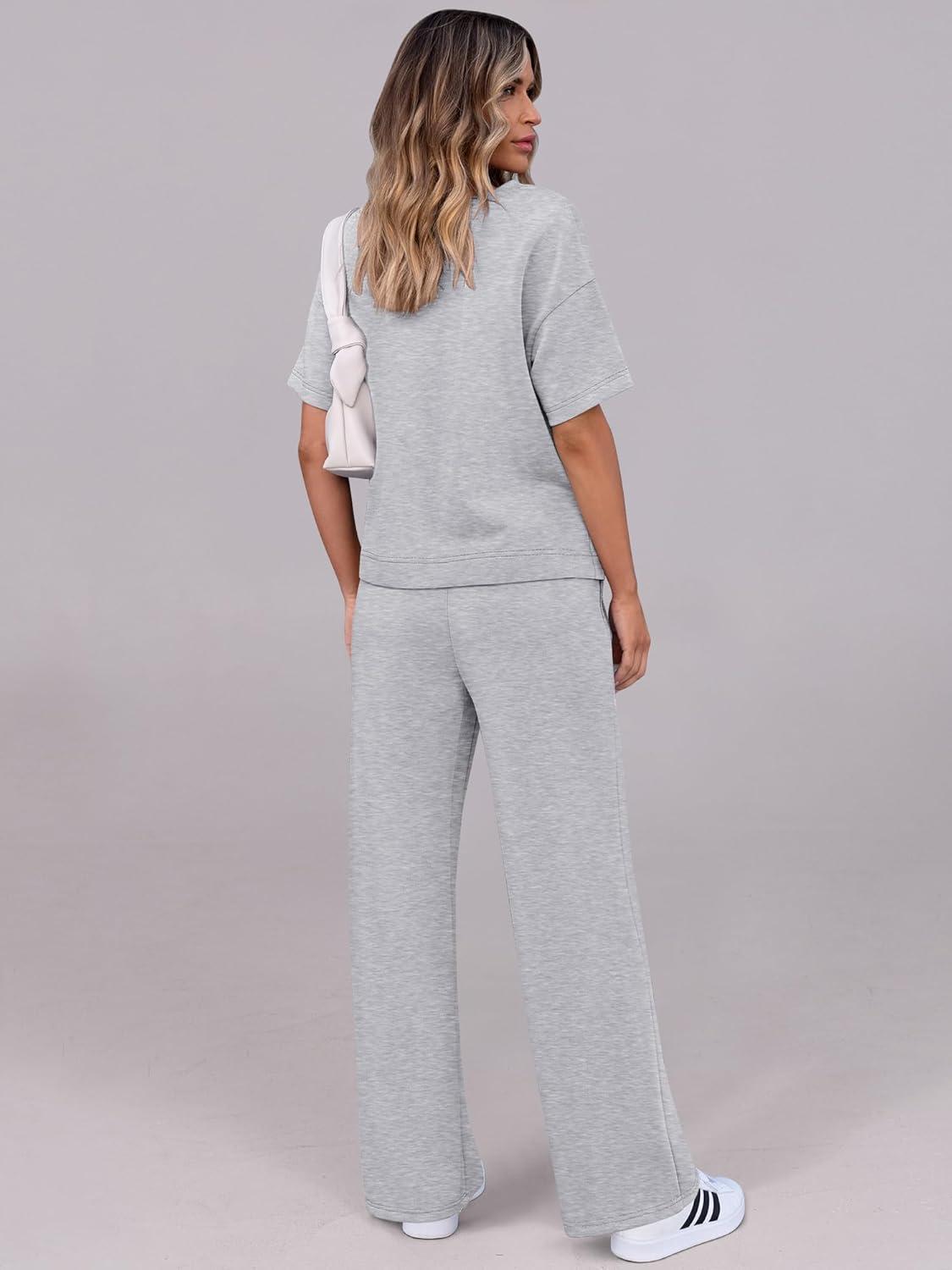 ANRABESS Women’s Lounge Sets 2 Piece Outfits Summer Casual Short Sleeve Sweatsuits Matching Tracksuits Wide Leg Pant Set(Light Grey)