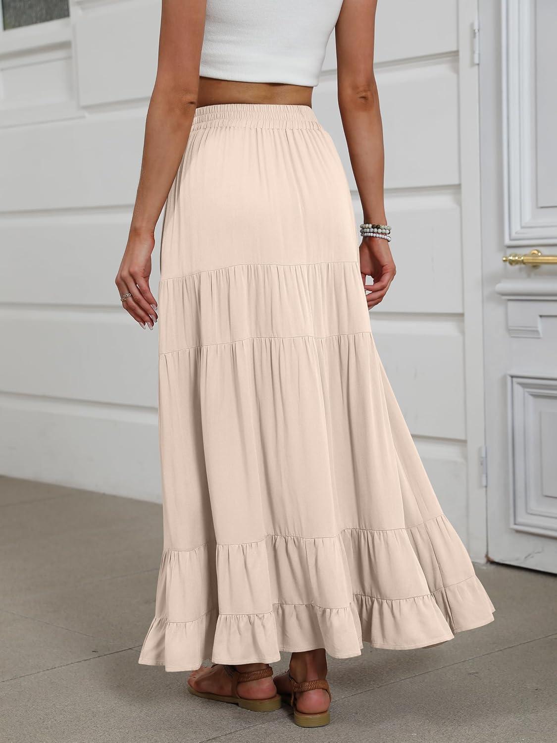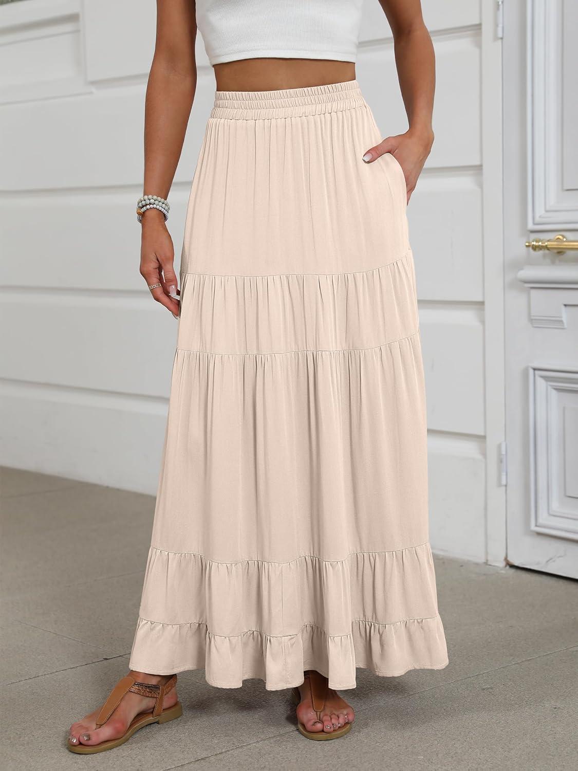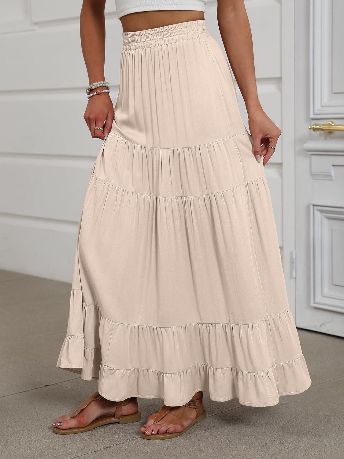 ANRABESS Womens Maxi Skirt Elastic High Waist Swing Tiered A-line Flowy Pleated Boho Beach Vacation Long Skirts(Beige)