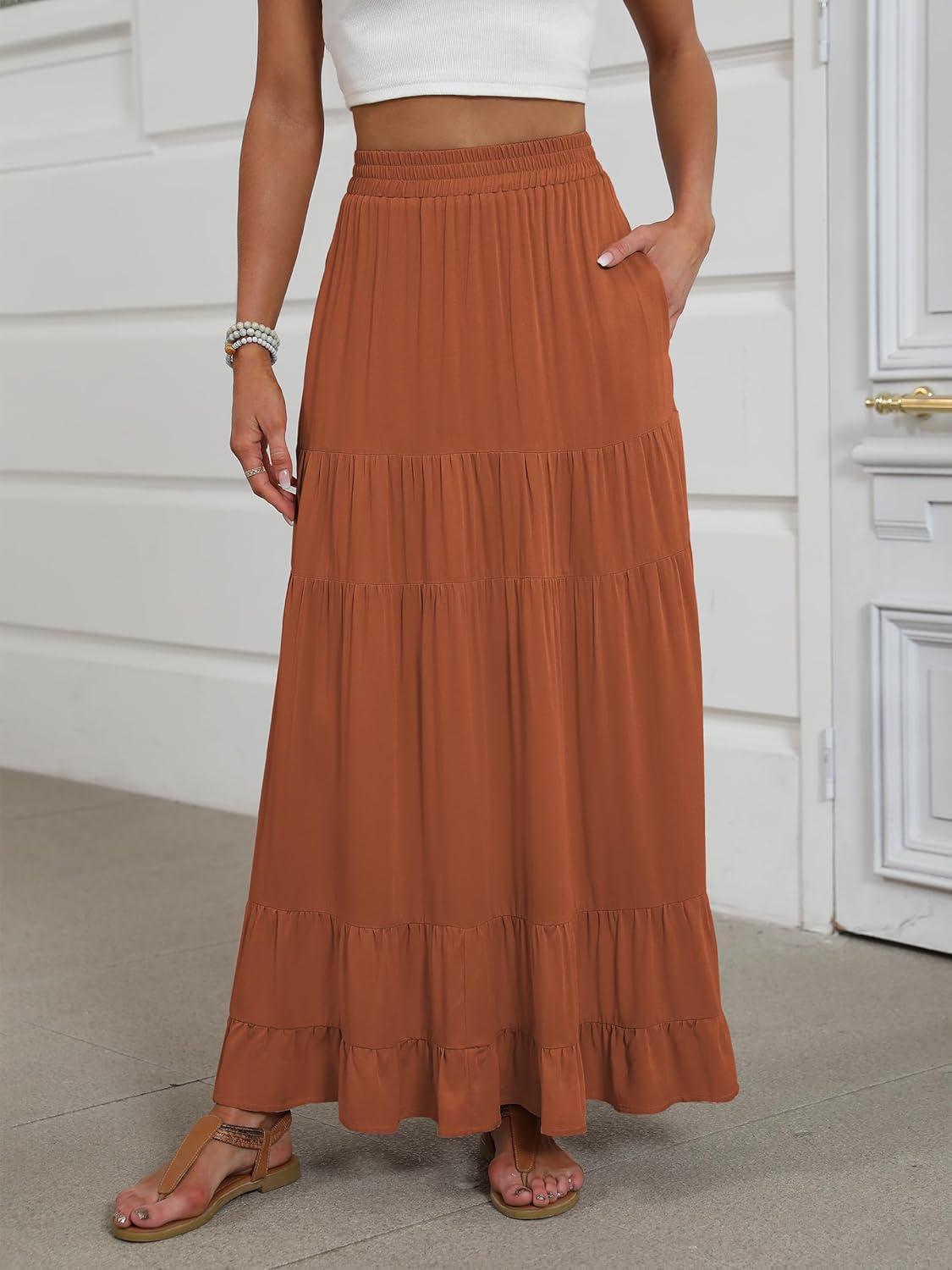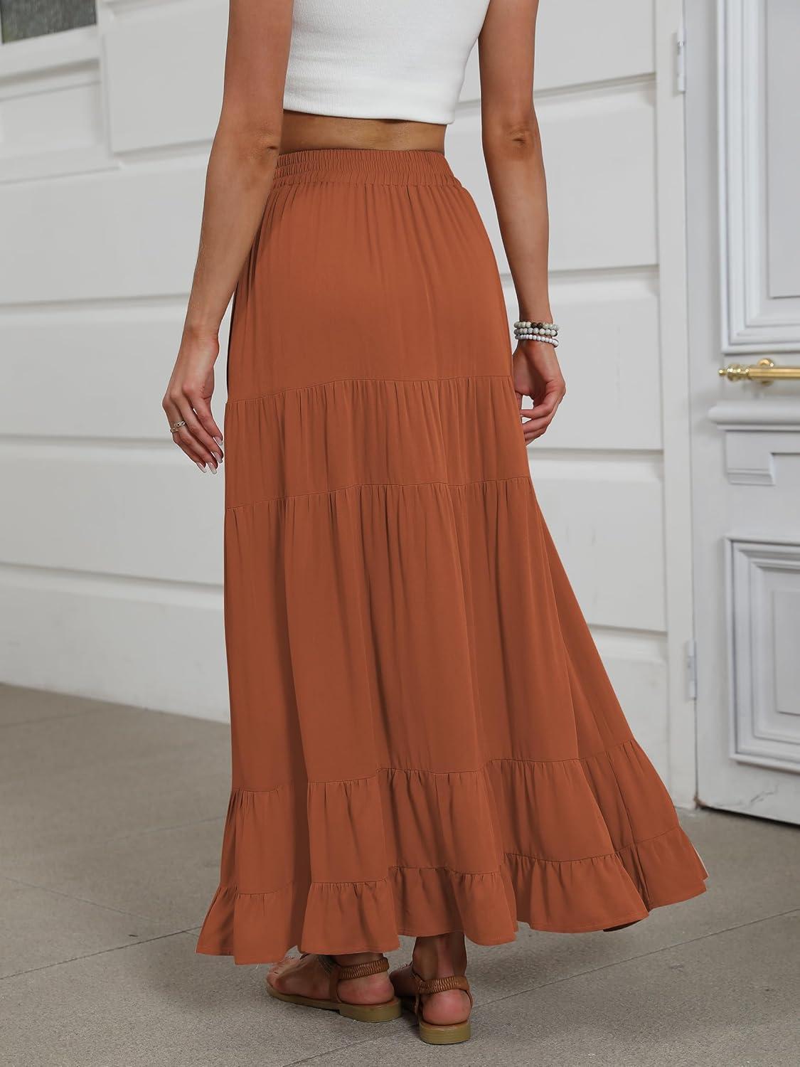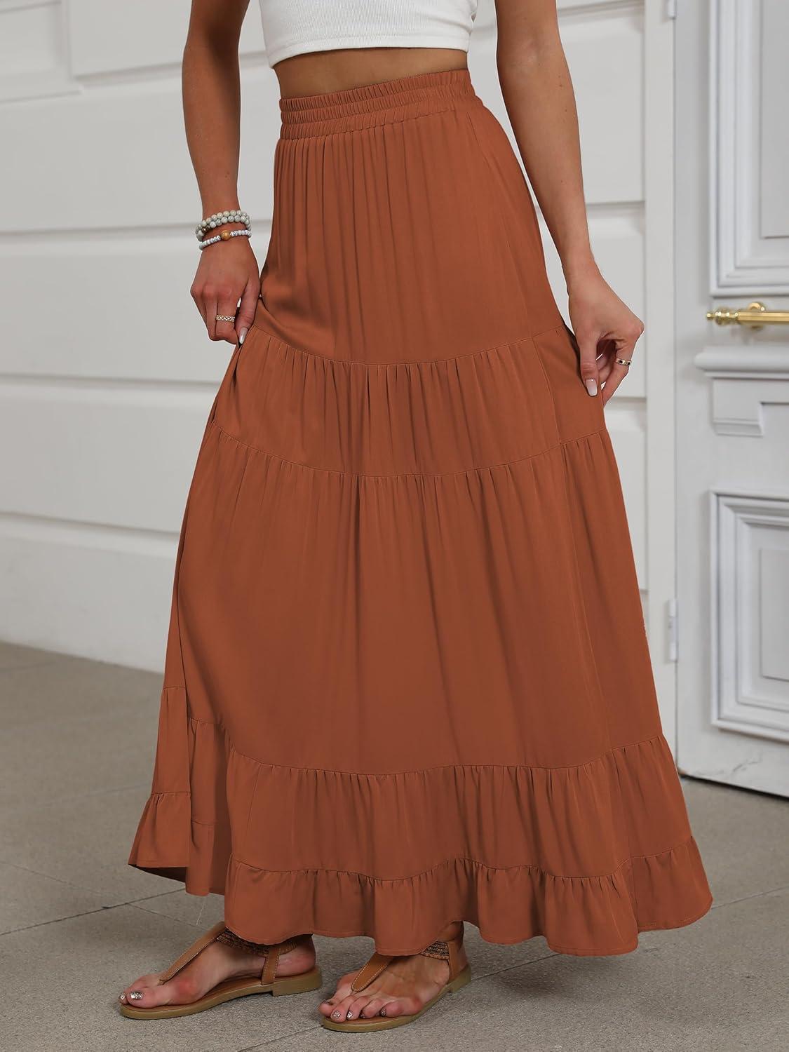ANRABESS Womens Maxi Skirt Elastic High Waist Swing Tiered A-line Flowy Pleated Boho Beach Vacation Long Skirts(Rust)