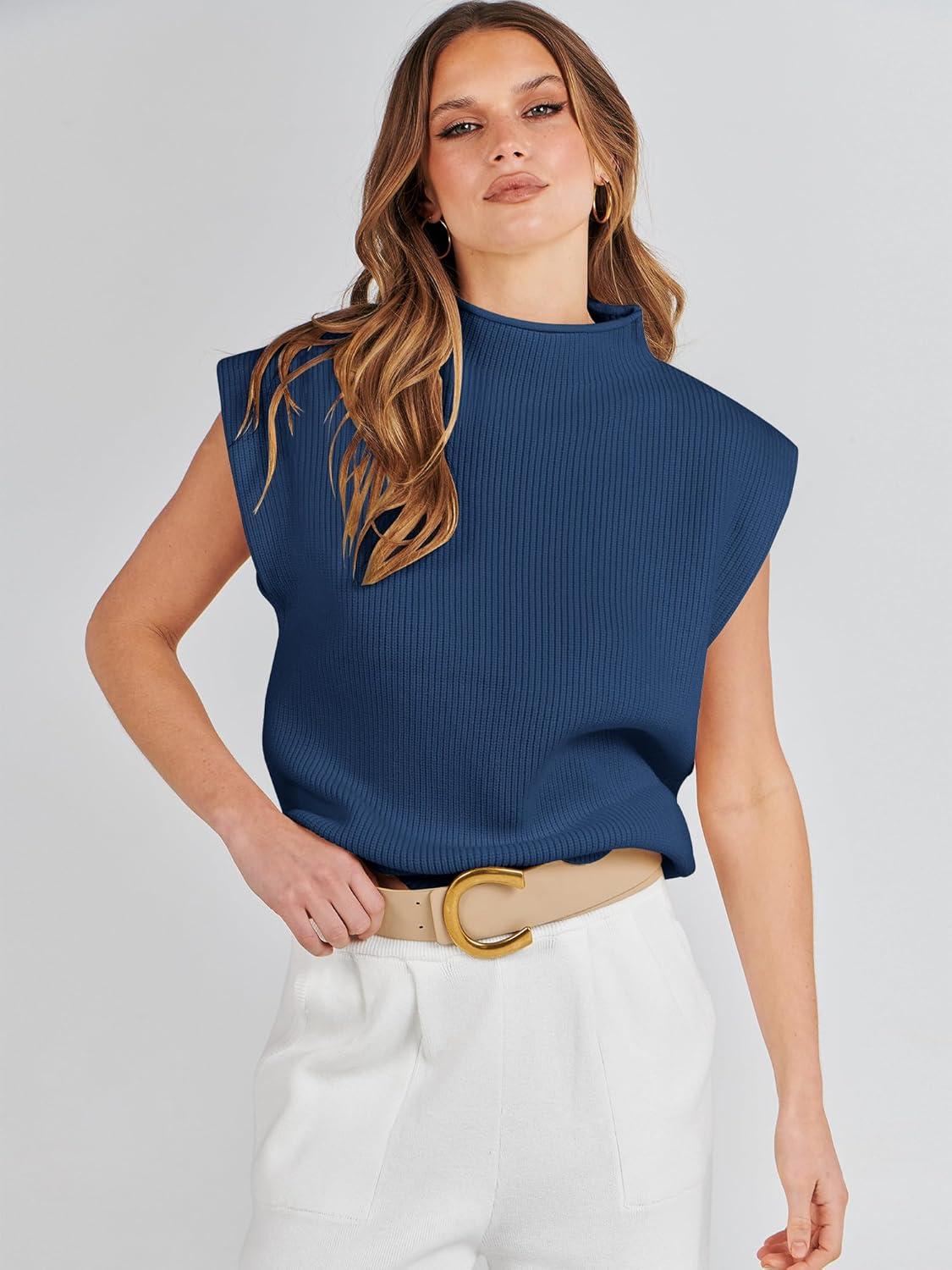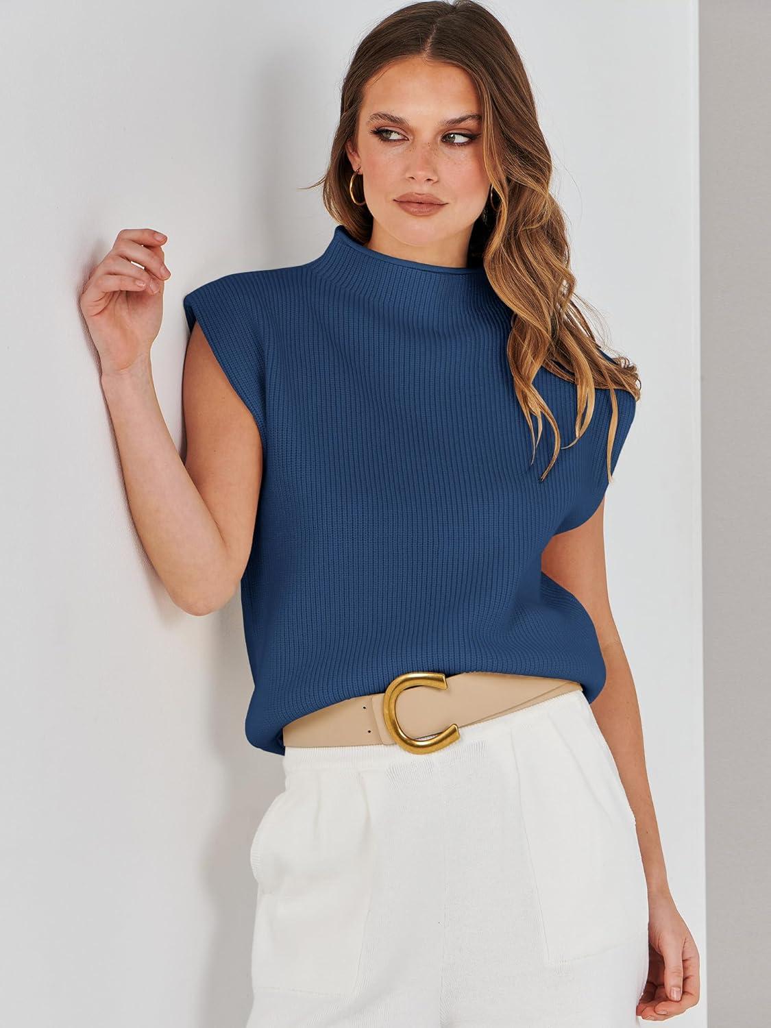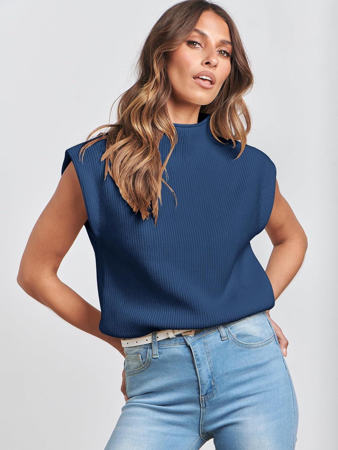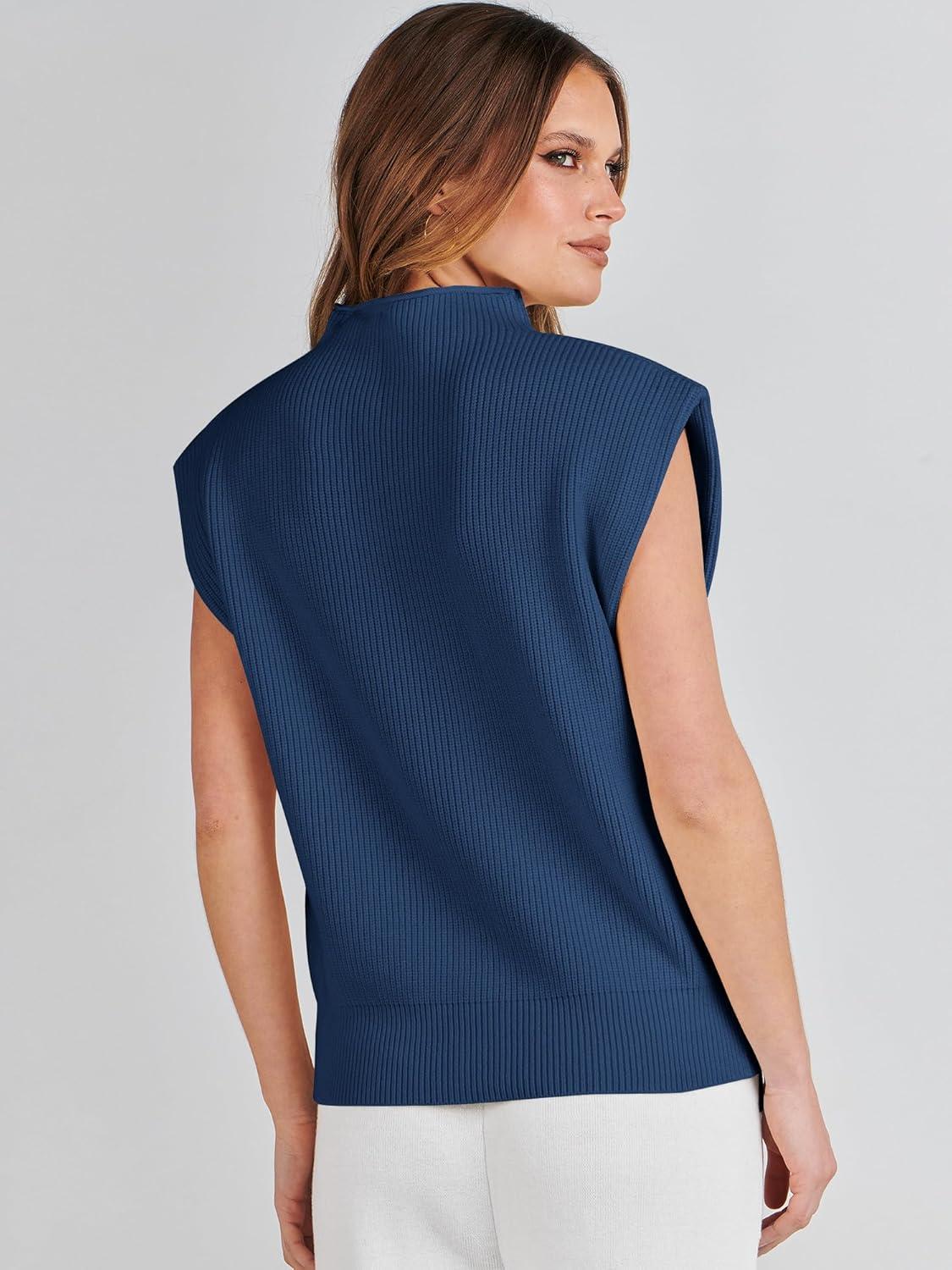 ANRABESS Women’s Mock Neck Sleeveless Sweater Vest Casual Cap Sleeve Knit Pullover Tank Tops 2025 Fall Clothes(Dark Blue)