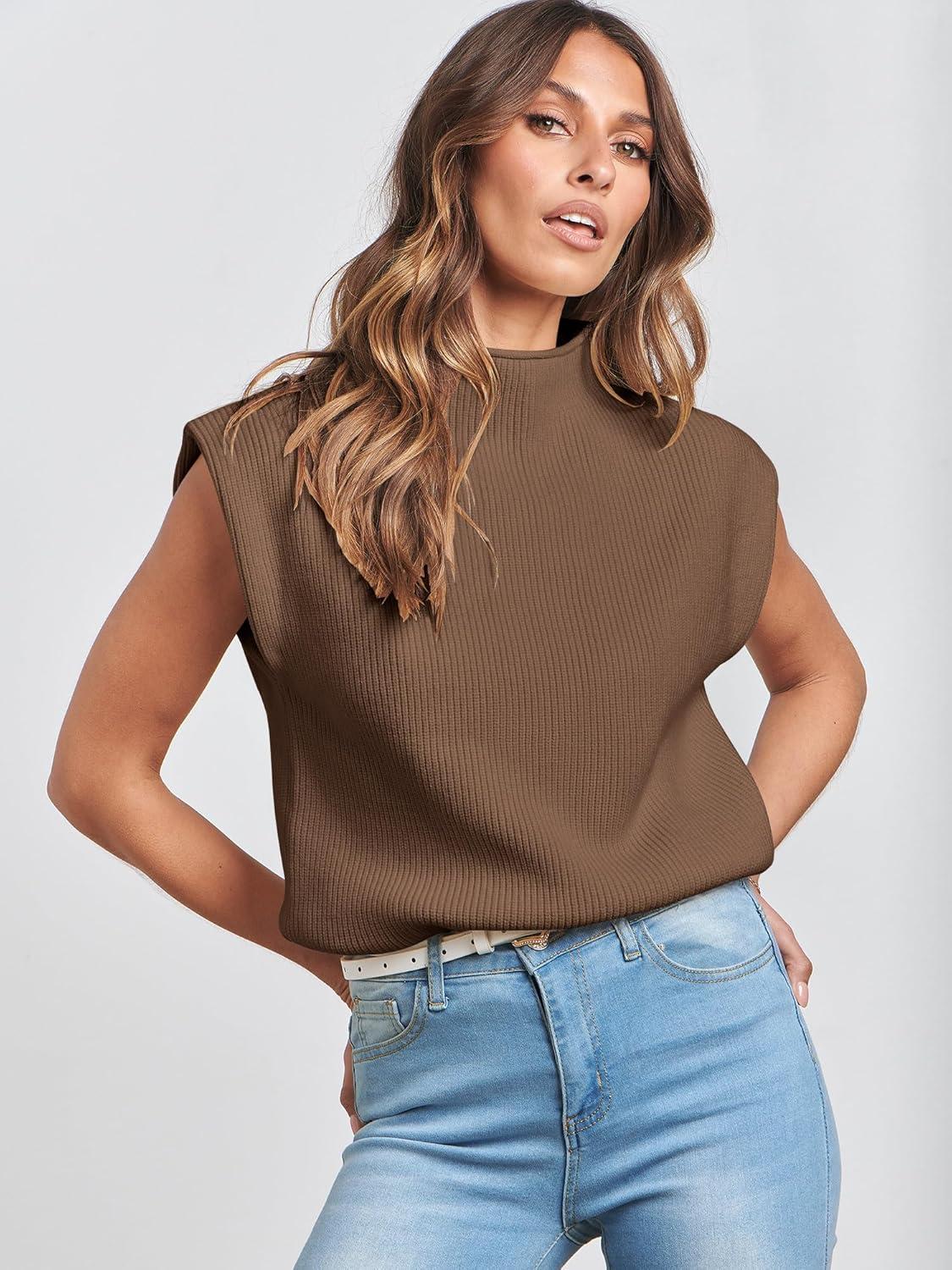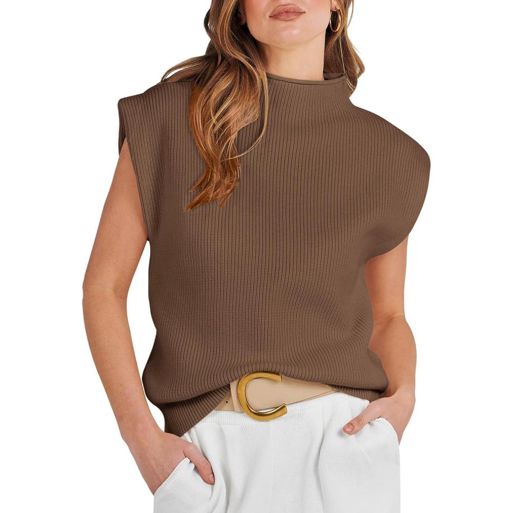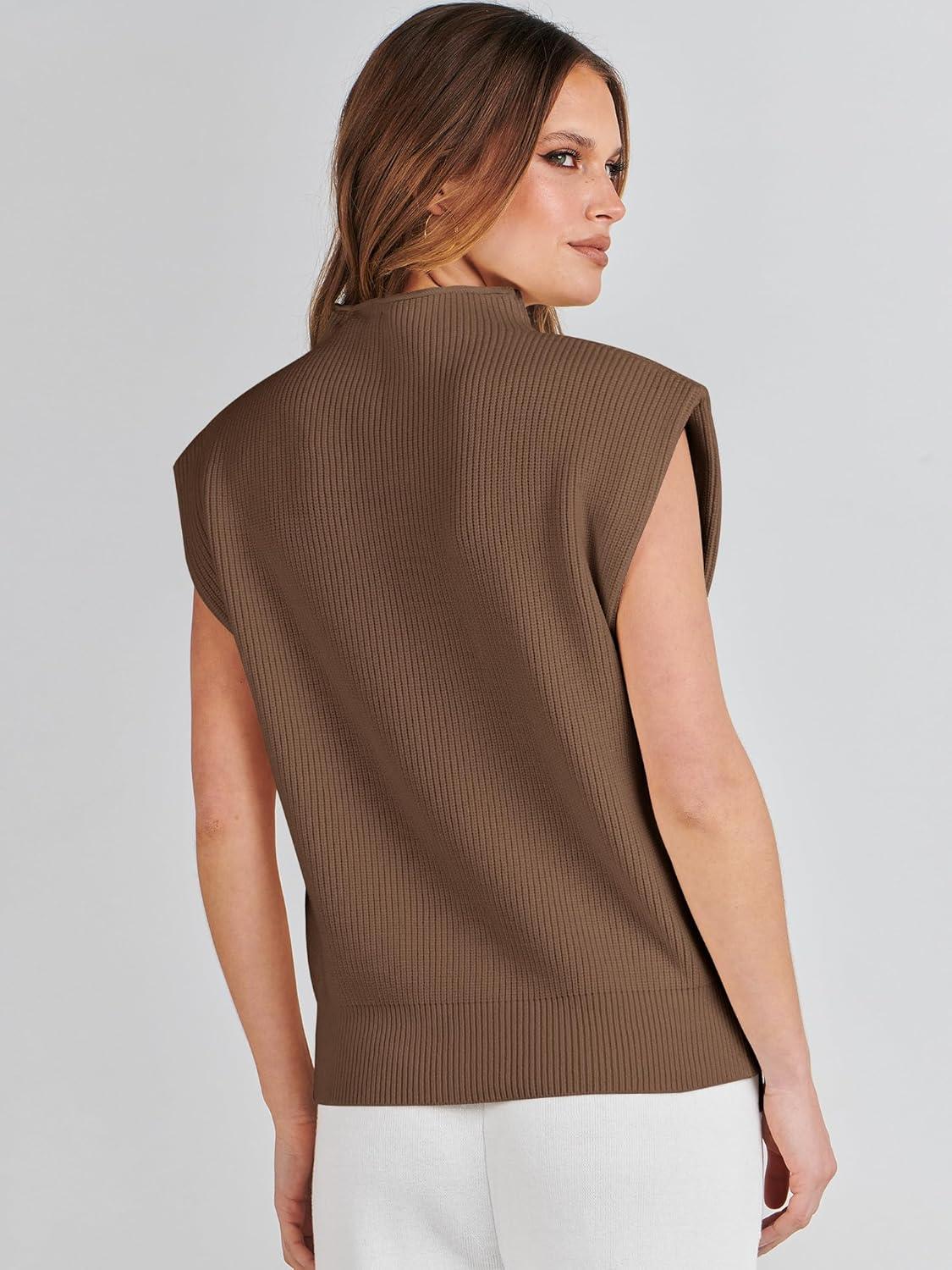 ANRABESS Women’s Mock Neck Sleeveless Sweater Vest Casual Cap Sleeve Knit Pullover Tank Tops 2025 Fall Clothes(Deep Brown)