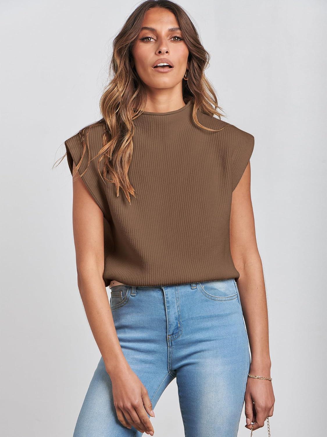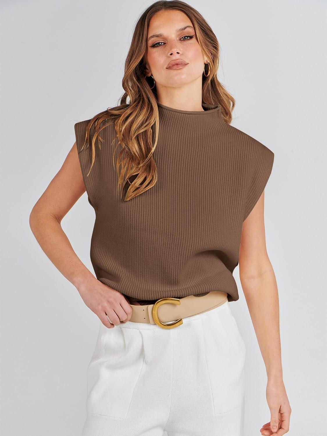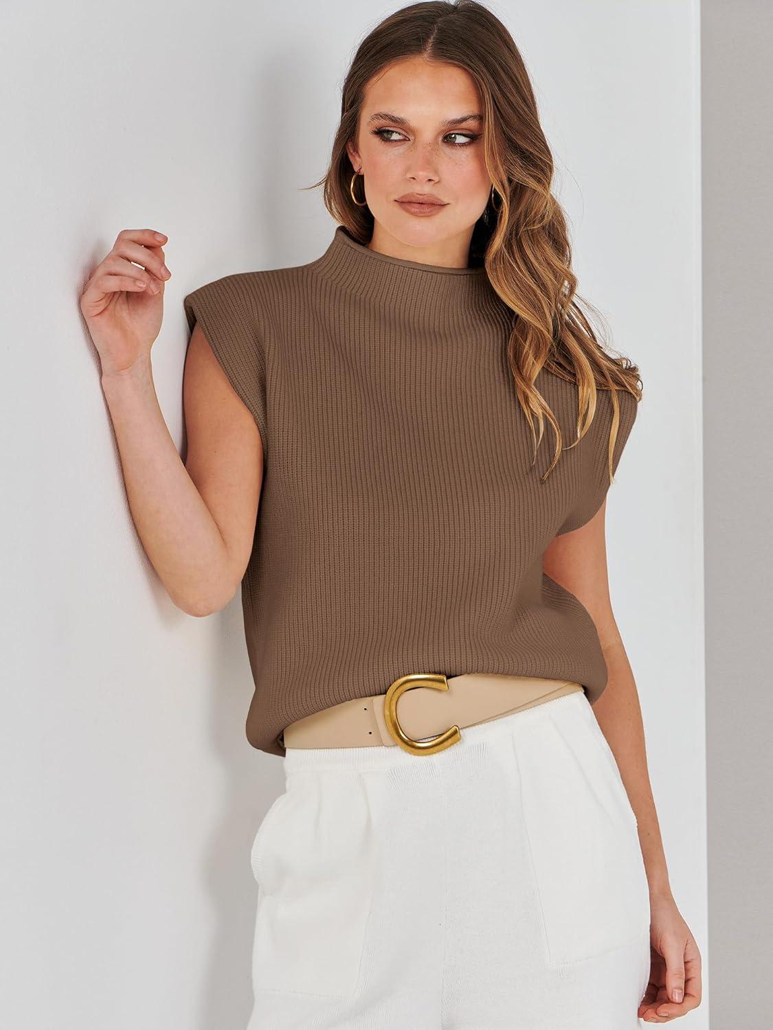 ANRABESS Women’s Mock Neck Sleeveless Sweater Vest Casual Cap Sleeve Knit Pullover Tank Tops 2025 Fall Clothes(Deep Brown)