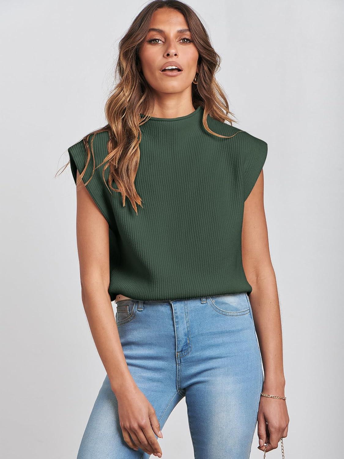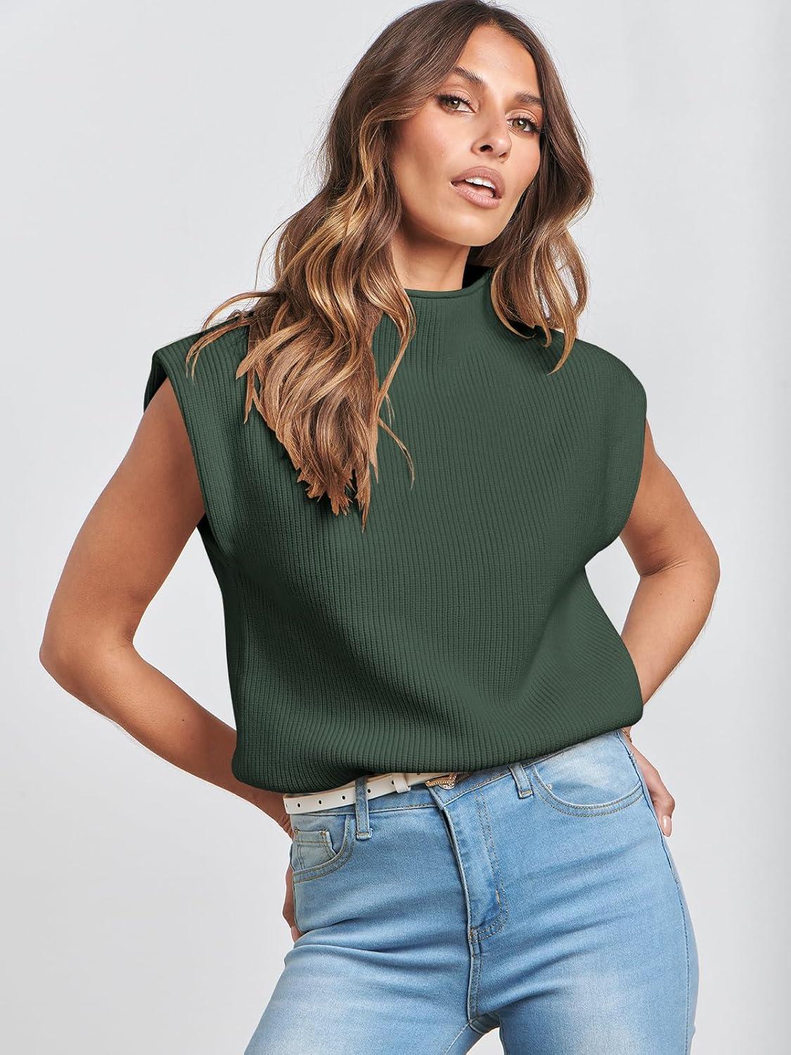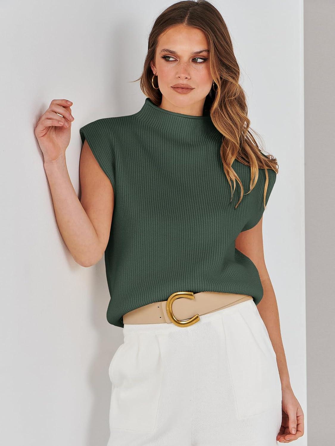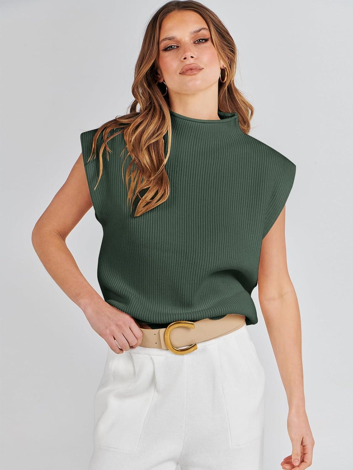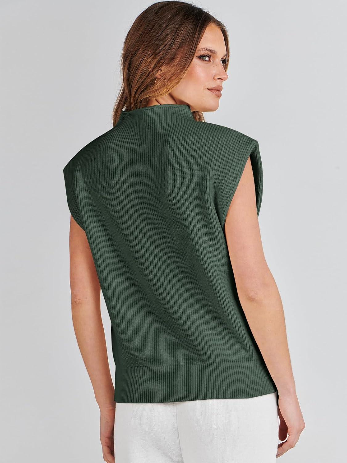 ANRABESS Women’s Mock Neck Sleeveless Sweater Vest Casual Cap Sleeve Knit Pullover Tank Tops 2025 Fall Clothes(Green)