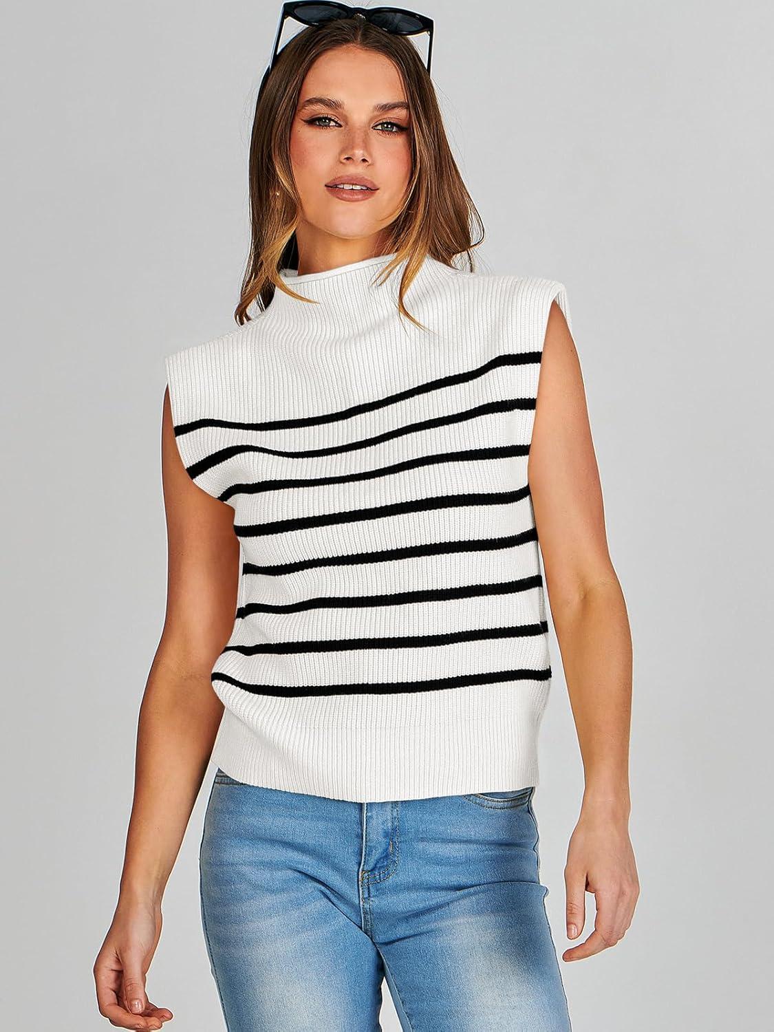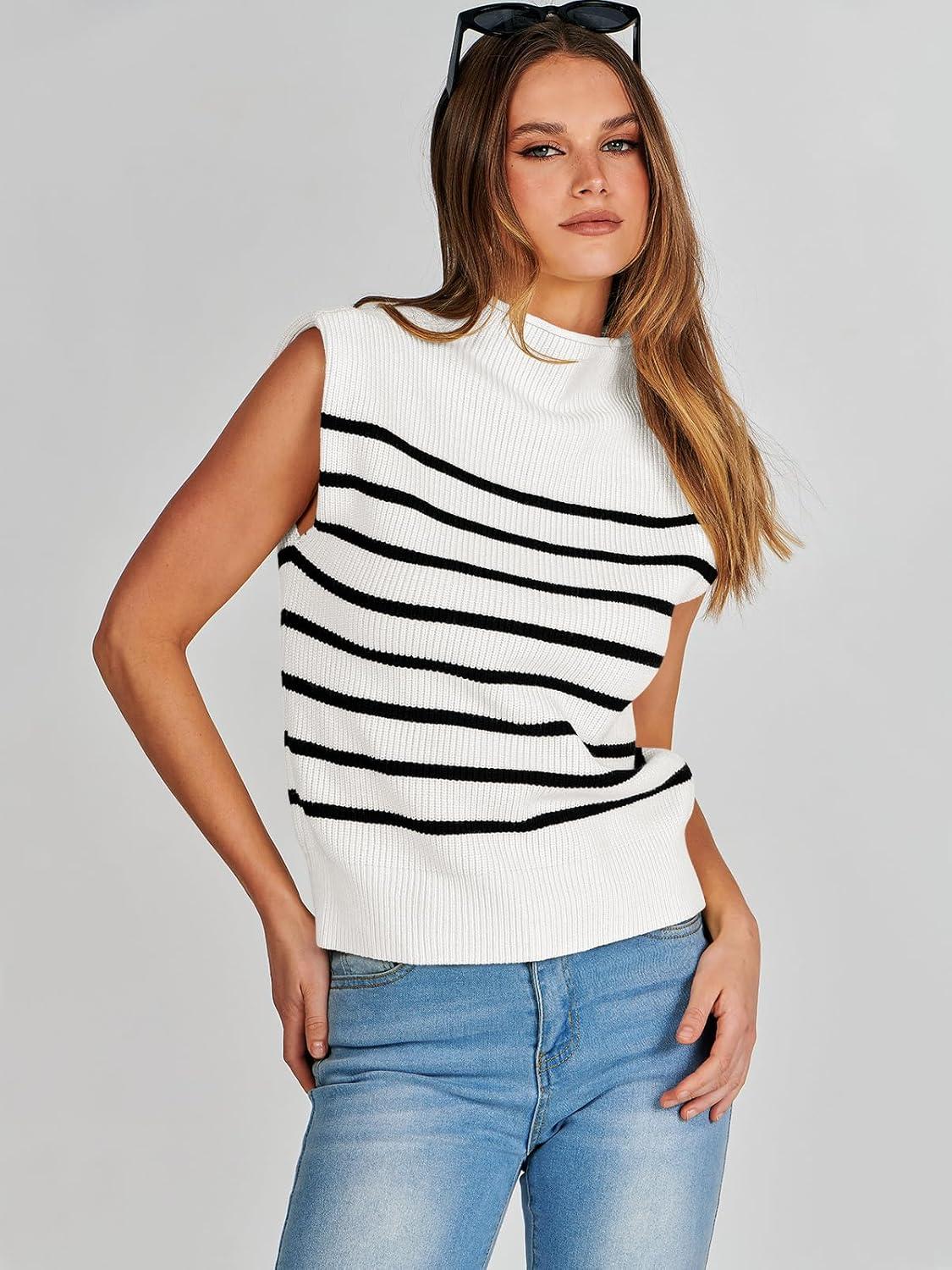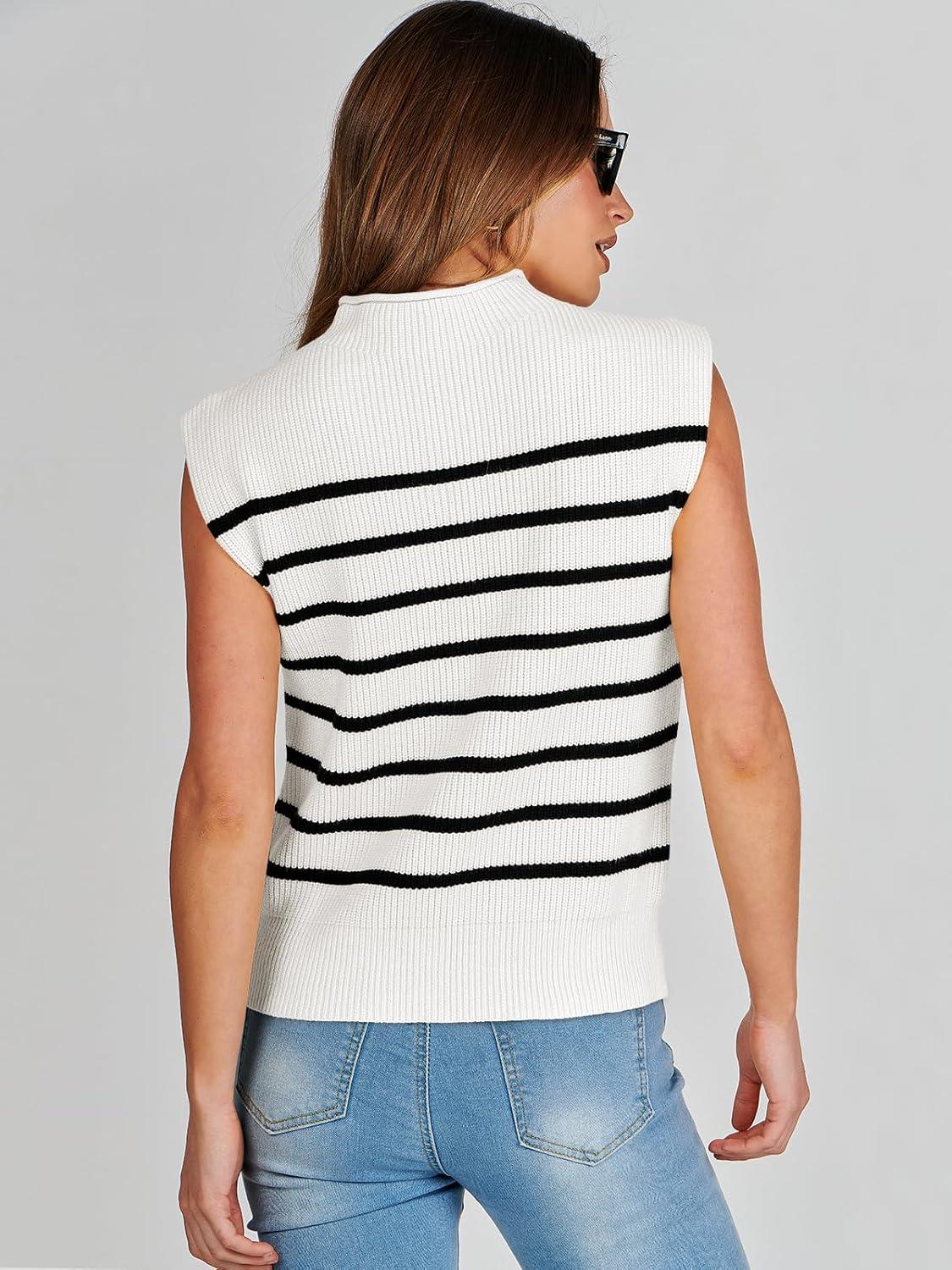 ANRABESS Women’s Mock Neck Sleeveless Sweater Vest Casual Cap Sleeve Knit Pullover Tank Tops 2025 Fall Clothes(Strip White)