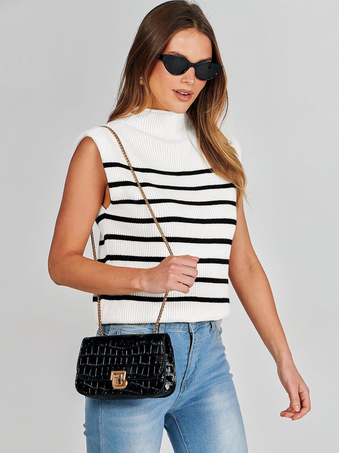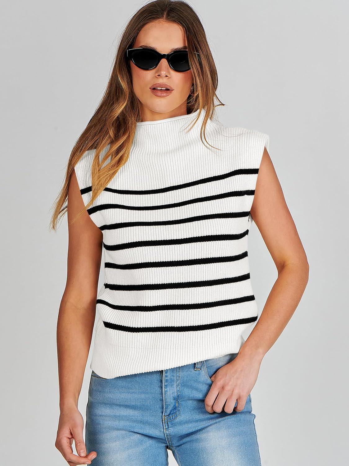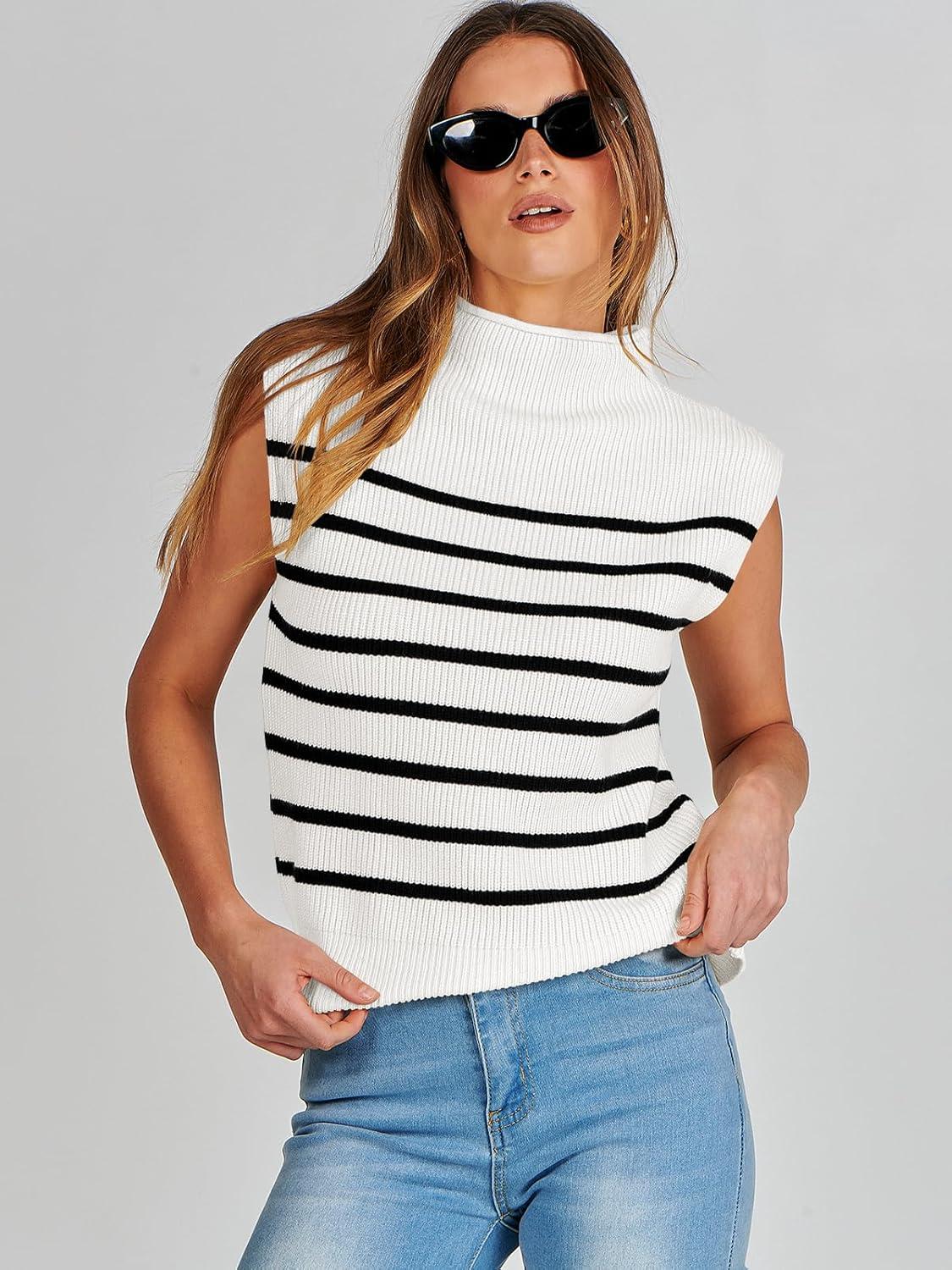 ANRABESS Women’s Mock Neck Sleeveless Sweater Vest Casual Cap Sleeve Knit Pullover Tank Tops 2025 Fall Clothes(Strip White)