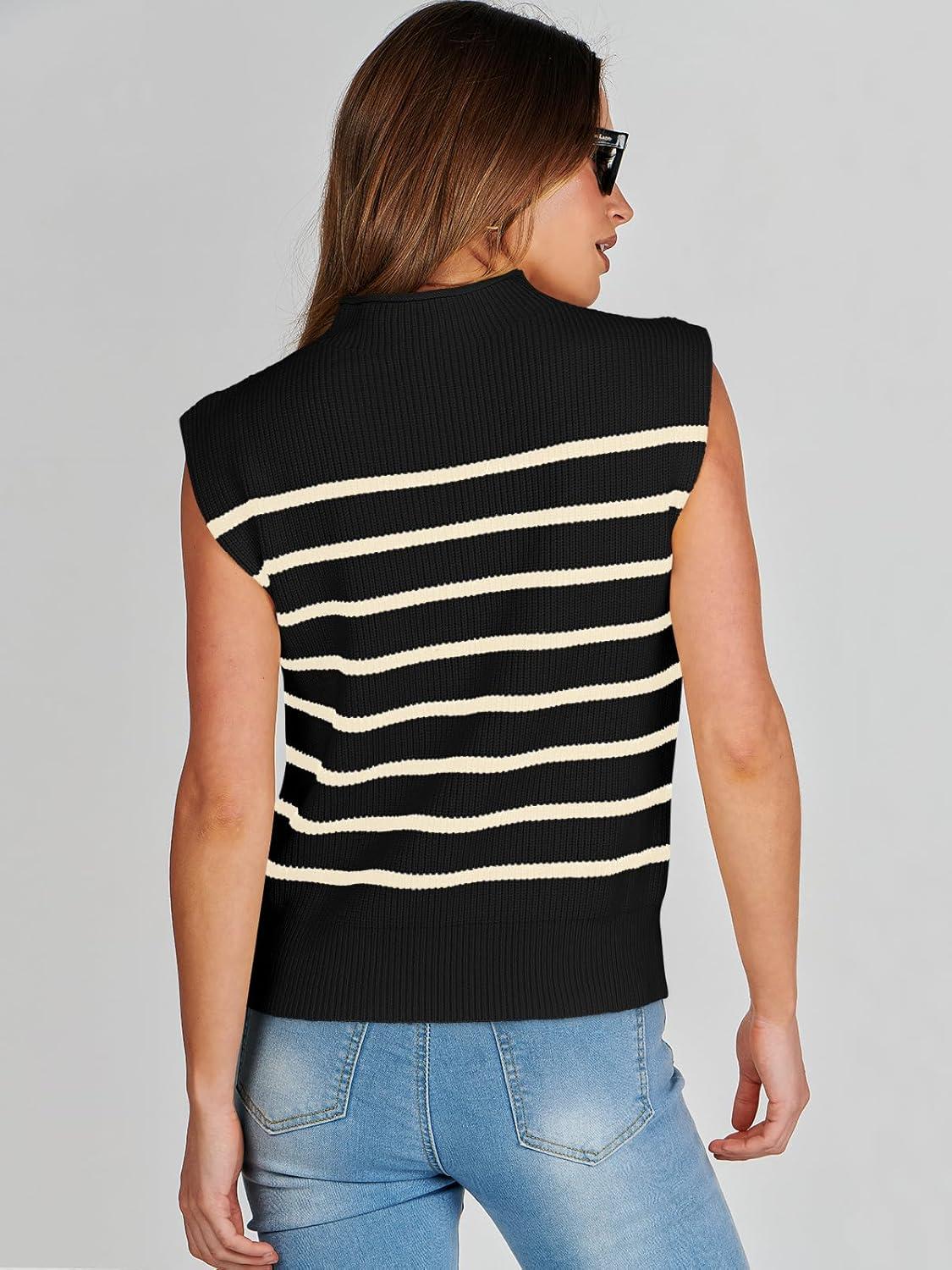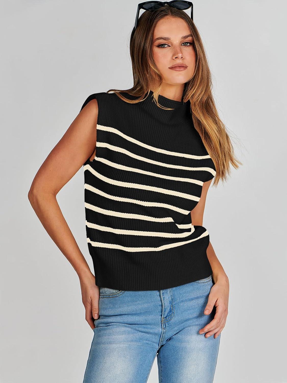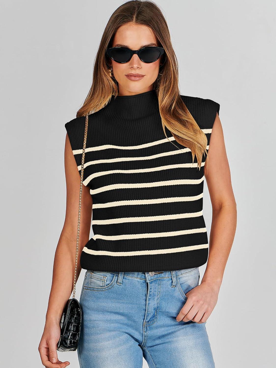 ANRABESS Women’s Mock Neck Sleeveless Sweater Vest Casual Cap Sleeve Knit Pullover Tank Tops 2025 Fall Clothes(Stripe Black)