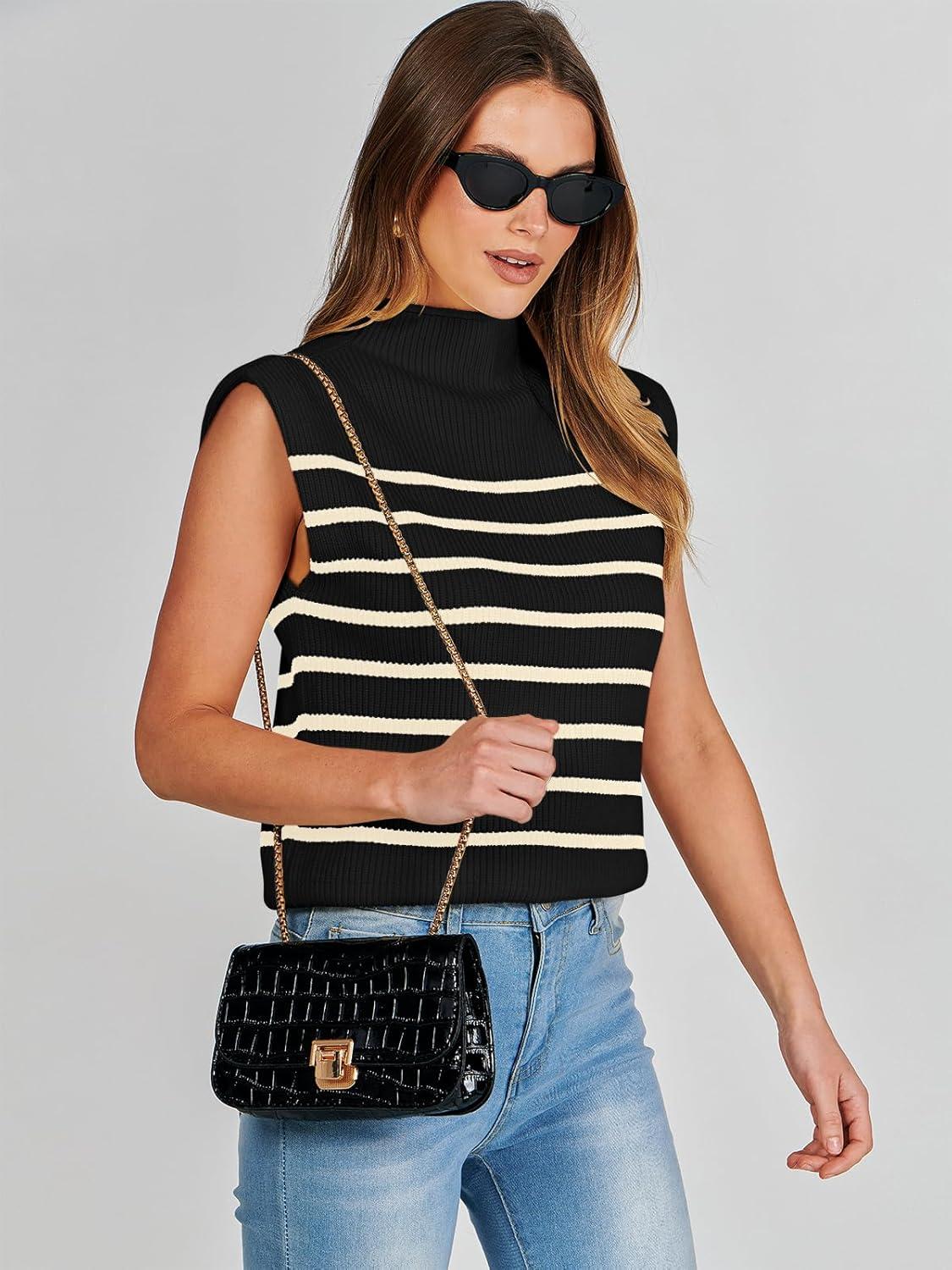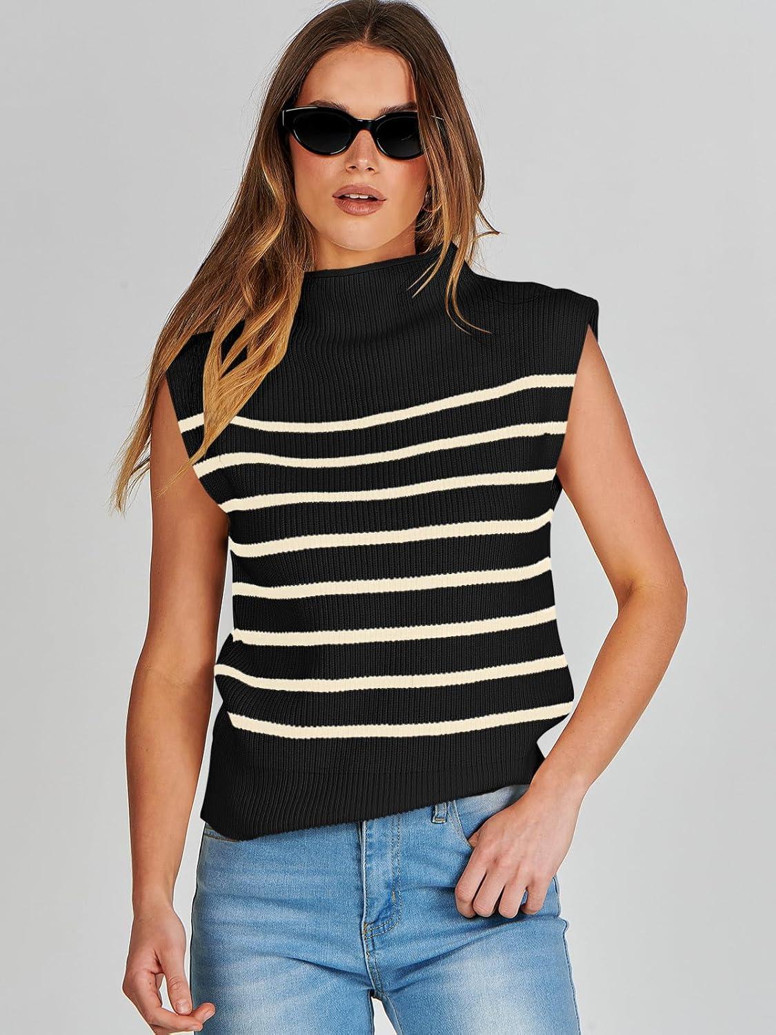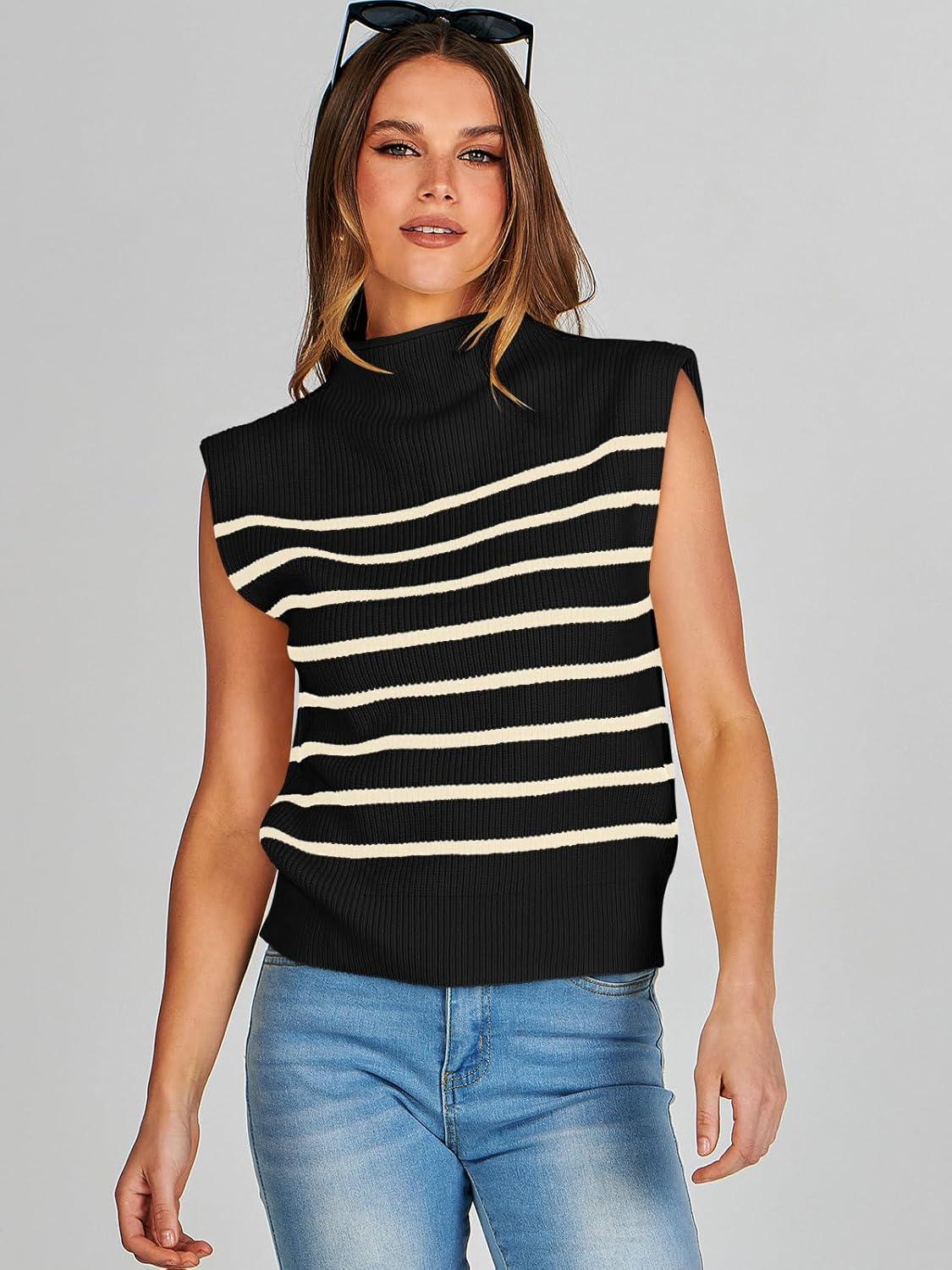 ANRABESS Women’s Mock Neck Sleeveless Sweater Vest Casual Cap Sleeve Knit Pullover Tank Tops 2025 Fall Clothes(Stripe Black)