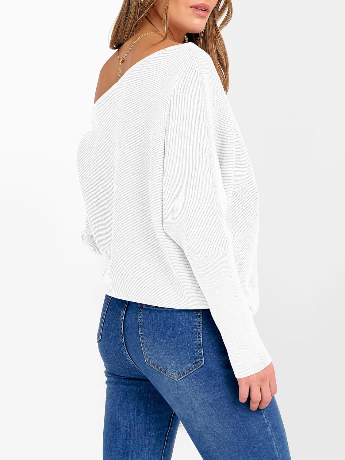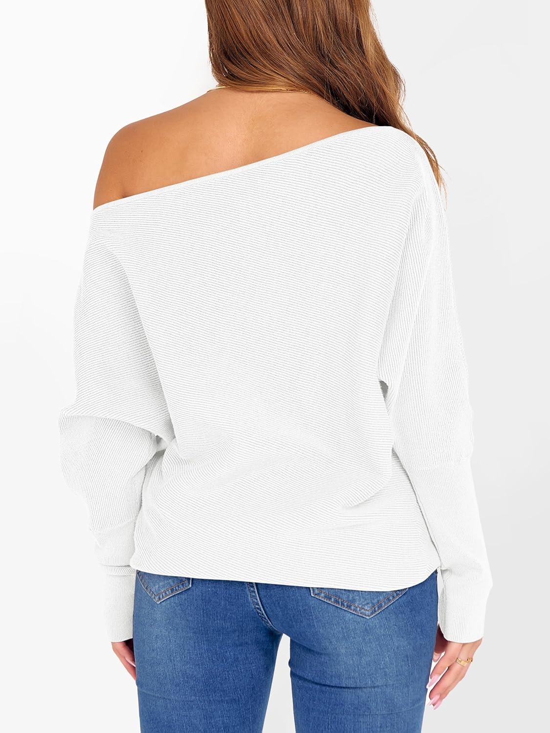 ANRABESS Womens Off Shoulder Sweaters 2025 Fall Long Batwing Sleeve Loose Fit Knit Tops Casual Pullovers Jumpers(White)