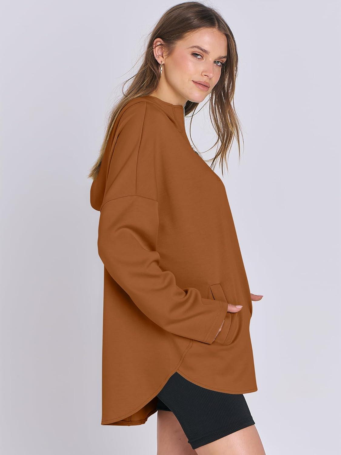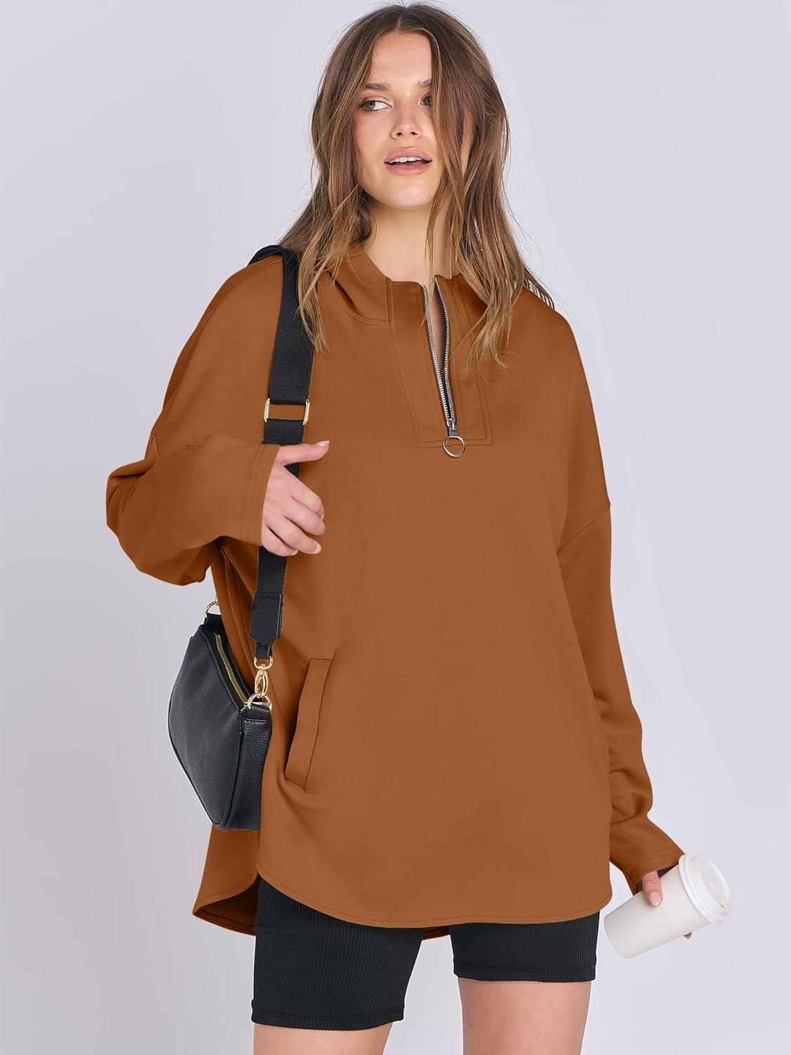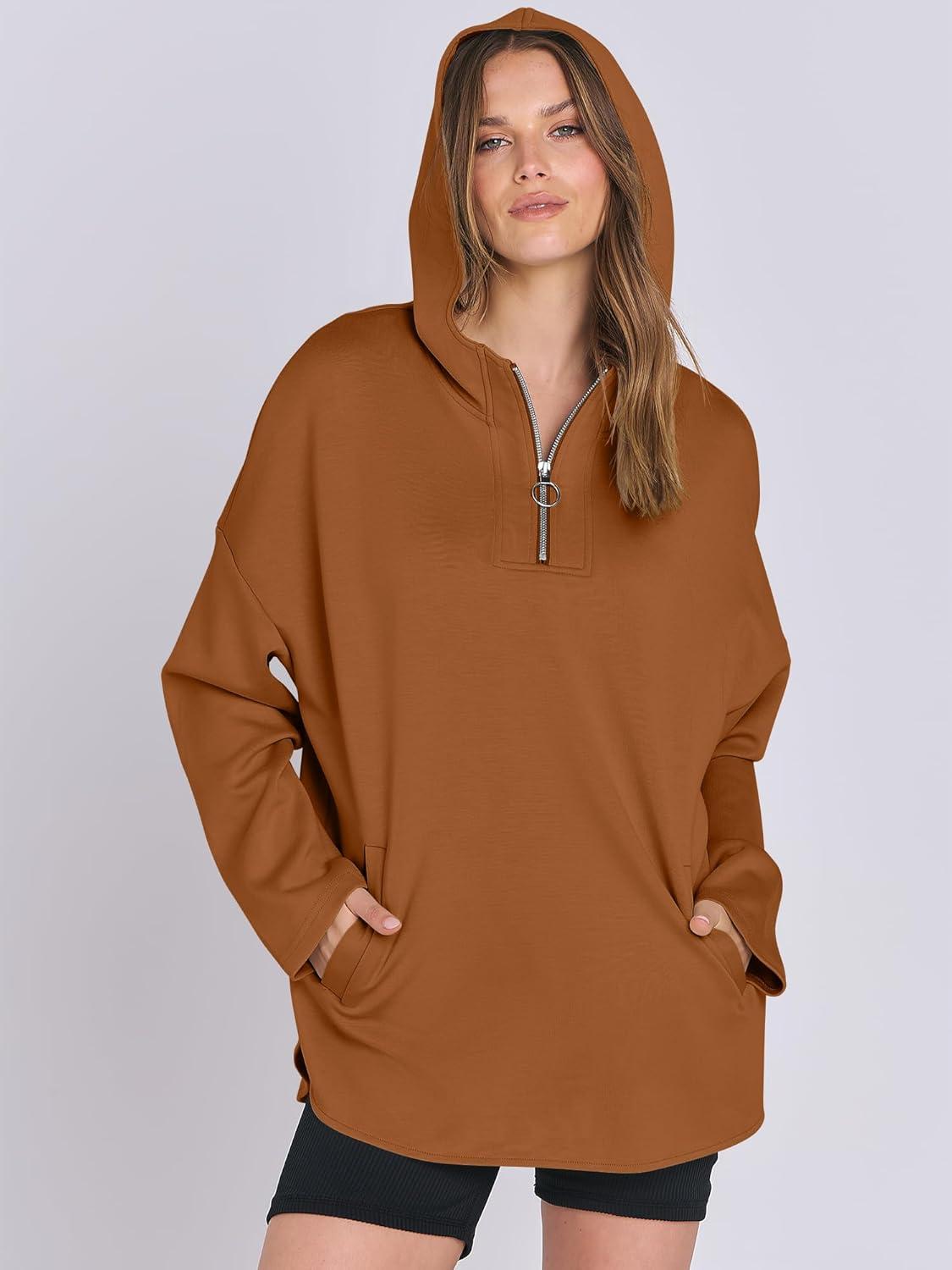 ANRABESS Womens Oversized Hoodie Quarter Zip Sweatshirts 2025 Fall Winter Tunic Pullover Top Trendy Teen Girls Preppy Clothes(Caramel)