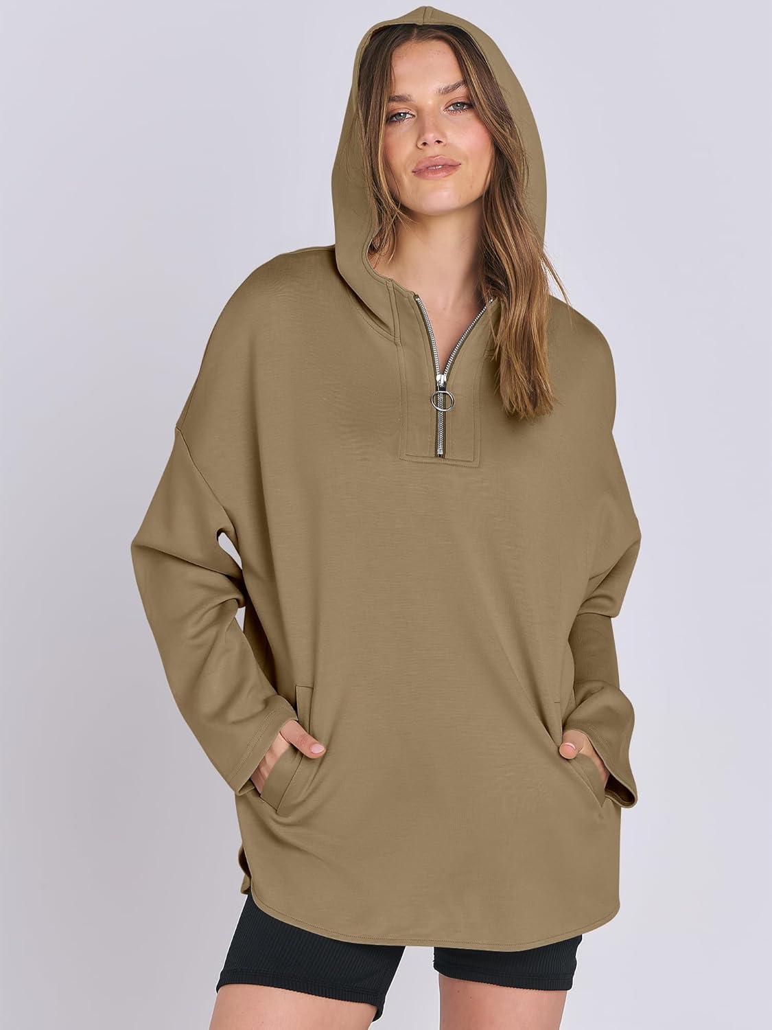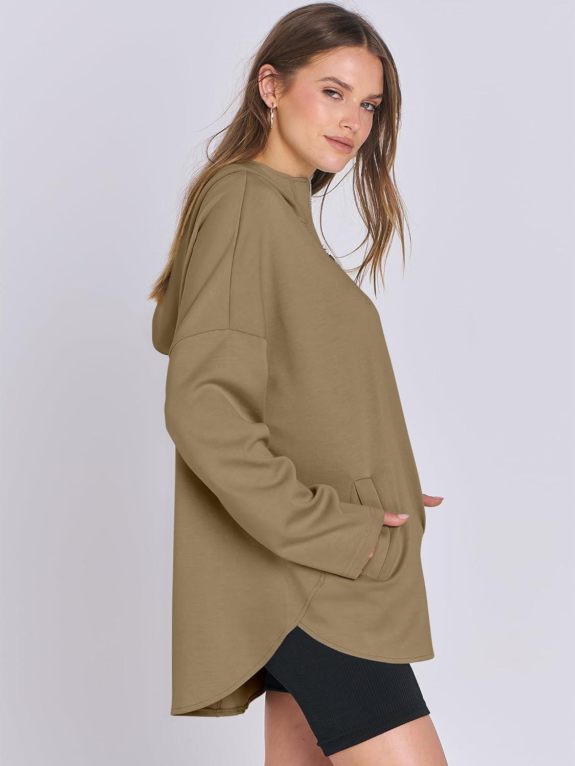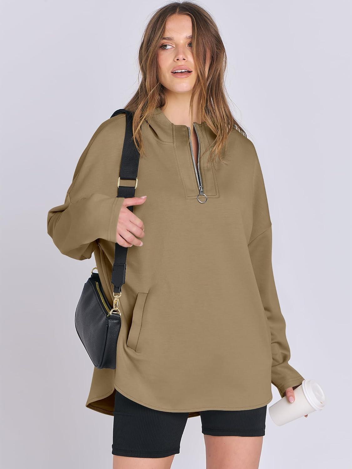 ANRABESS Womens Oversized Hoodie Quarter Zip Sweatshirts 2025 Fall Winter Tunic Pullover Top Trendy Teen Girls Preppy Clothes(Dark Khaki)