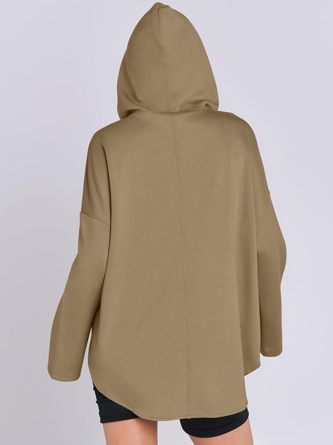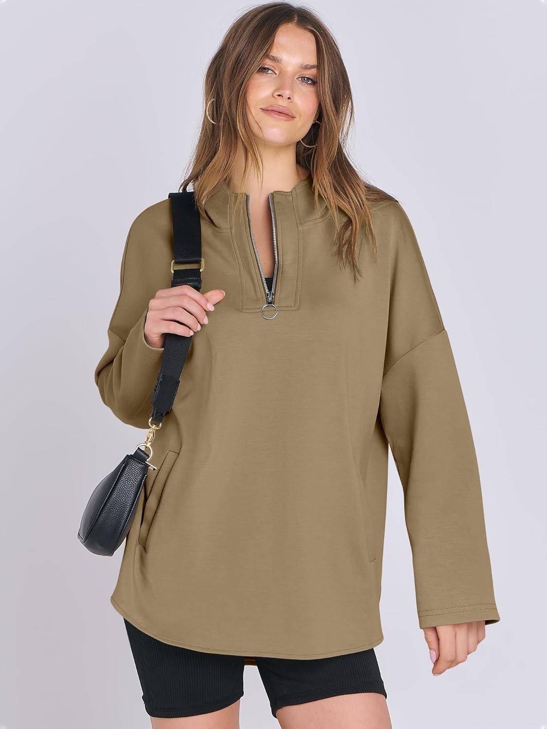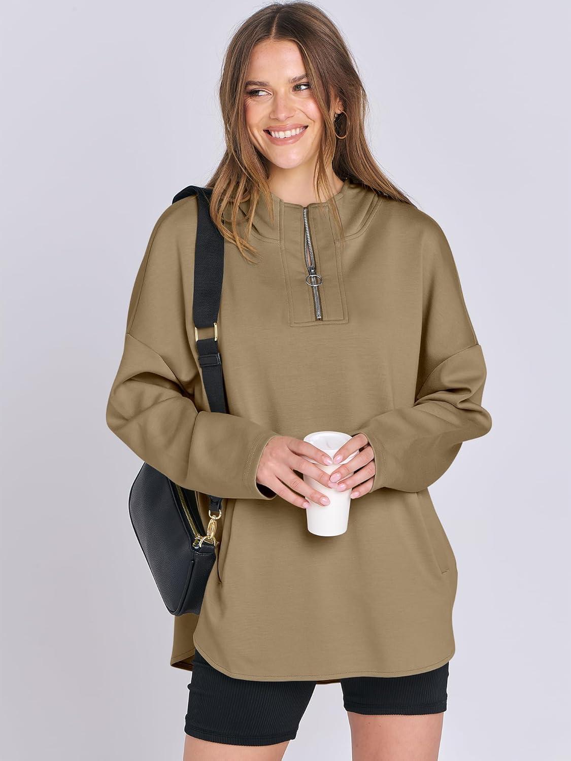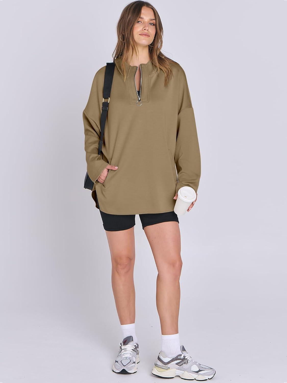 ANRABESS Womens Oversized Hoodie Quarter Zip Sweatshirts 2025 Fall Winter Tunic Pullover Top Trendy Teen Girls Preppy Clothes(Dark Khaki)