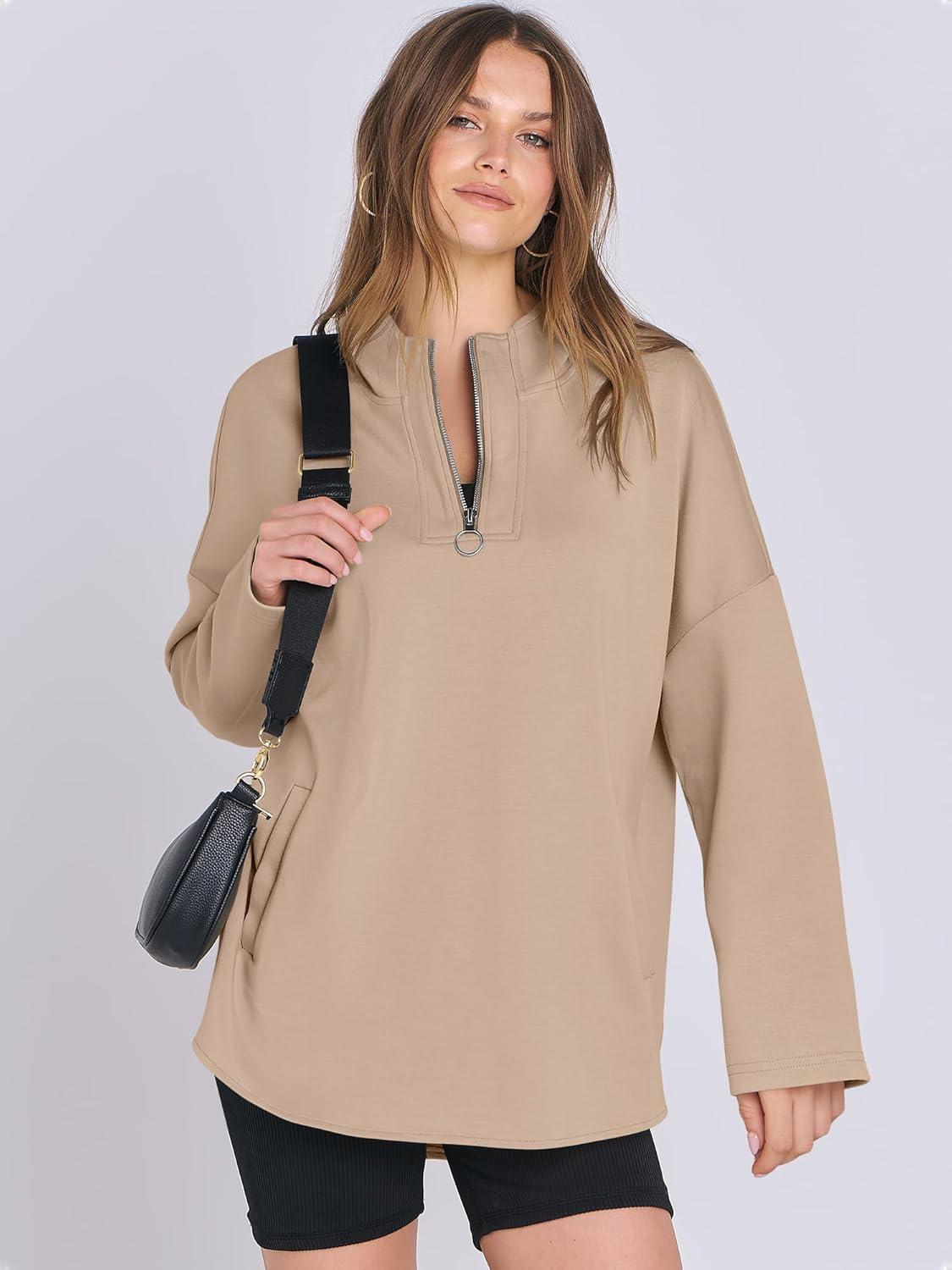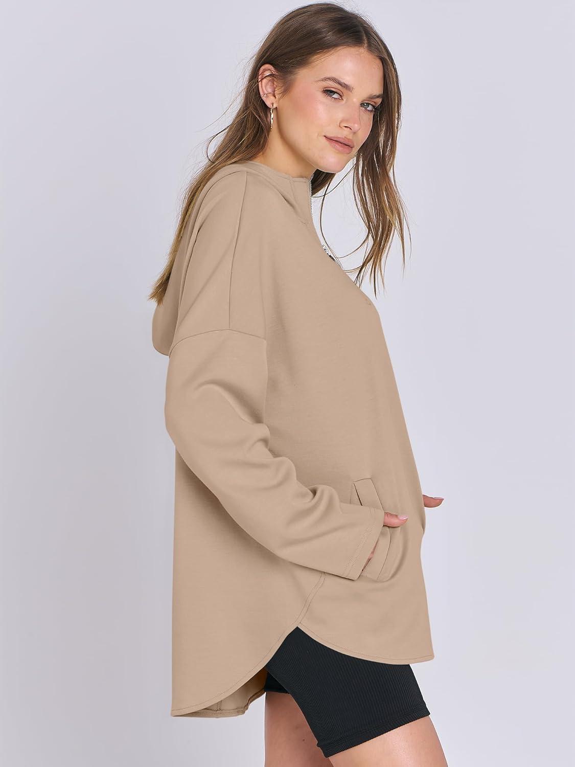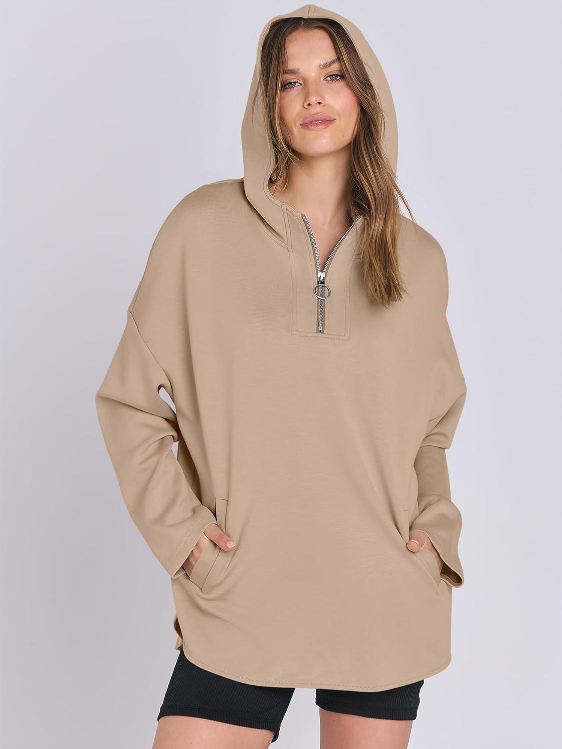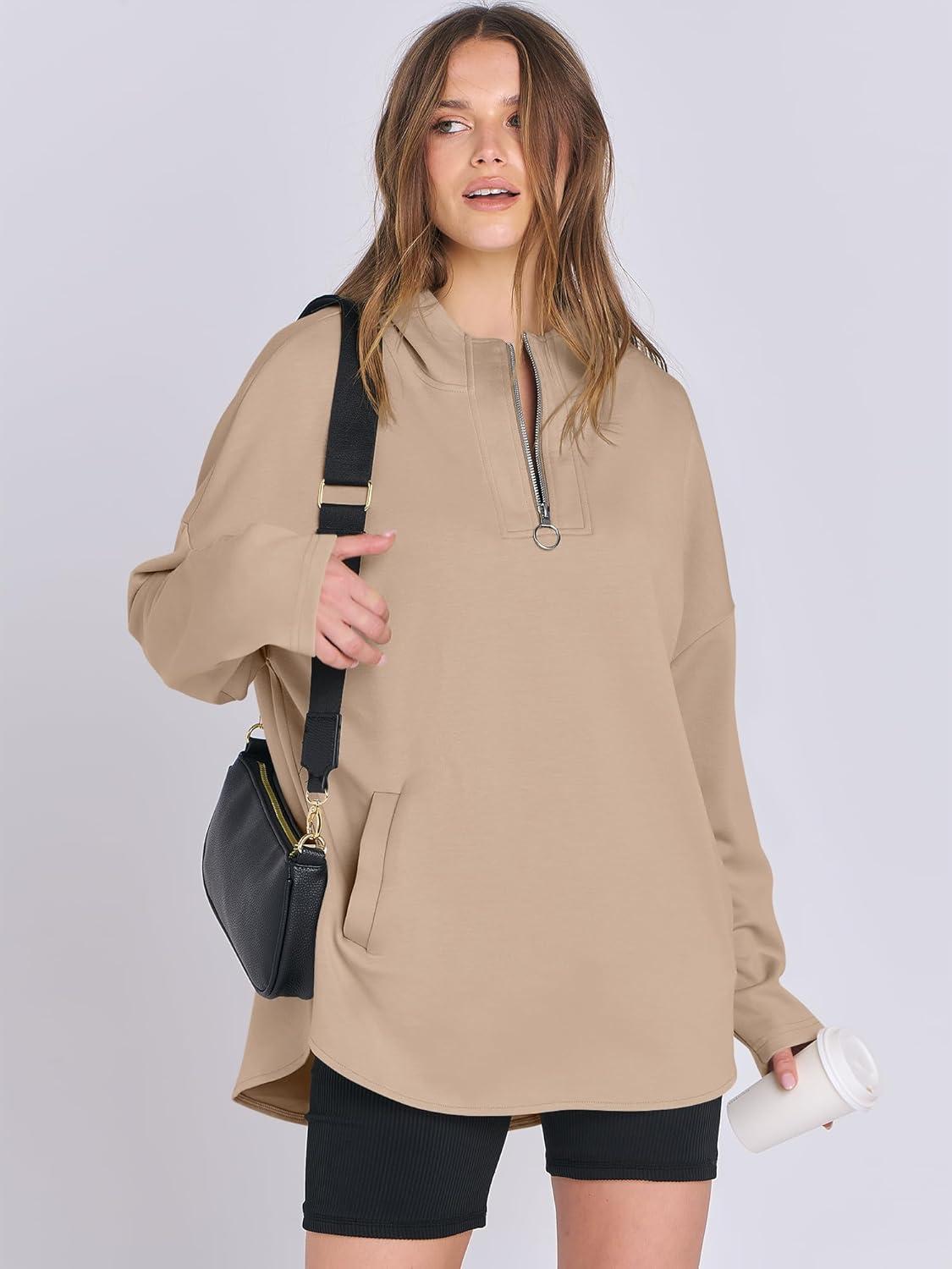 ANRABESS Womens Oversized Hoodie Quarter Zip Sweatshirts 2025 Fall Winter Tunic Pullover Top Trendy Teen Girls Preppy Clothes(Khaki)