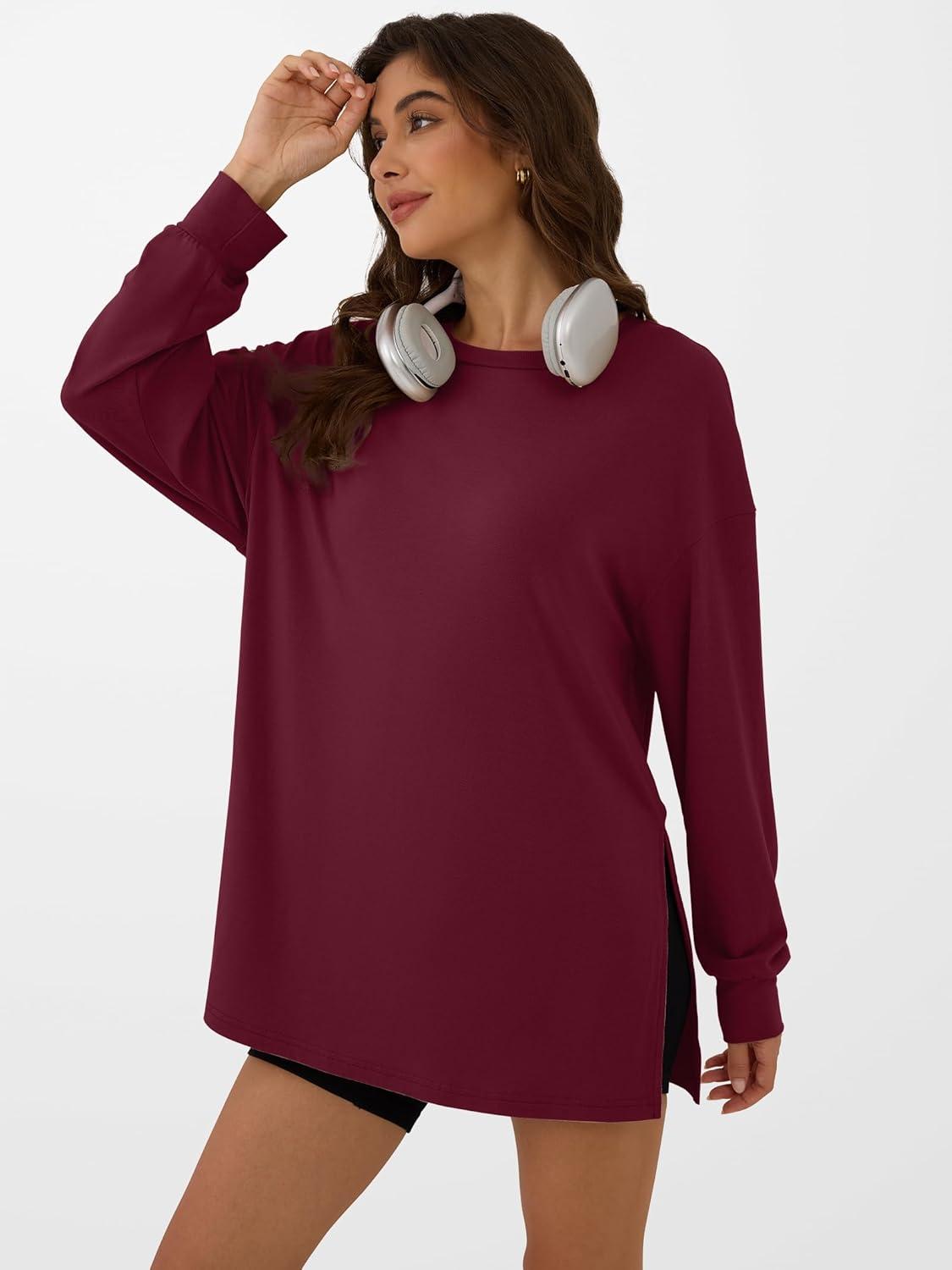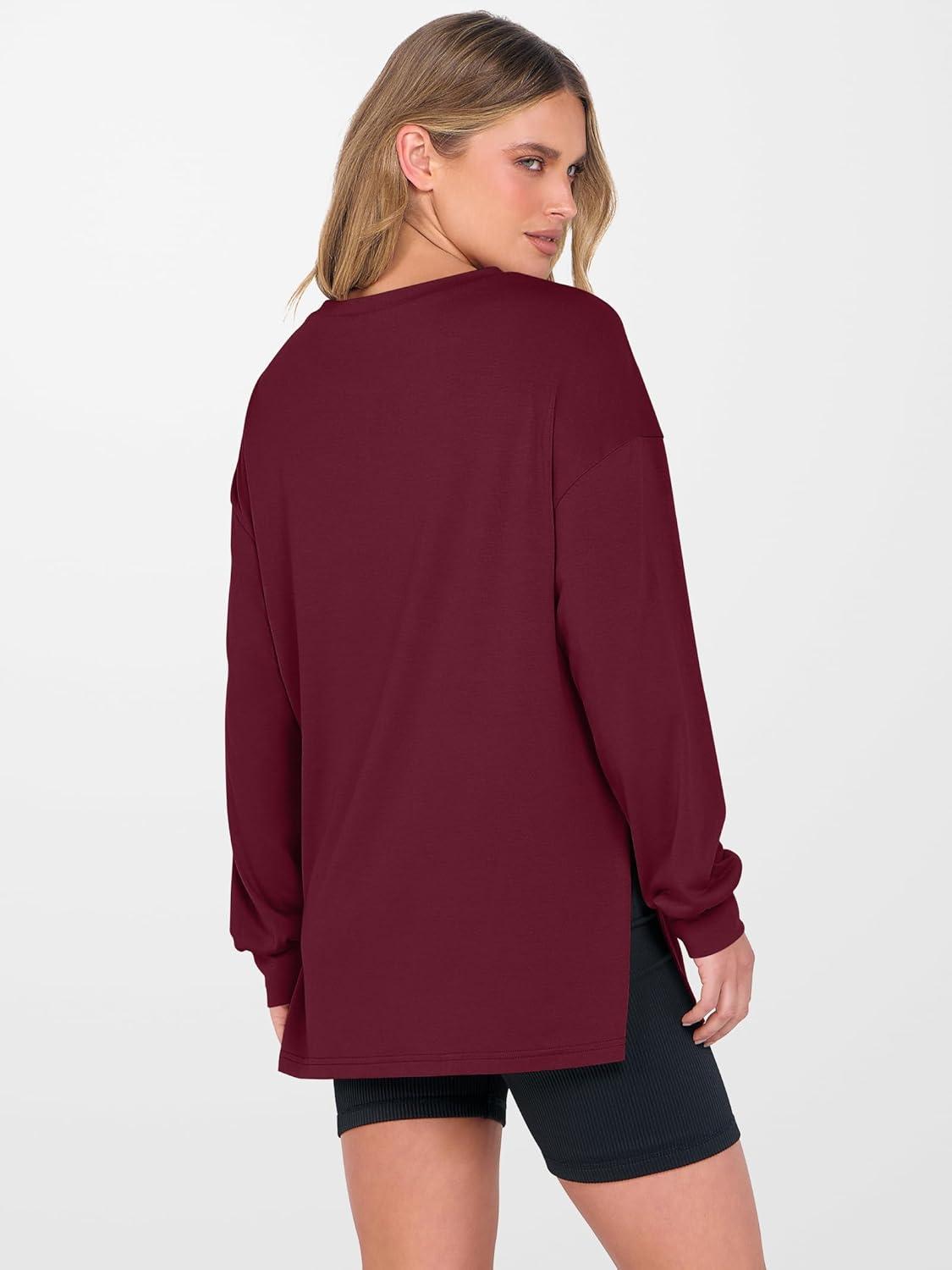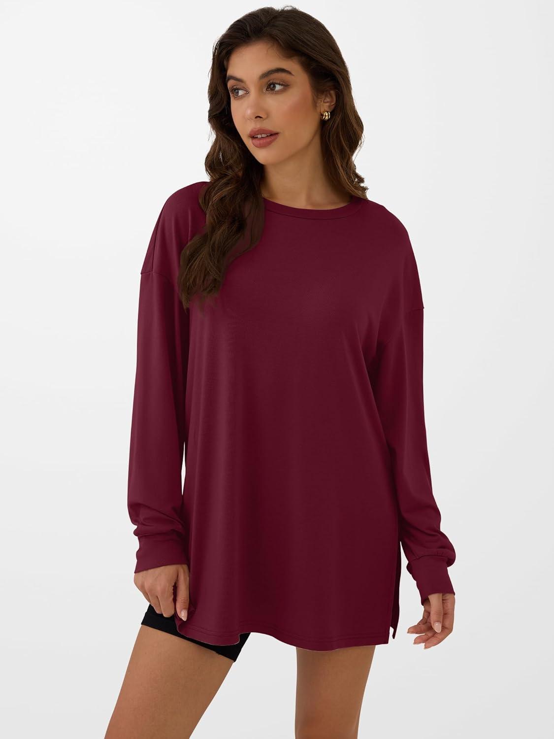 ANRABESS Women’s Oversized Long Sleeve shirts Fall Workout Tunic Tops Athletic Gym Tshirts Soft Basic Tees 2025 Outfits(Burgundy)