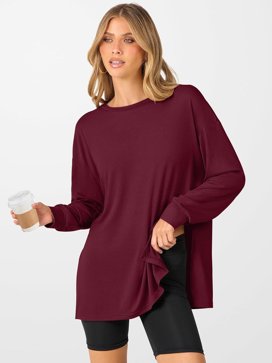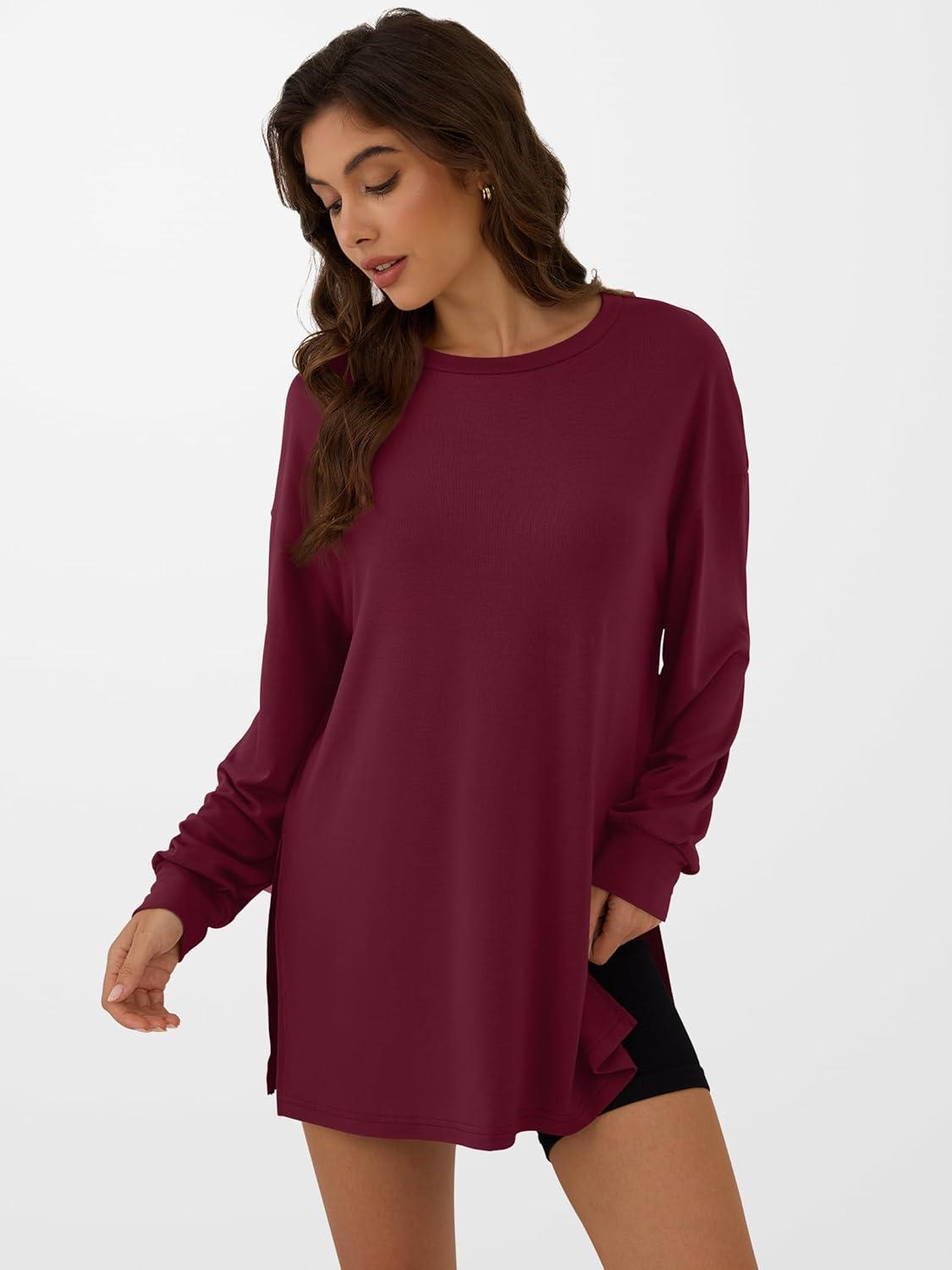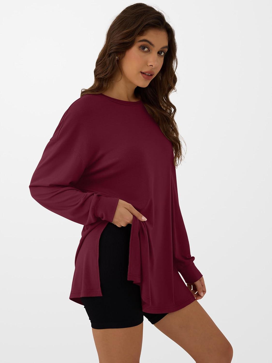 ANRABESS Women’s Oversized Long Sleeve shirts Fall Workout Tunic Tops Athletic Gym Tshirts Soft Basic Tees 2025 Outfits(Burgundy)