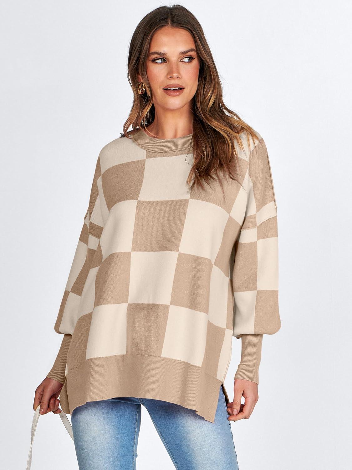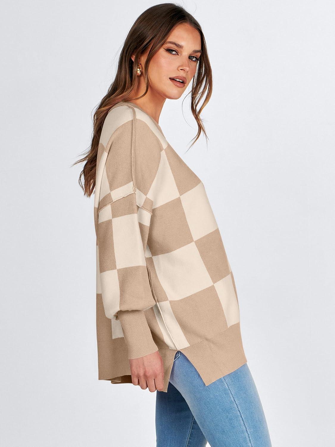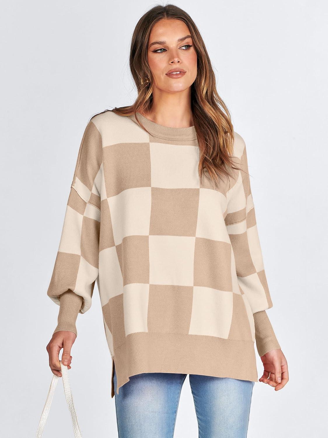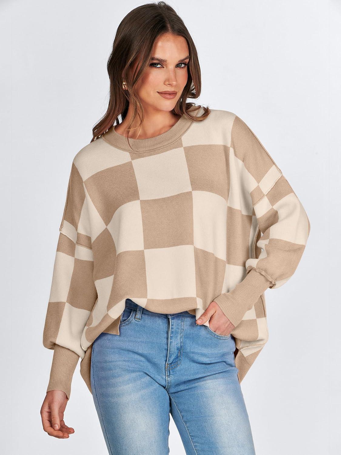 ANRABESS Womens Oversized Sweaters Fall 2025 Fashion Crewneck Batwing Long Sleeve Side Slit Knit Pullover Sweater Tops(Khaki Plaid)