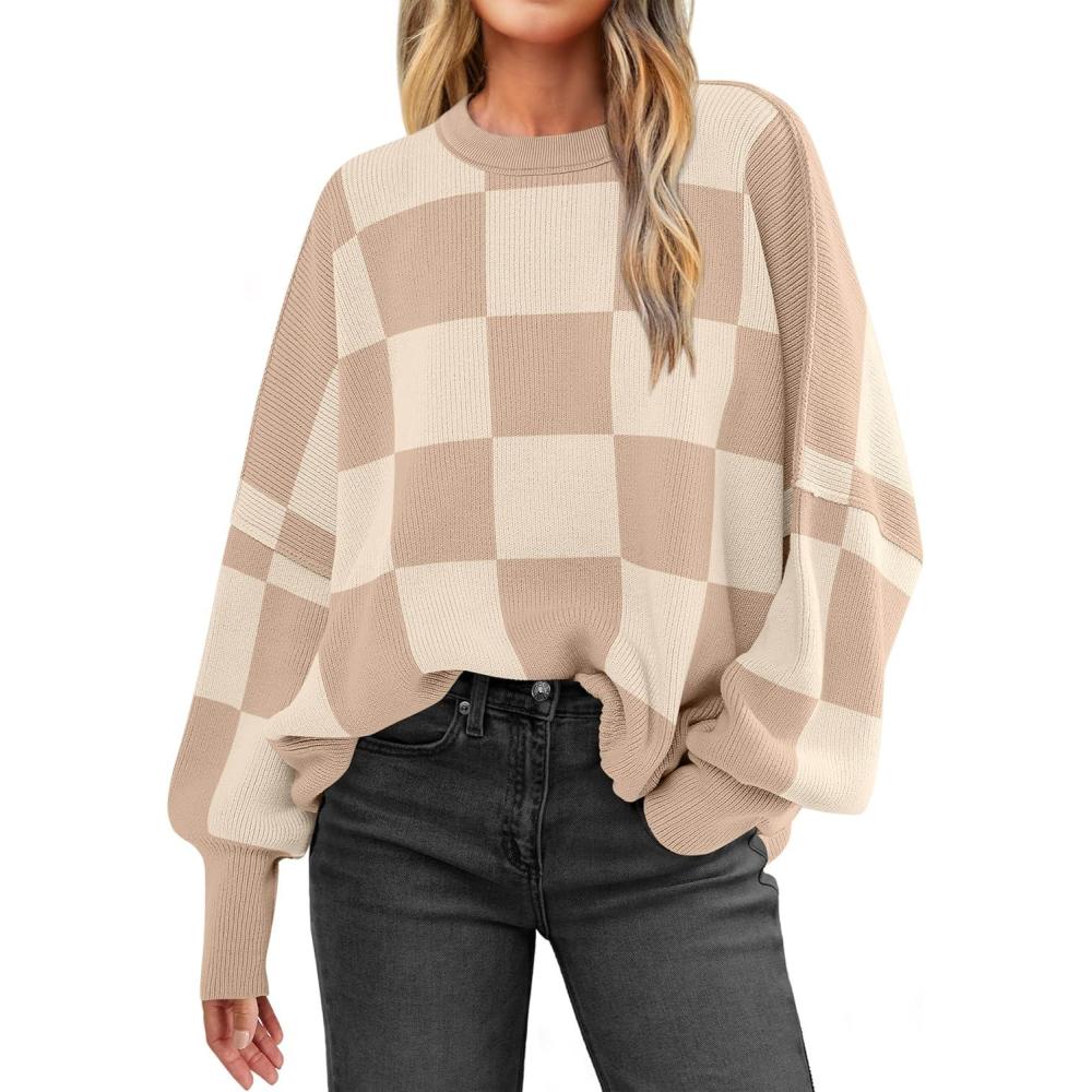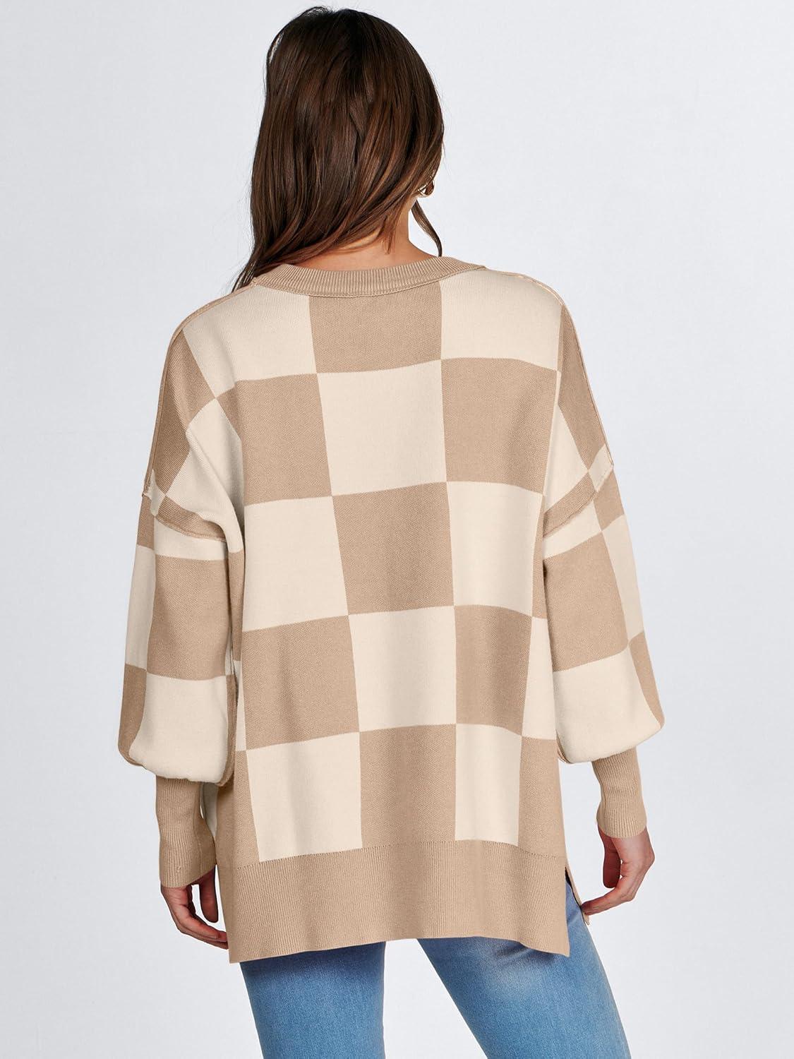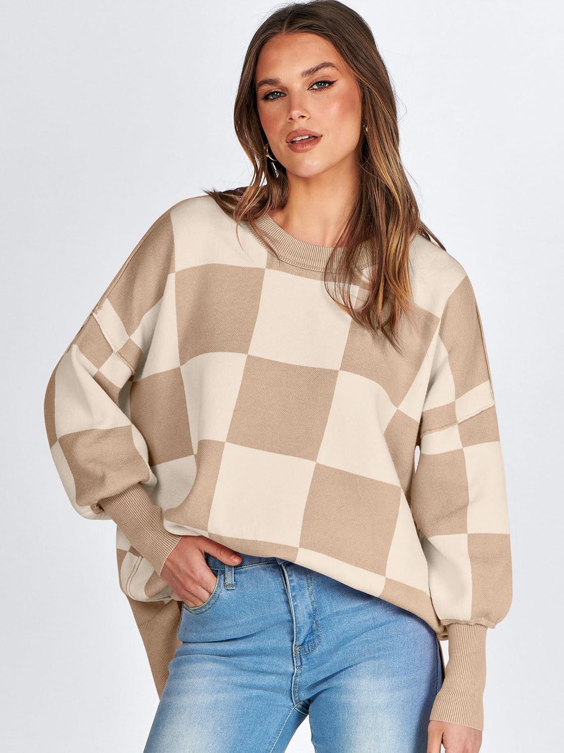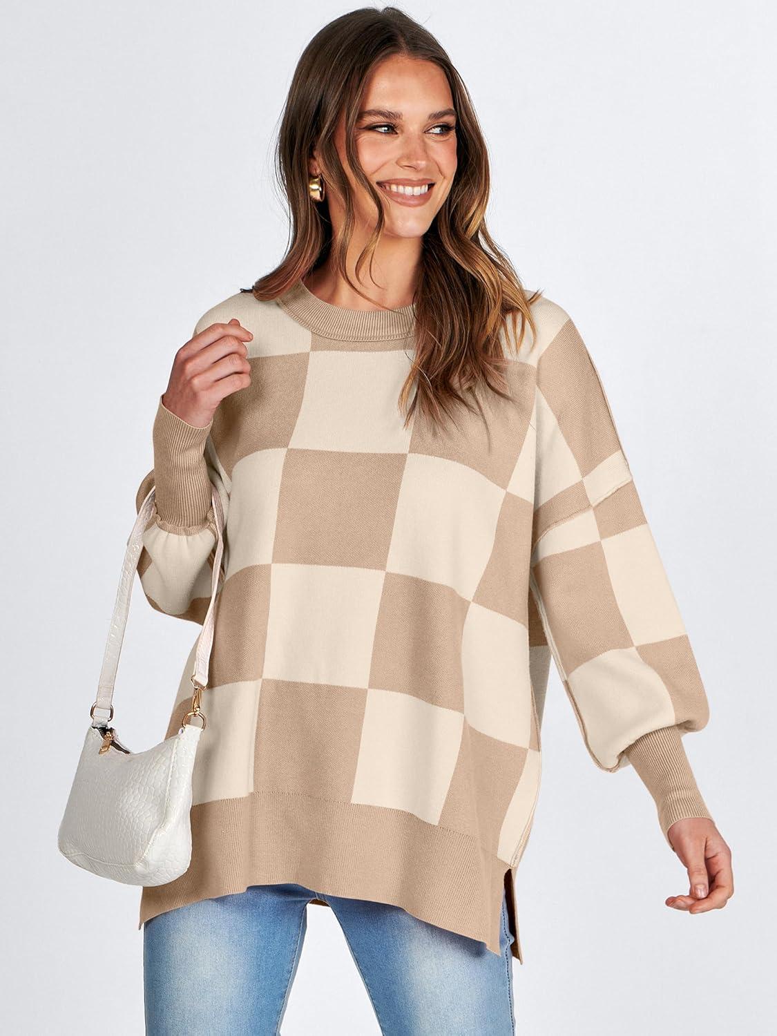 ANRABESS Womens Oversized Sweaters Fall 2025 Fashion Crewneck Batwing Long Sleeve Side Slit Knit Pullover Sweater Tops(Khaki Plaid)