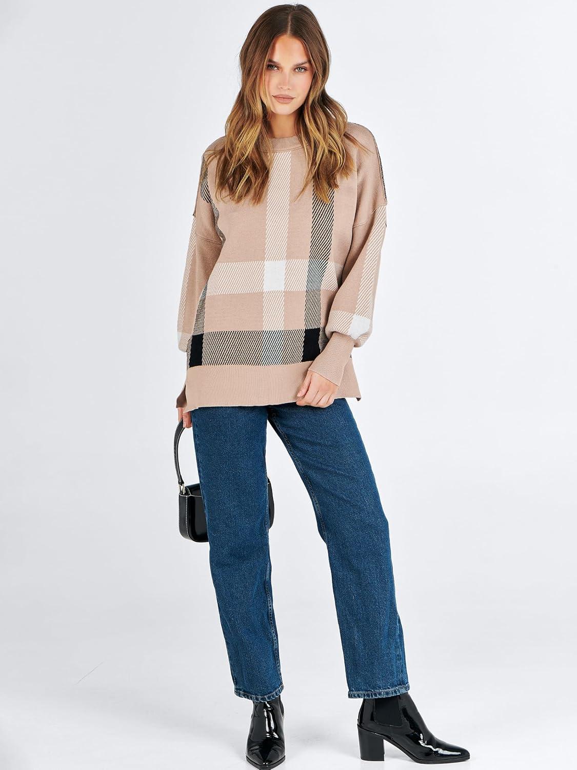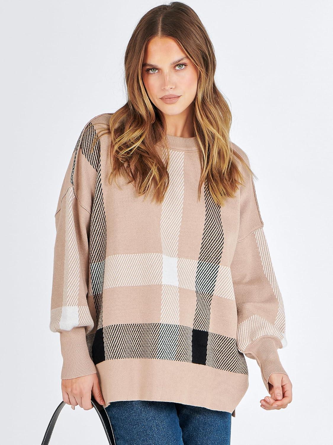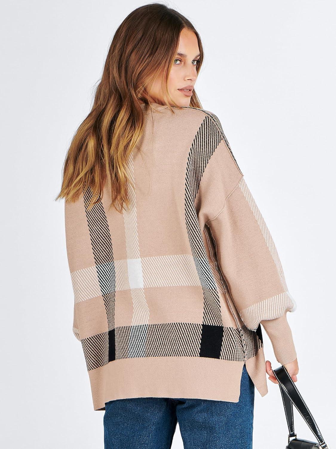 ANRABESS Womens Oversized Sweaters Fall 2025 Fashion Crewneck Batwing Long Sleeve Side Slit Knit Pullover Sweater Tops(Plaid Khaki)
