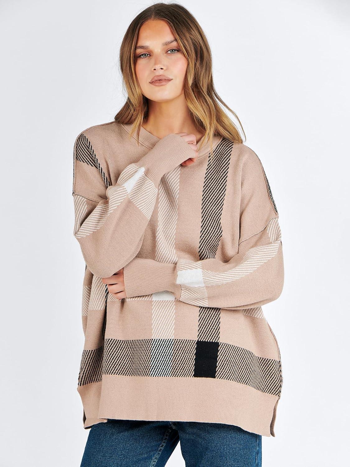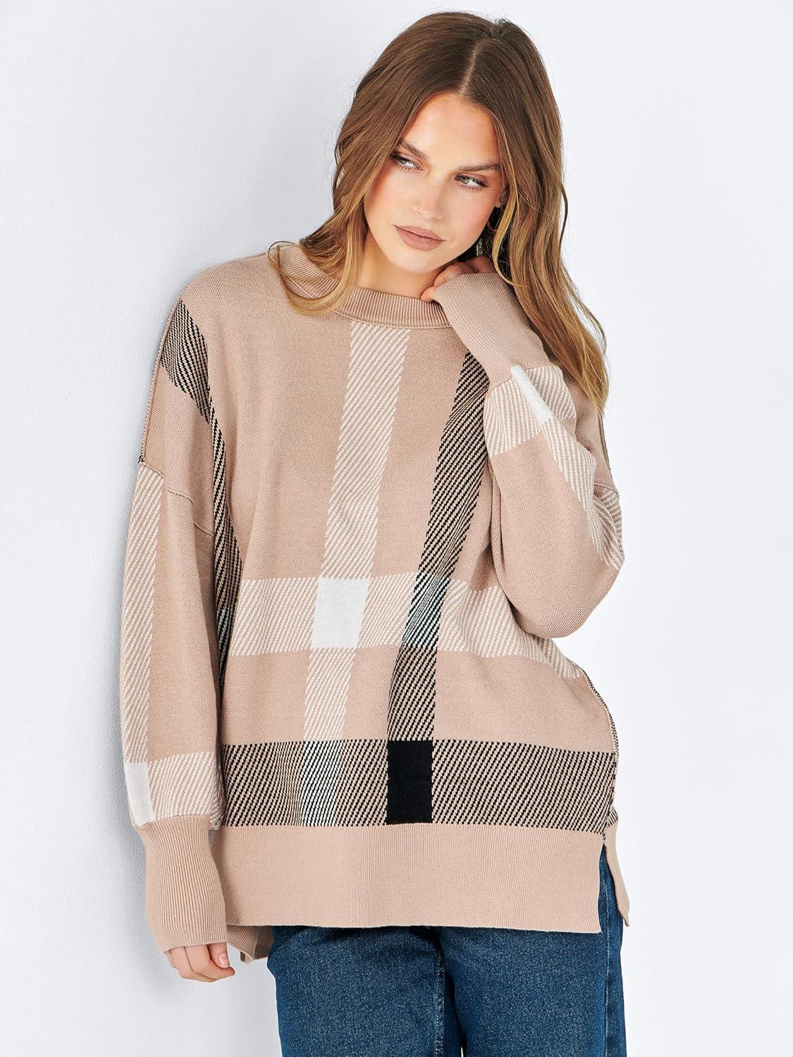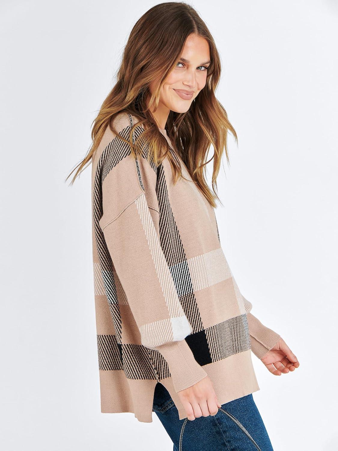 ANRABESS Womens Oversized Sweaters Fall 2025 Fashion Crewneck Batwing Long Sleeve Side Slit Knit Pullover Sweater Tops(Plaid Khaki)