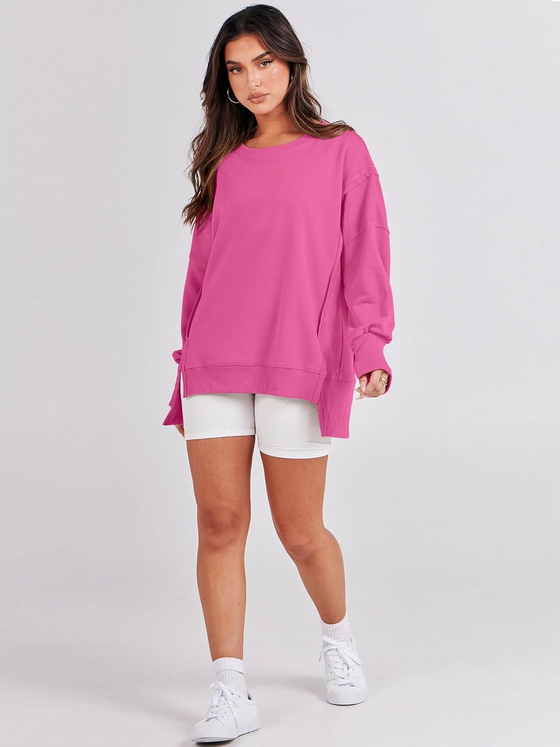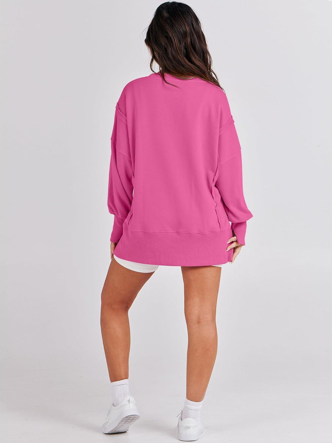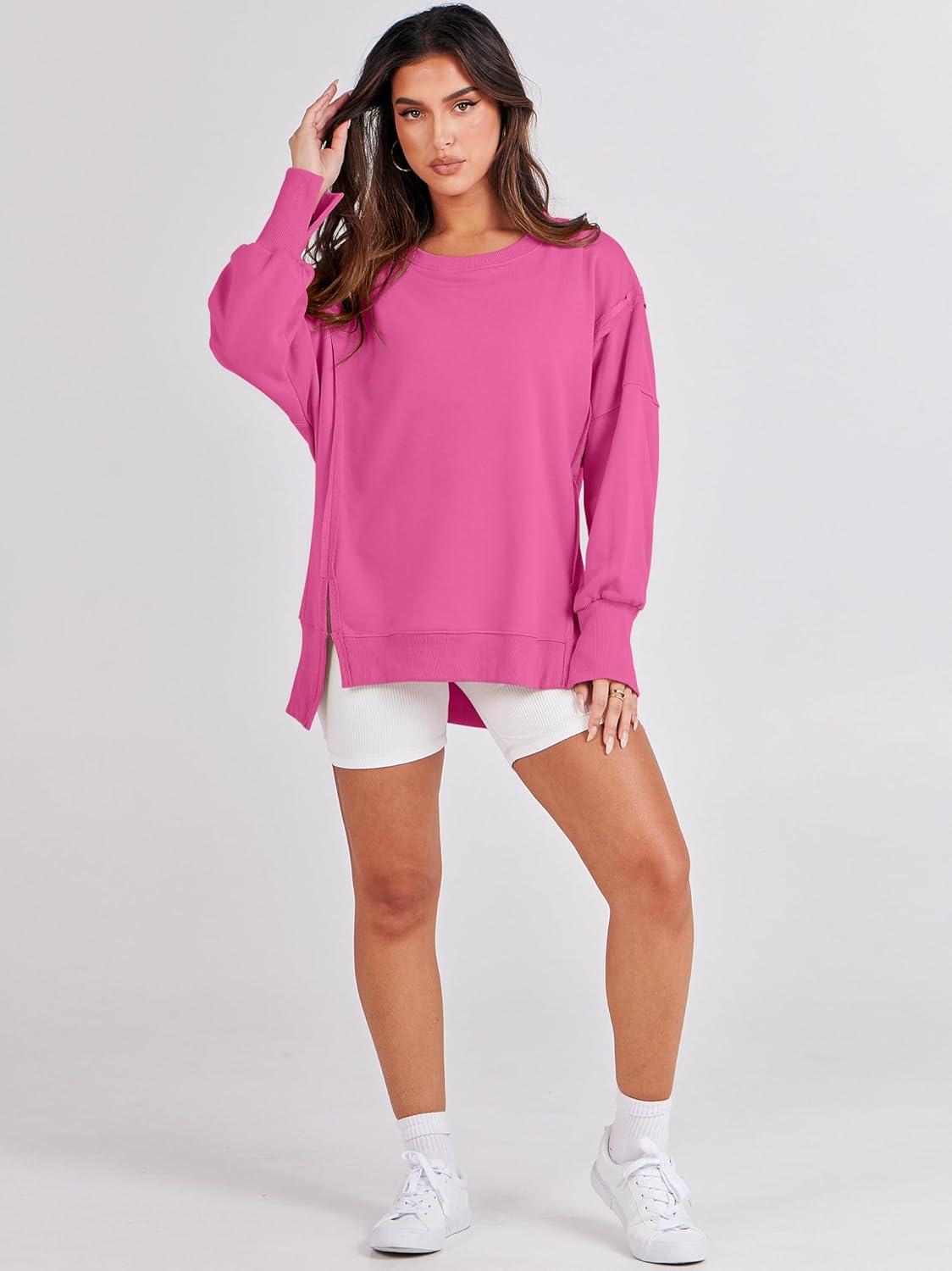 ANRABESS Womens Oversized Sweatshirts Crew Neck Long Sleeve Shirts Casual Loose Slit 2025 Fall Outfits Y2K Teen Girls Clothes(Hot Pink)