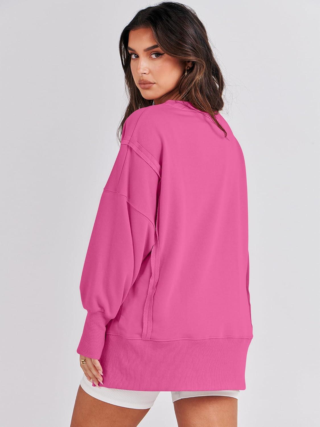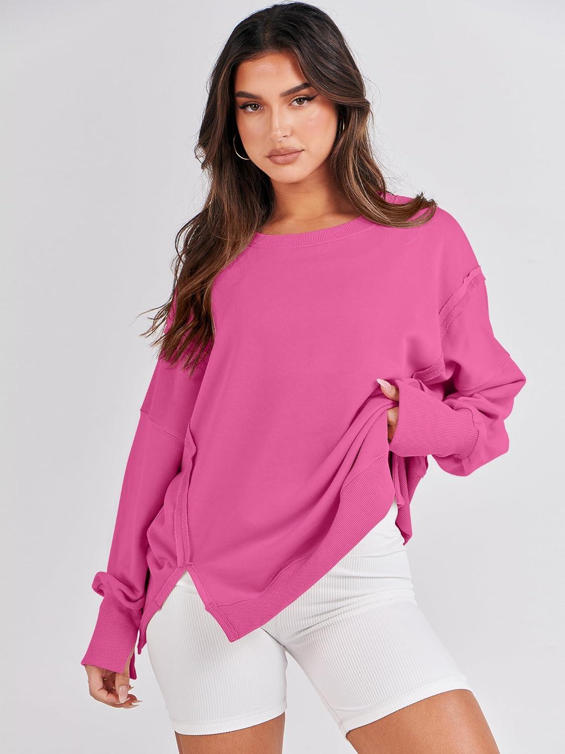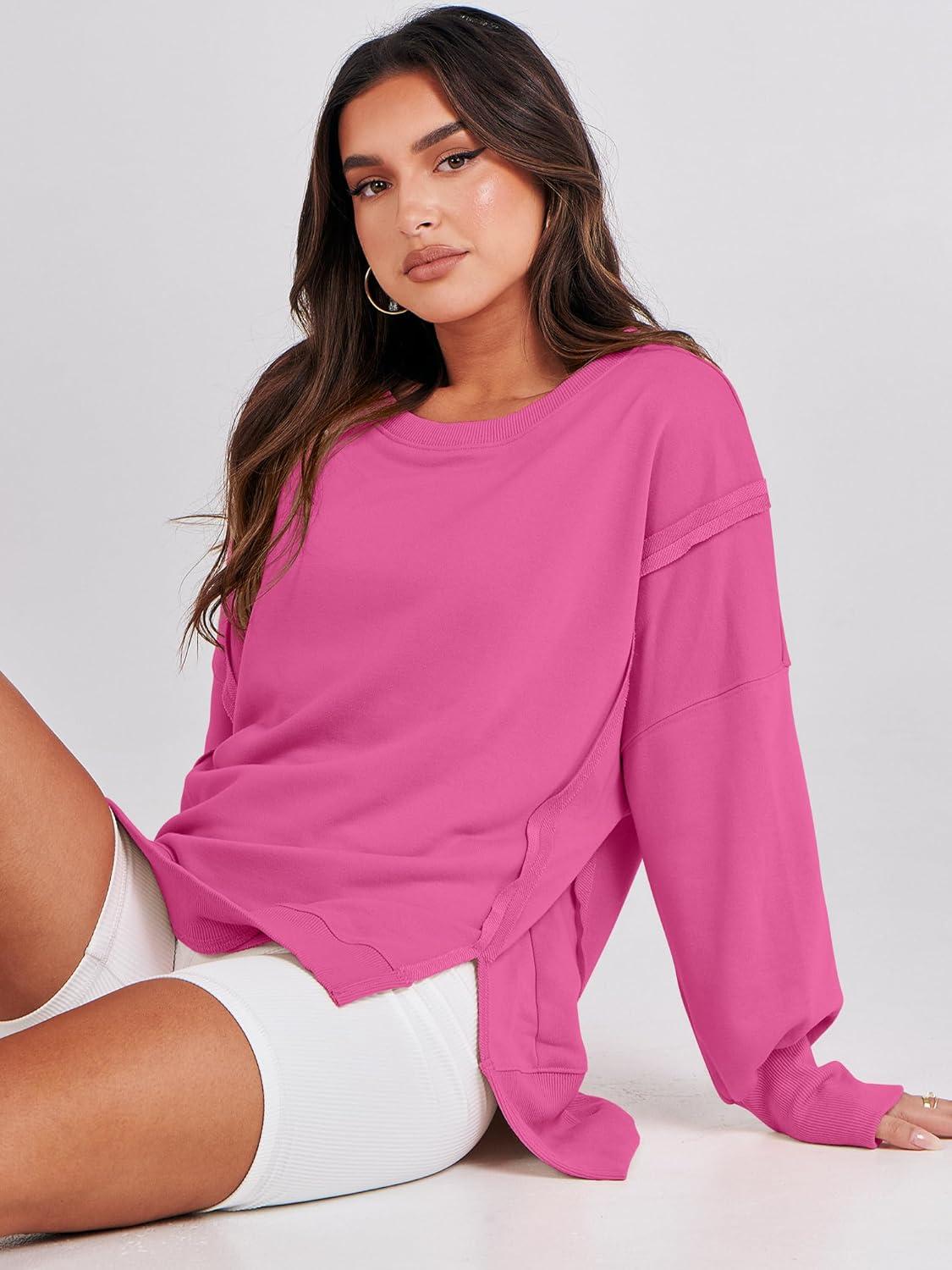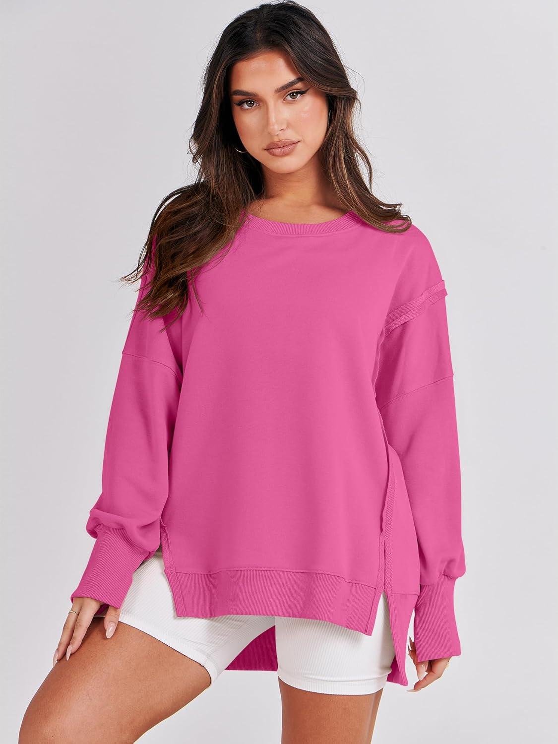 ANRABESS Womens Oversized Sweatshirts Crew Neck Long Sleeve Shirts Casual Loose Slit 2025 Fall Outfits Y2K Teen Girls Clothes(Hot Pink)