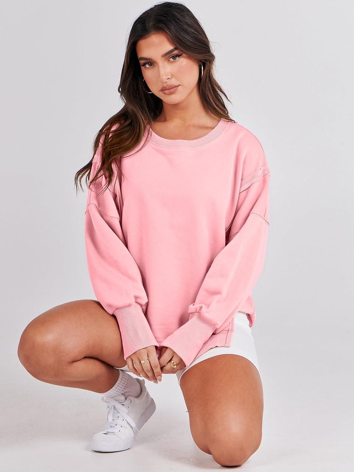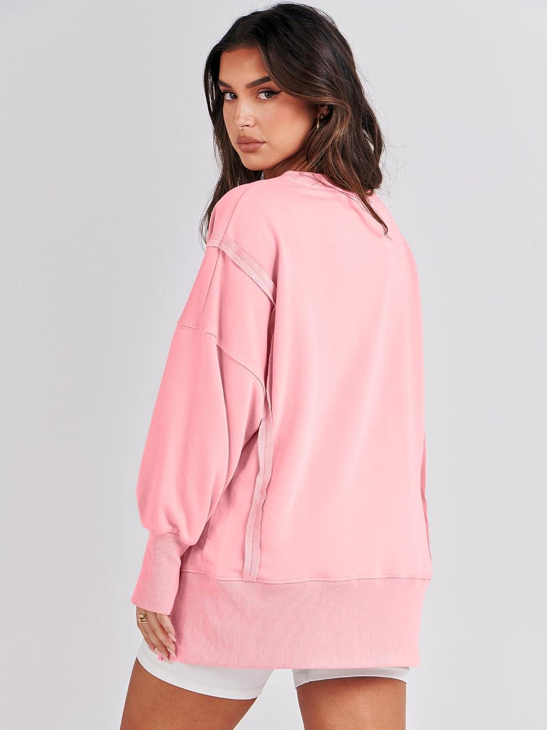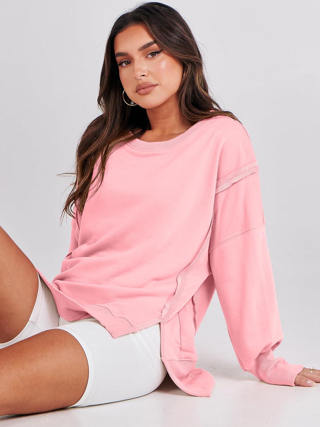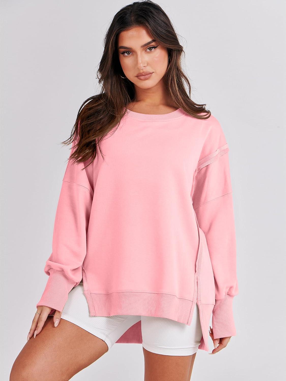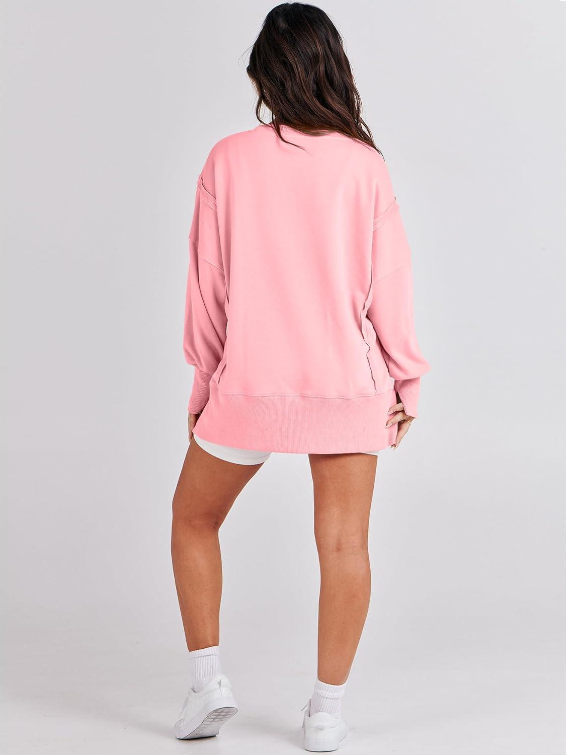 ANRABESS Womens Oversized Sweatshirts Crew Neck Long Sleeve Shirts Casual Loose Slit 2025 Fall Outfits Y2K Teen Girls Clothes(Pink)