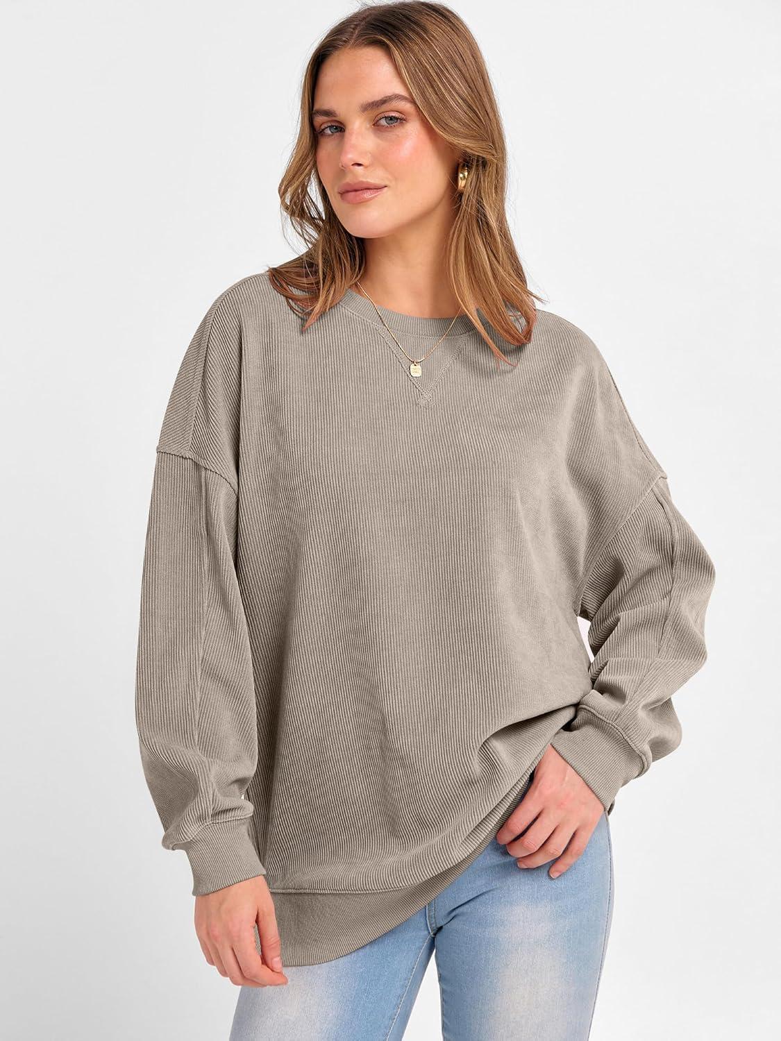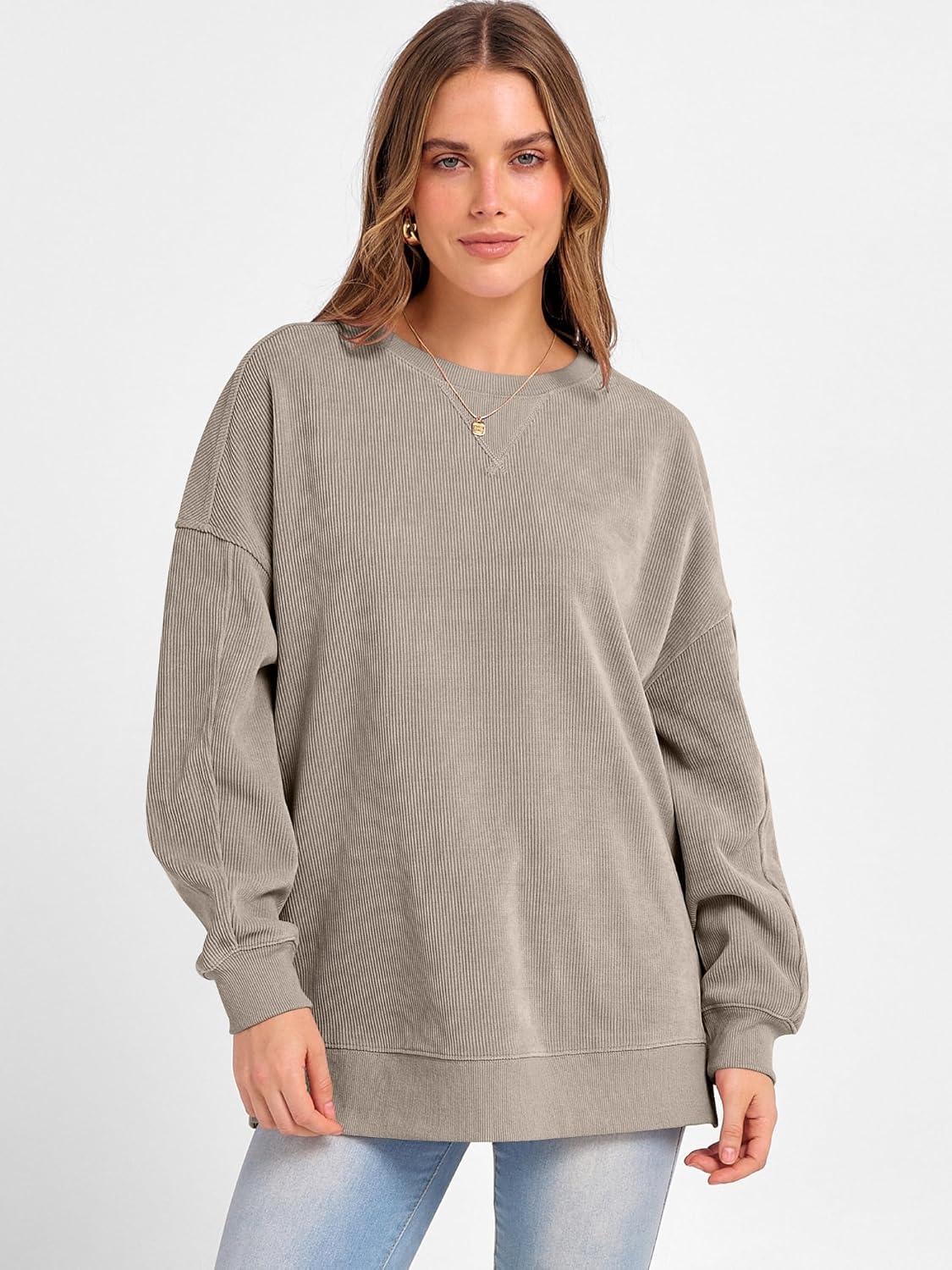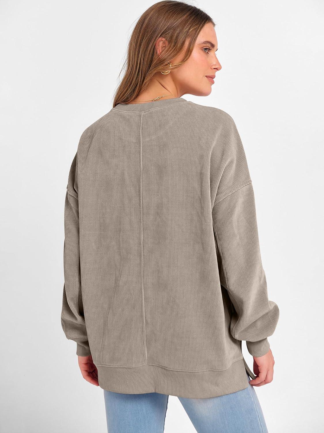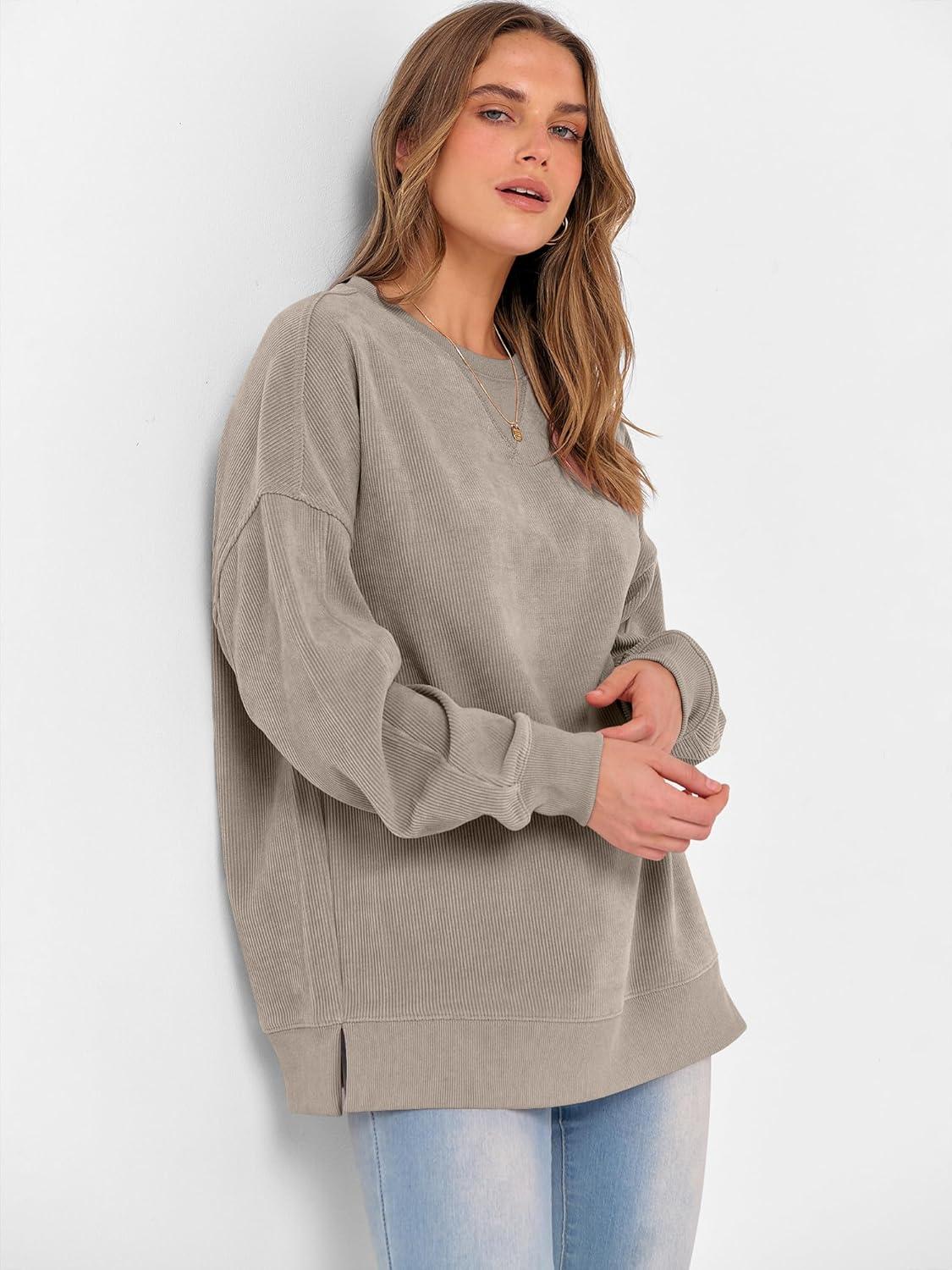 ANRABESS Womens Oversized Sweatshirts Crewneck Corduroy Side Slit Pullover Sweaters 2025 Fall Long Sleeve Tunic Tops Outfits(Khaki)