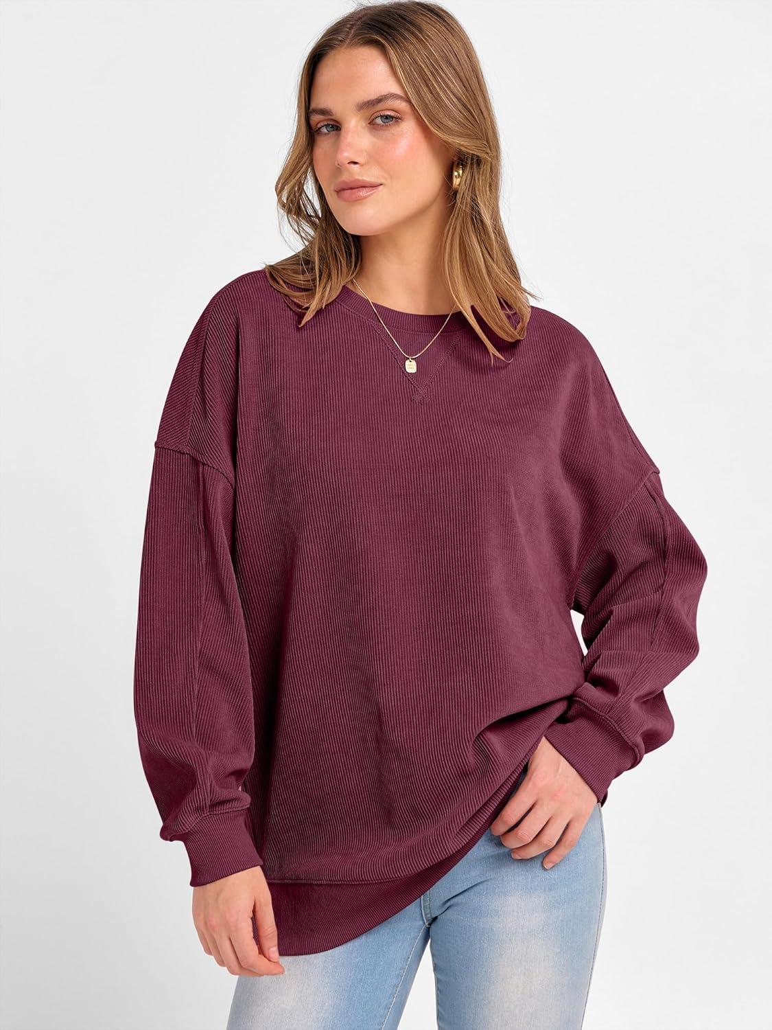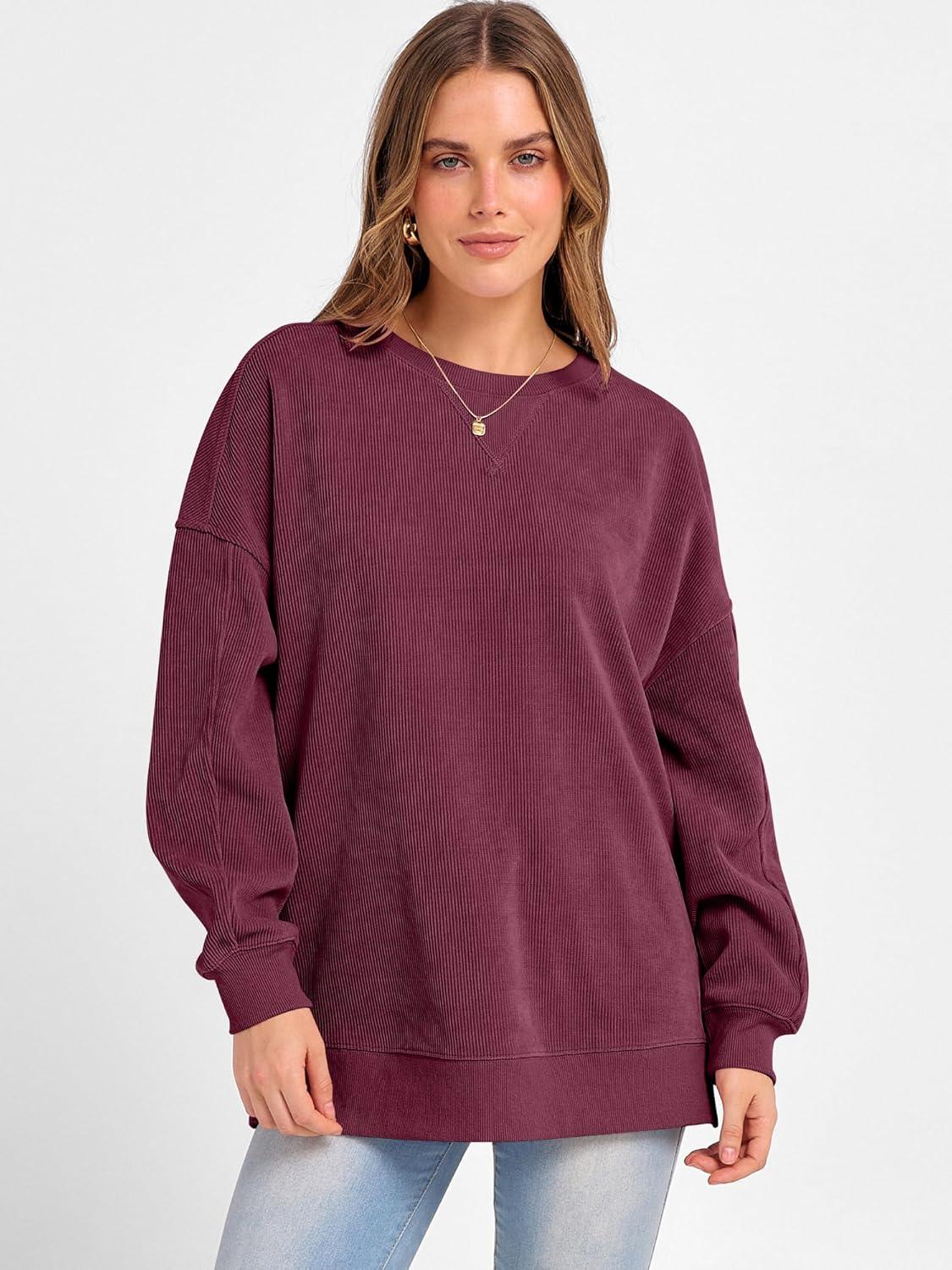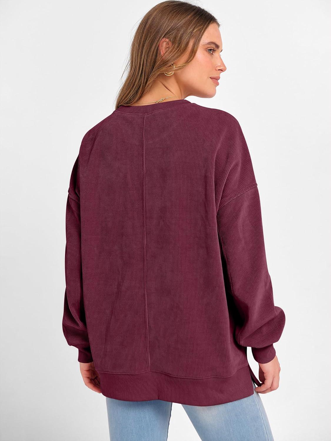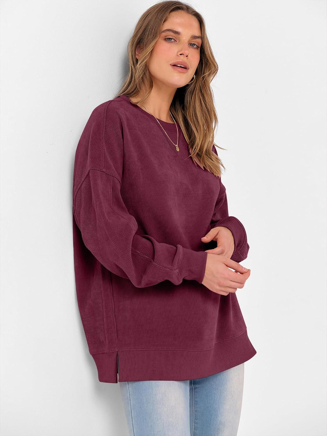 ANRABESS Womens Oversized Sweatshirts Crewneck Corduroy Side Slit Pullover Sweaters 2025 Fall Long Sleeve Tunic Tops Outfits(Wine Red)