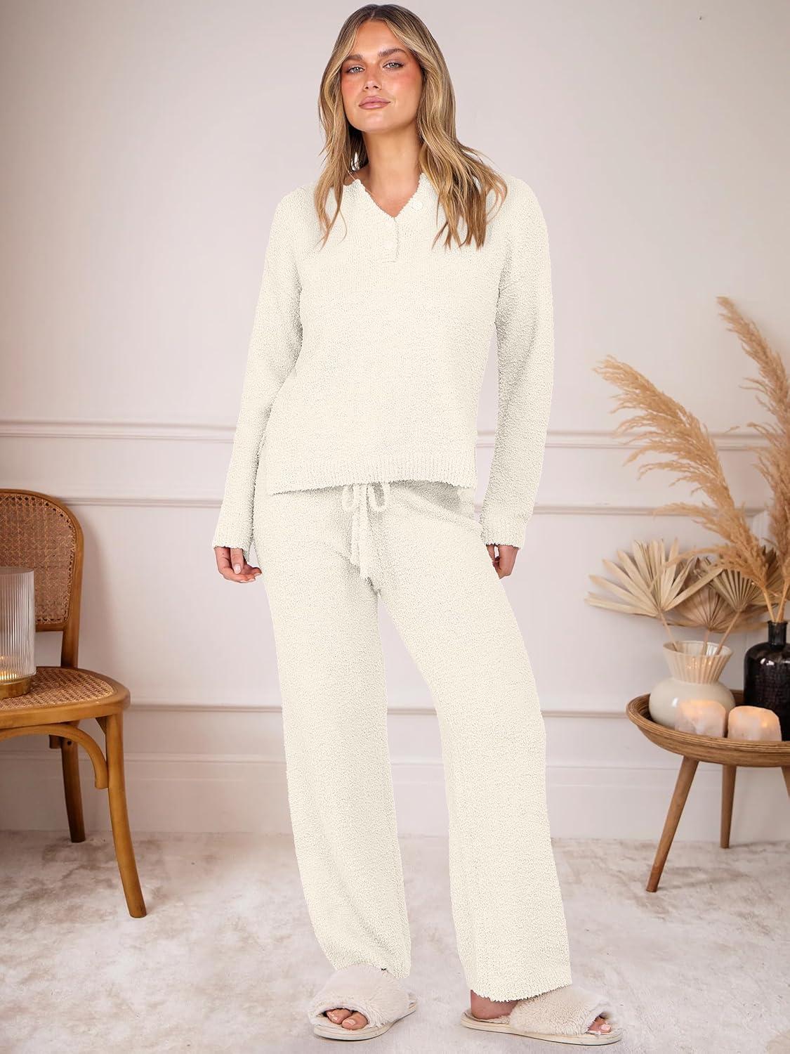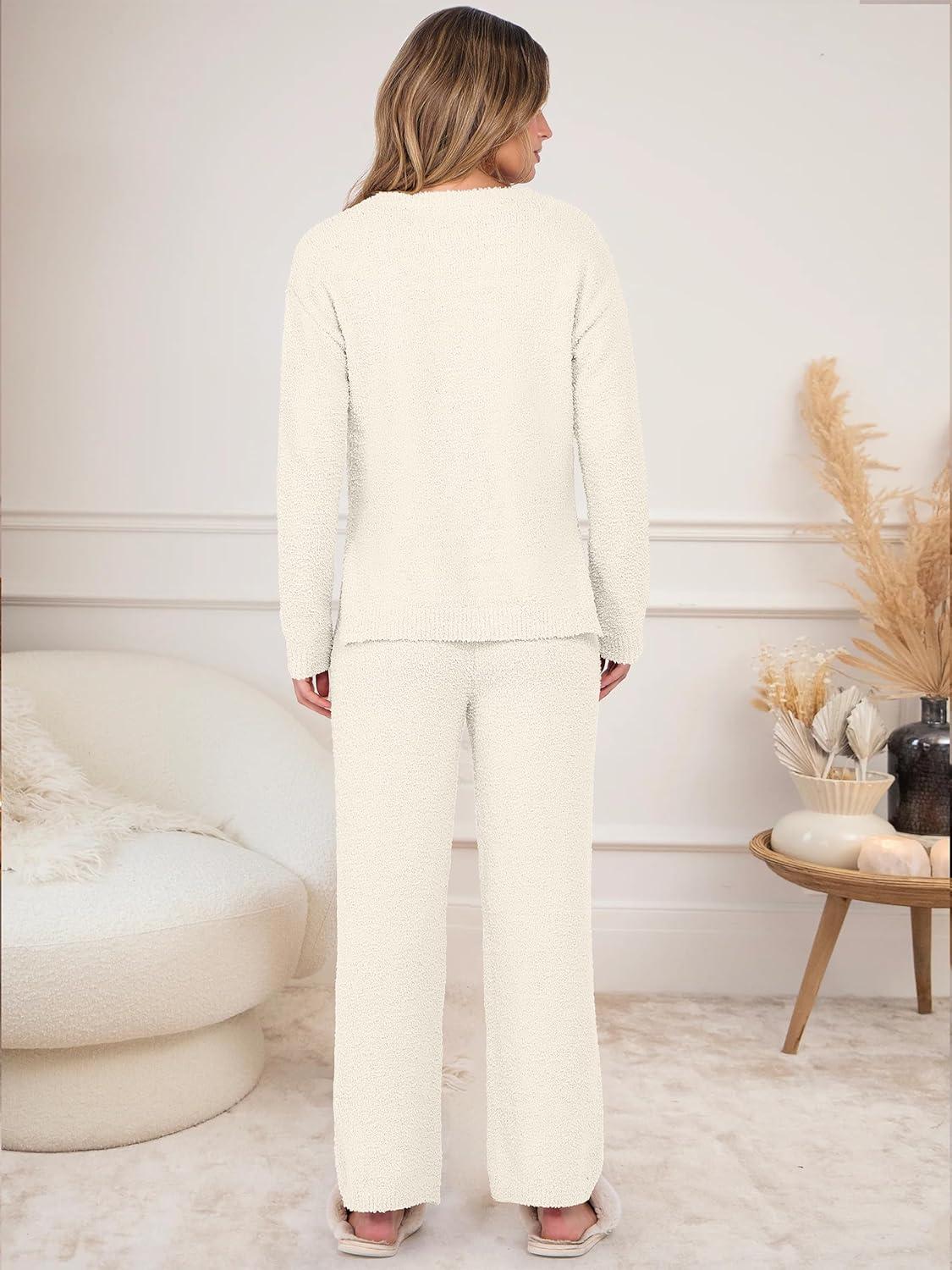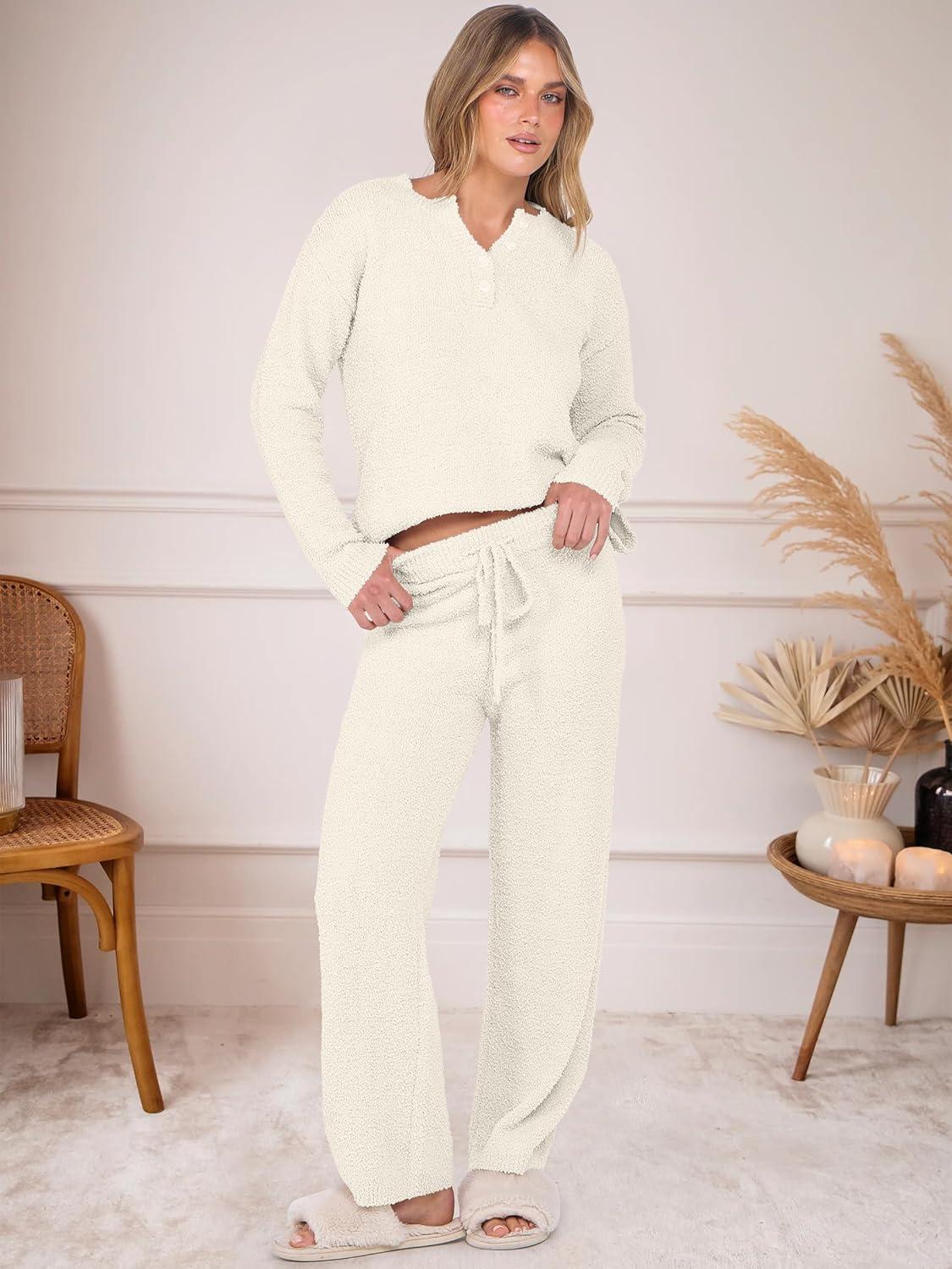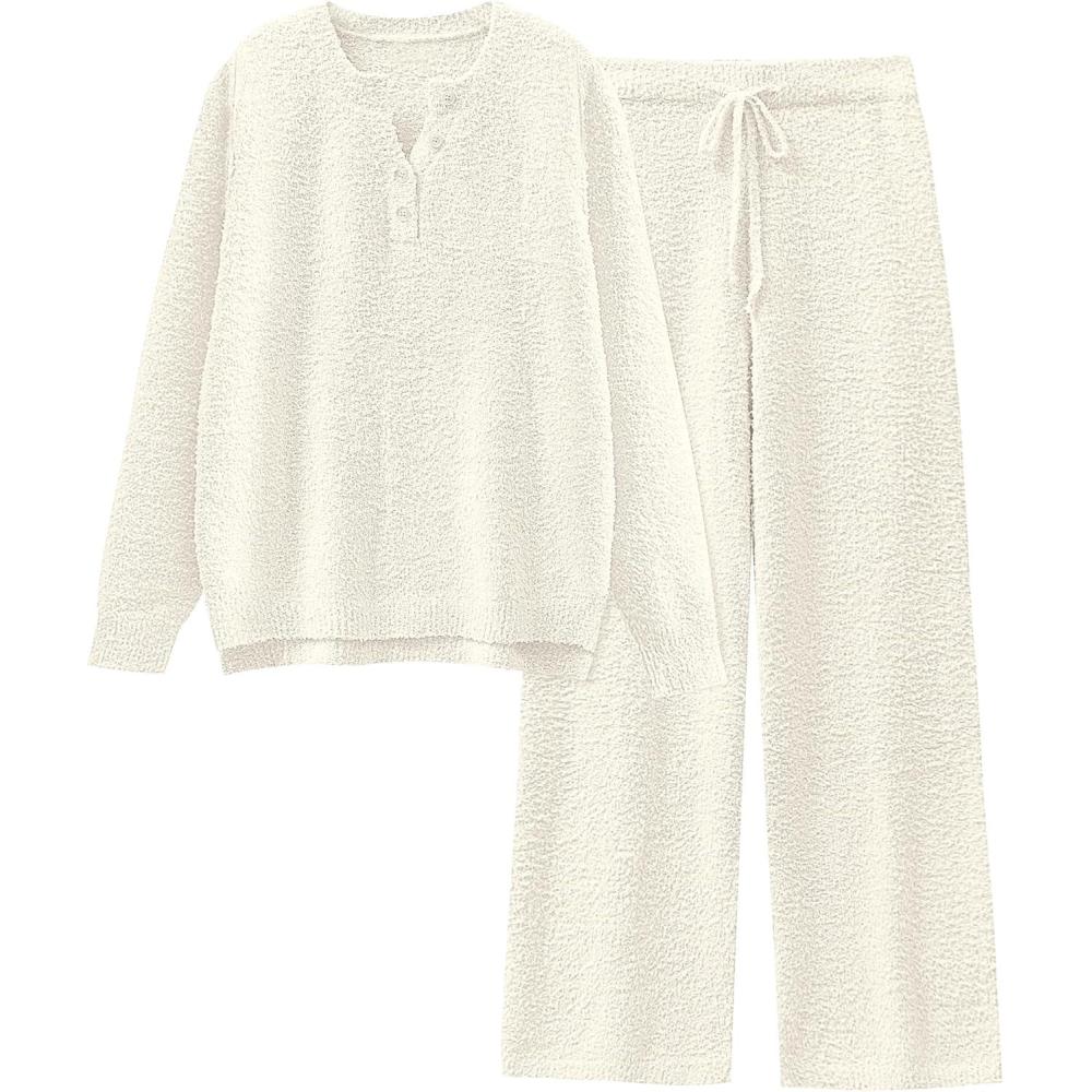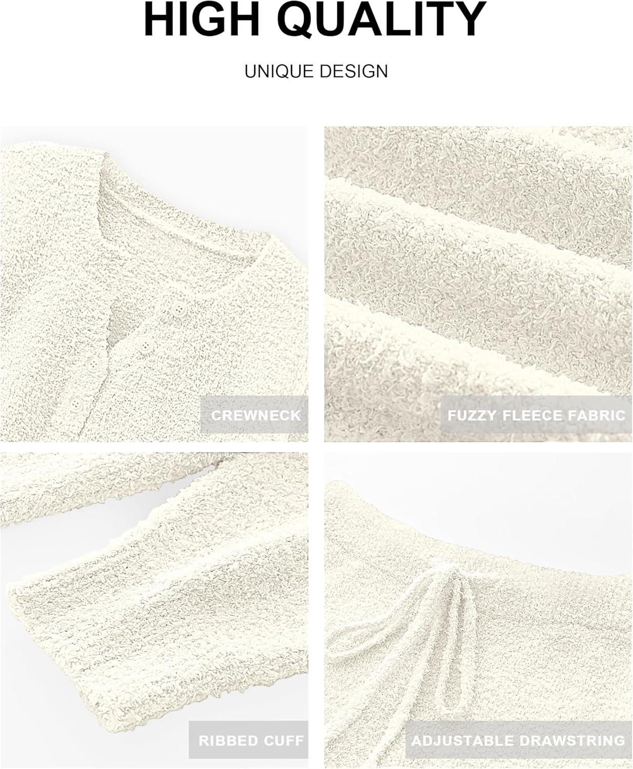 ANRABESS Womens Pajama Fuzzy Fleece 2 Piece Long Sleeve Top Wide Leg Pants Lounge Matching Pj Sets 2025 Fall Winter Outfits(Beige)