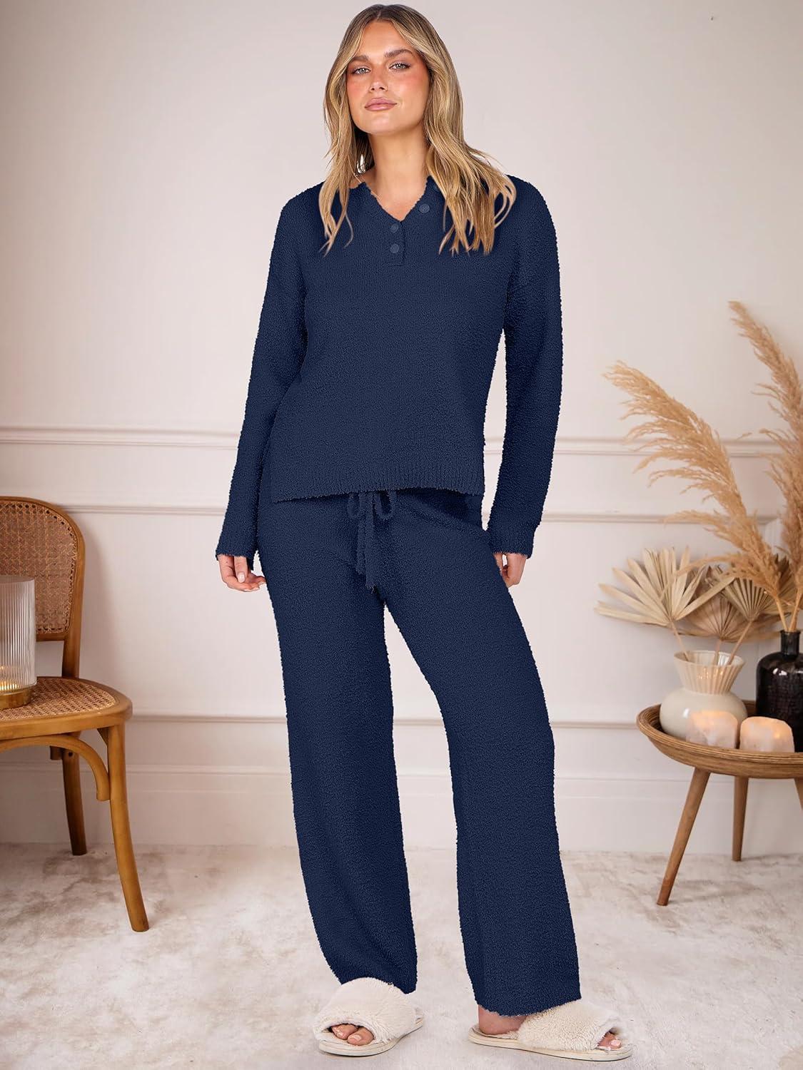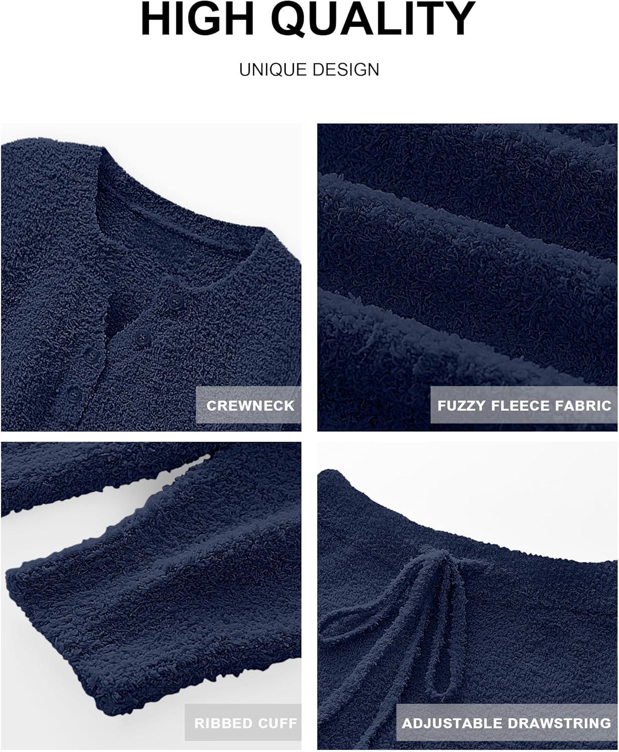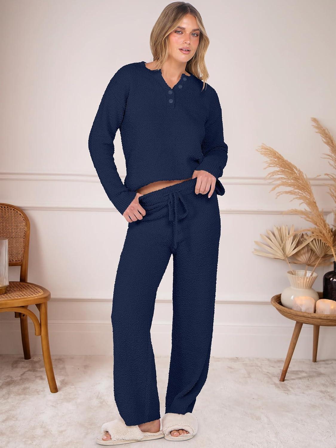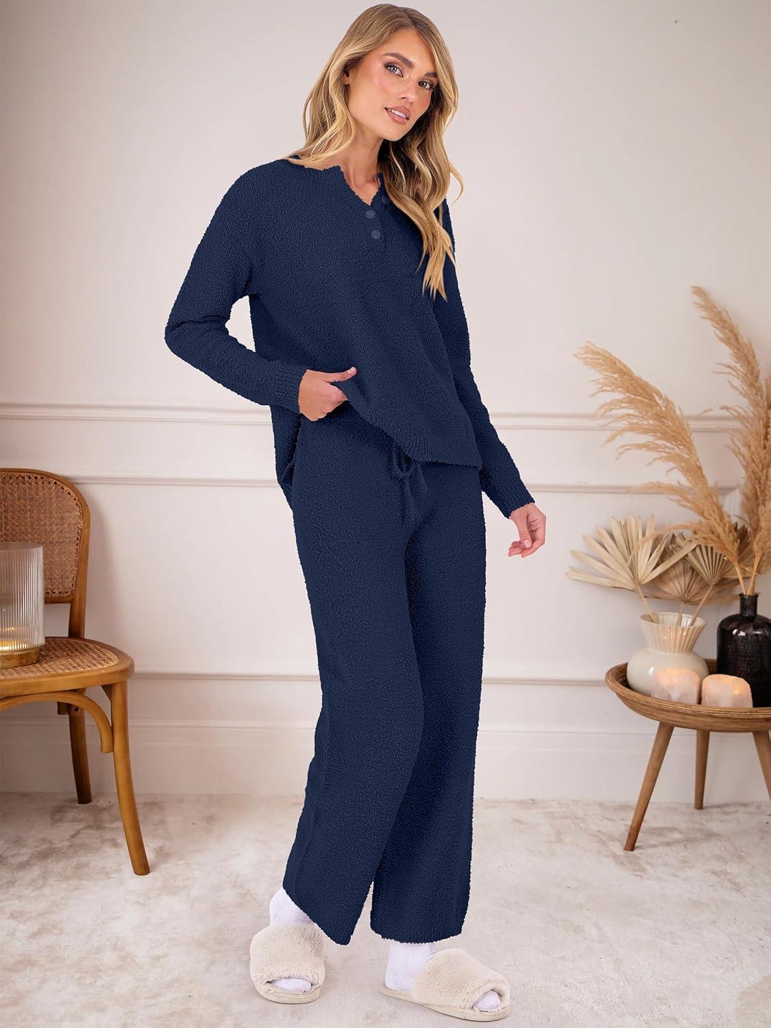 ANRABESS Womens Pajama Fuzzy Fleece 2 Piece Long Sleeve Top Wide Leg Pants Lounge Matching Pj Sets 2025 Fall Winter Outfits(Navy Blue)