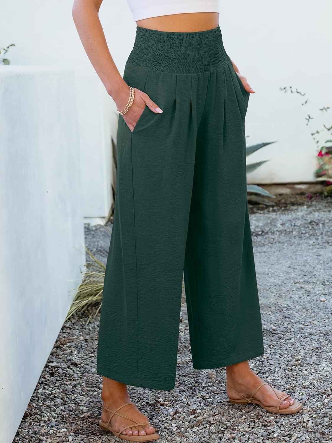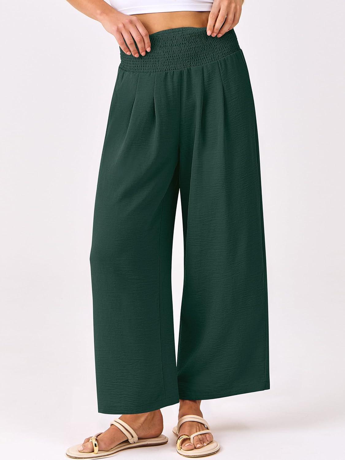 ANRABESS Womens Pants Wide Leg High Waisted Palazzo Pants Summer Flowy Beach Lounge Casual Trousers with Pockets(Dark Green)