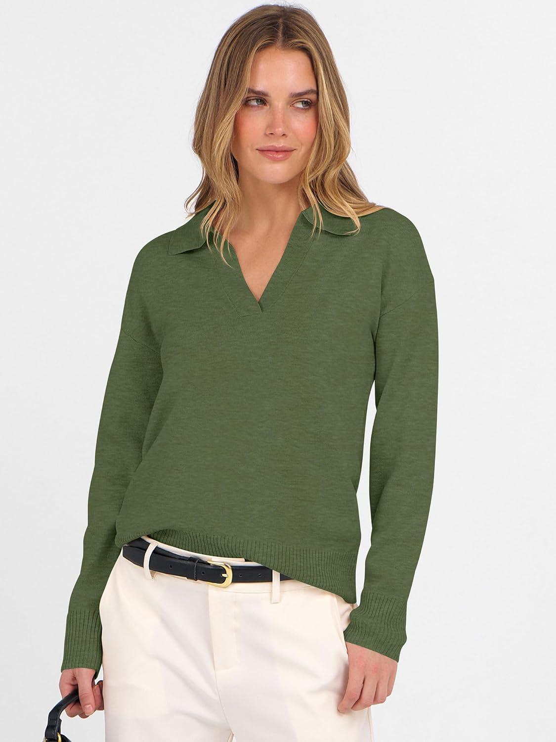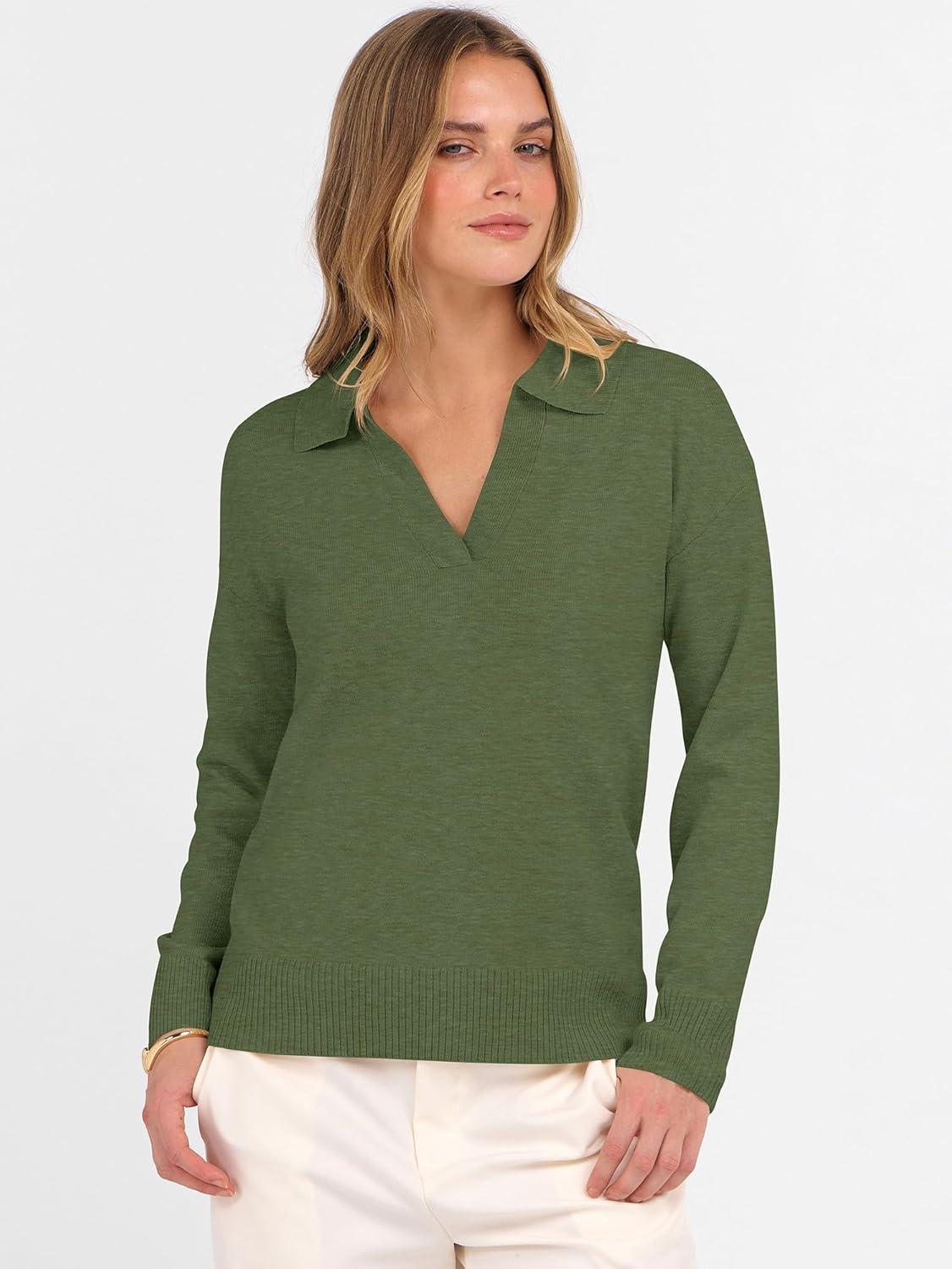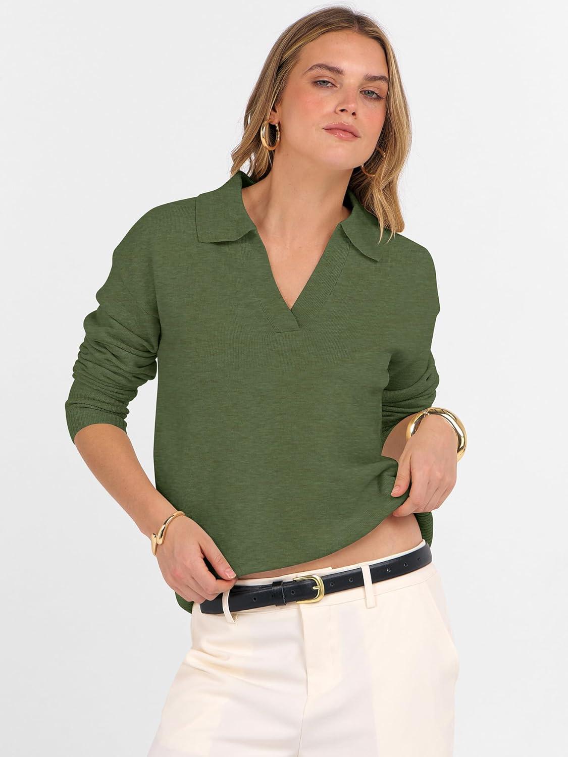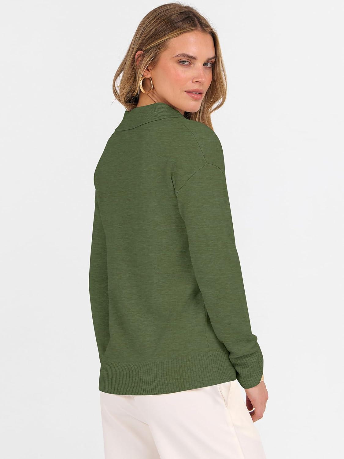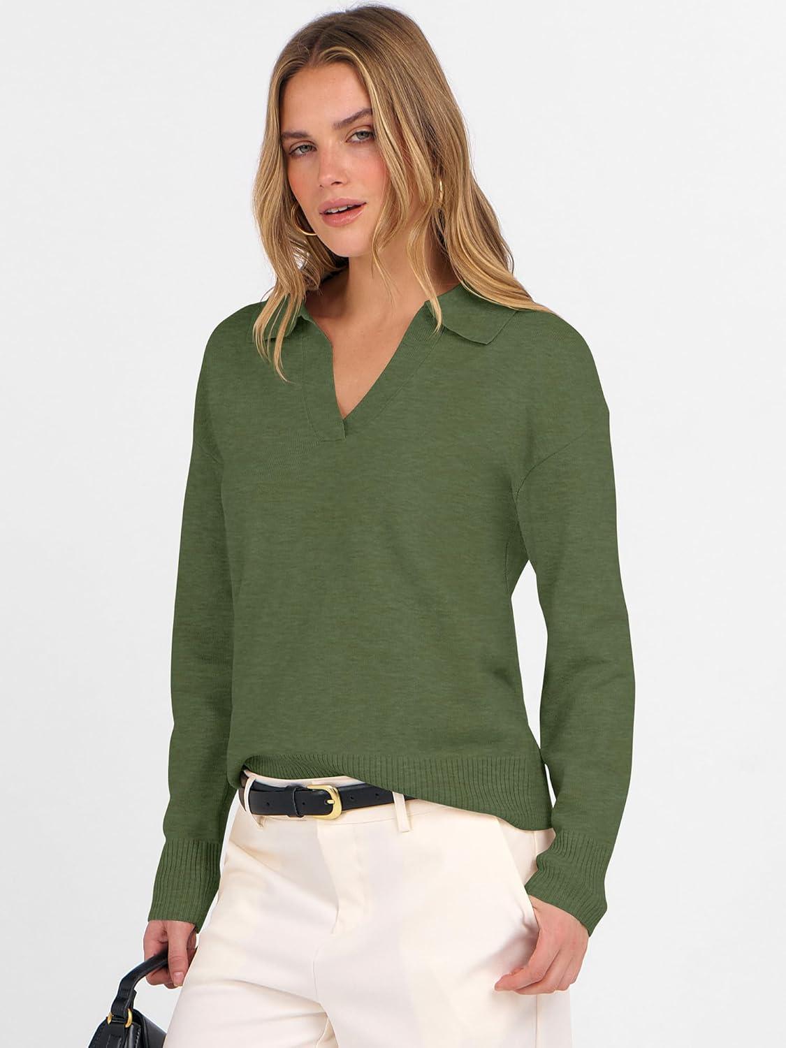 ANRABESS Womens Polo V Neck Long Sleeve Sweaters Lightweight Dressy Casual Business Basic Knit Pullover Top 2025 Fall Outfits(Army Green)