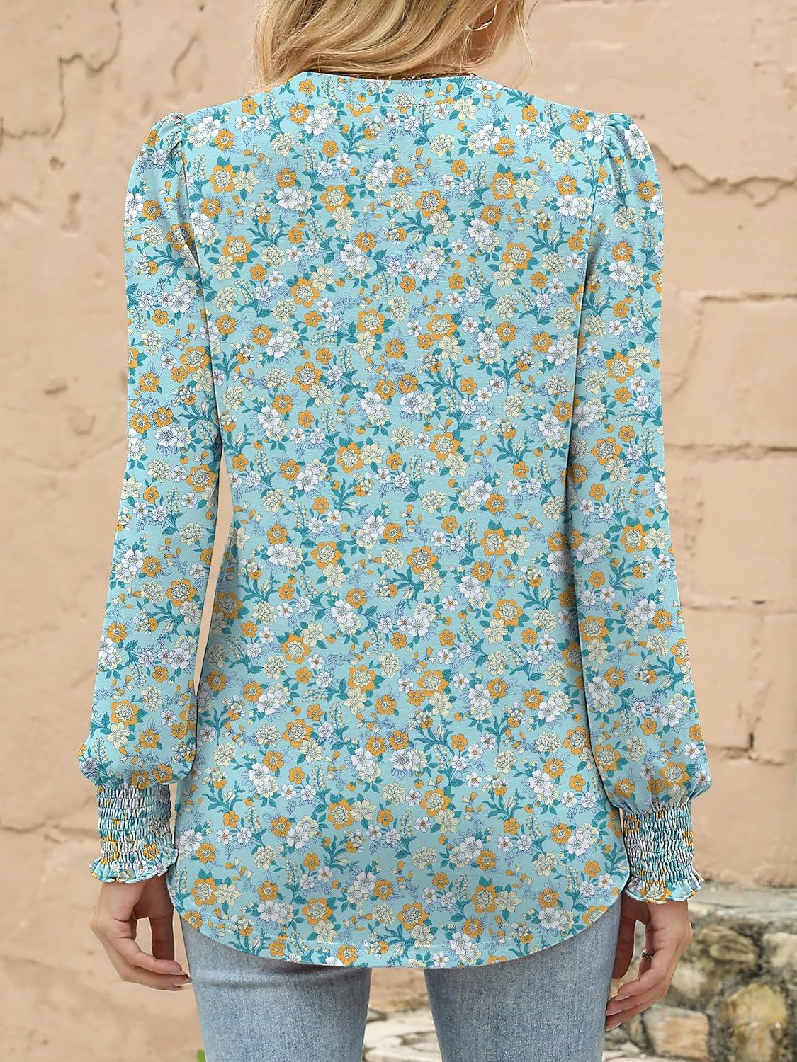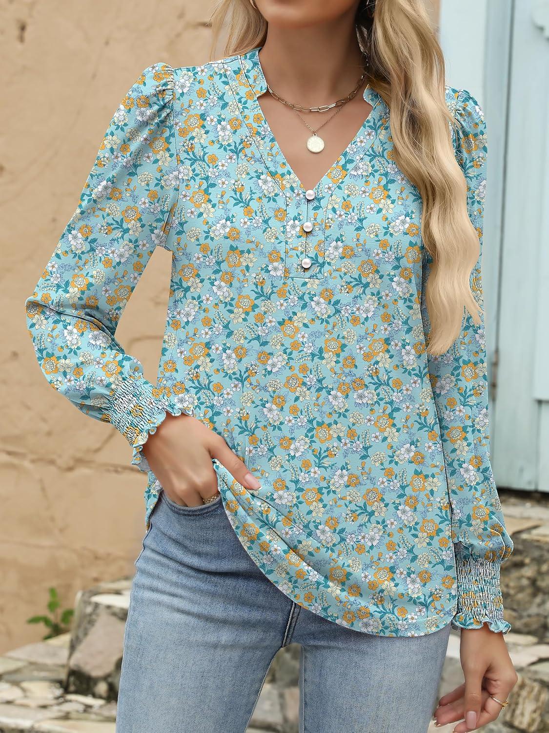 ANRABESS Womens Puff Long Sleeve Shirts Dressy Casual Blouses 2025 Fall V Neck Loose Fit Floral Business Work Tunic Tops(Orange White Floral)