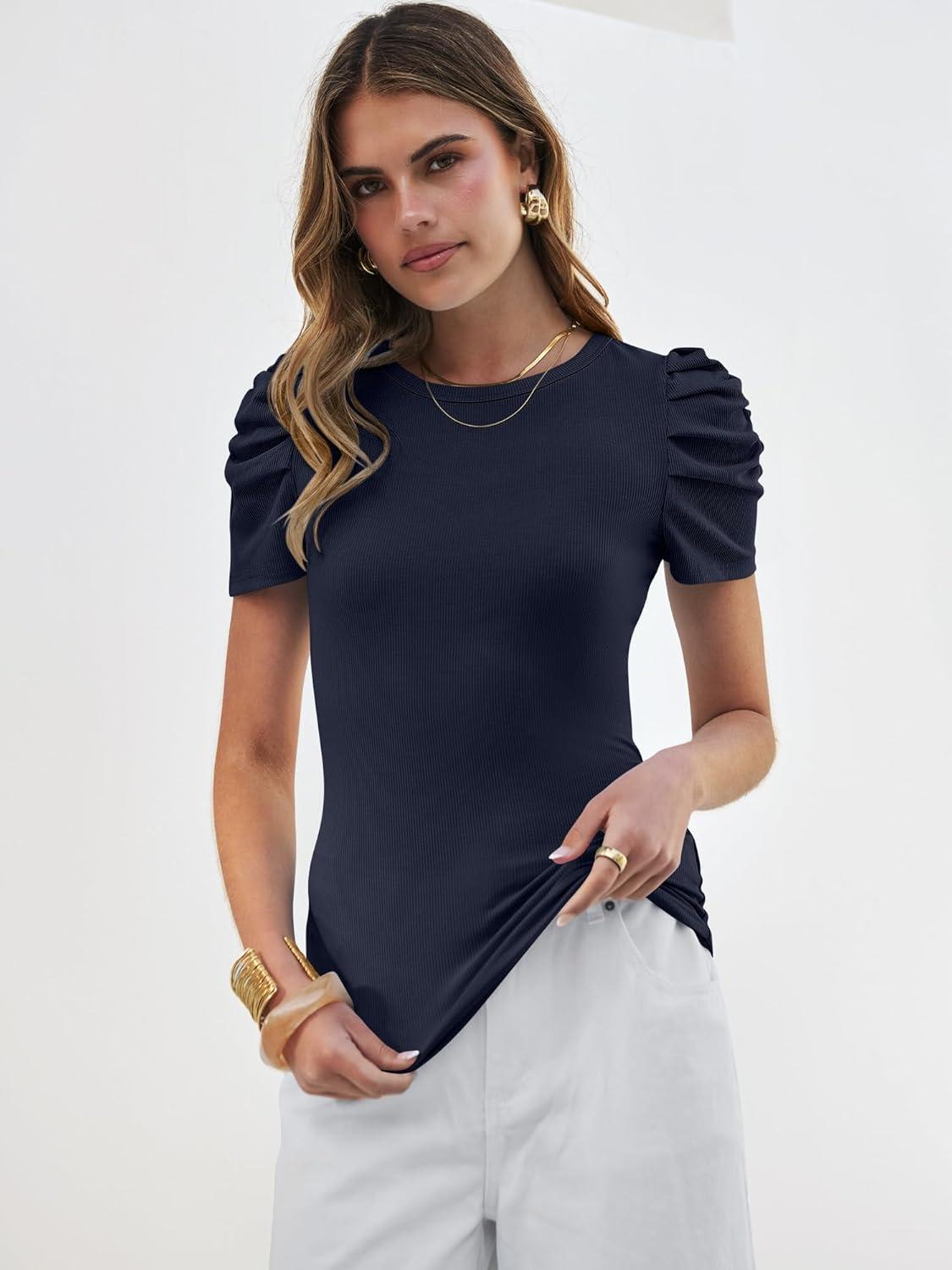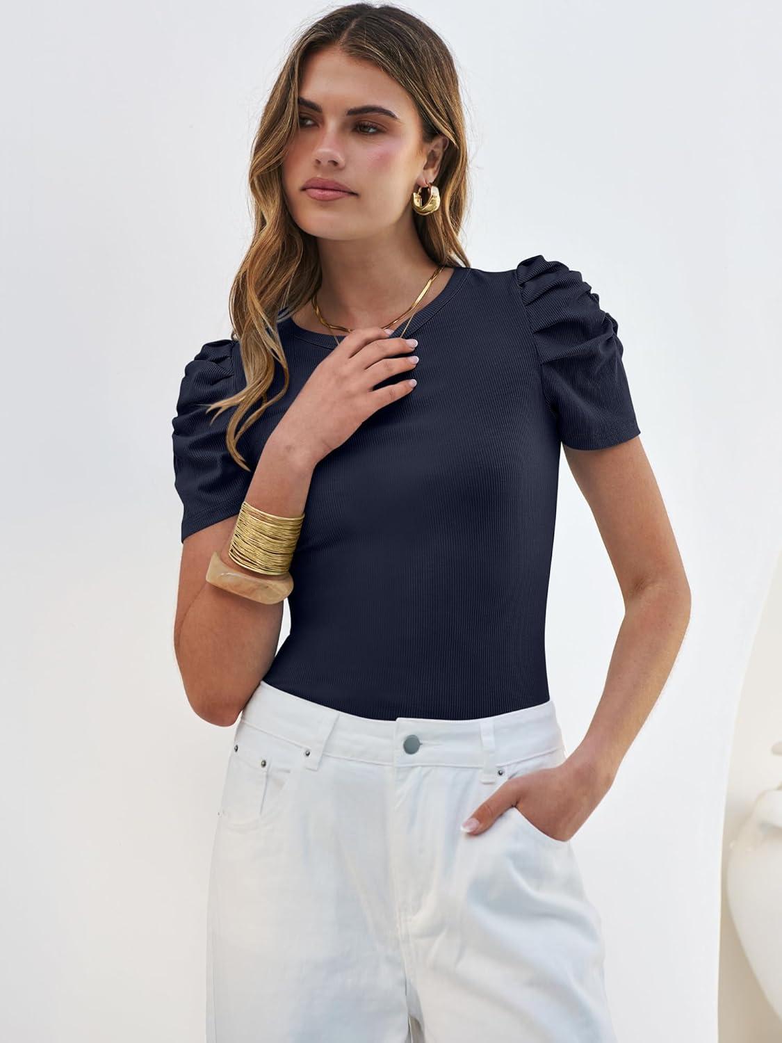 ANRABESS Women’s Puff Sleeve Crewneck Dressy Casual Tops Summer Fitted Ribbed Knit Trendy Going Out T Shirts 2026 Spring(Navy Blue)