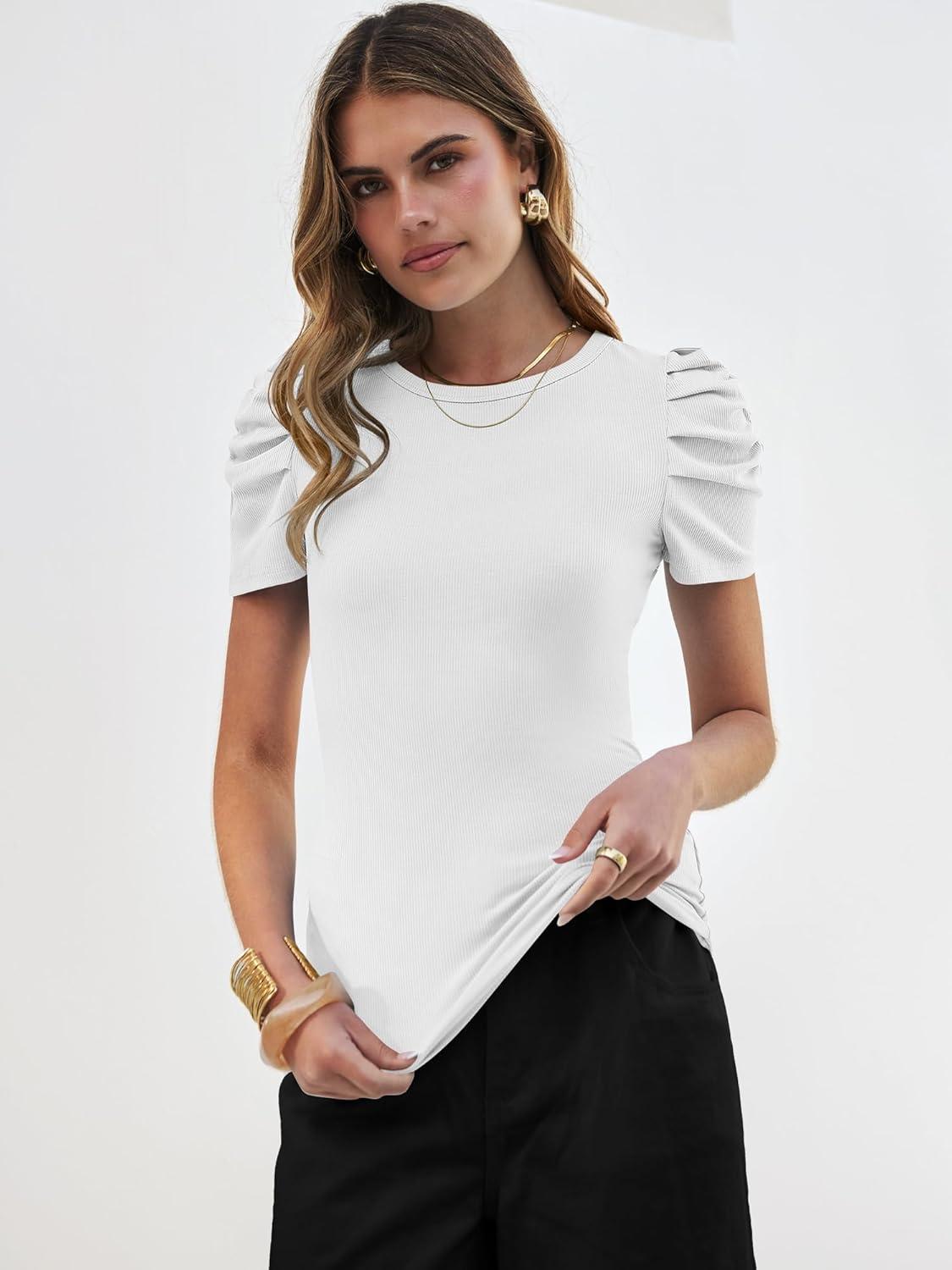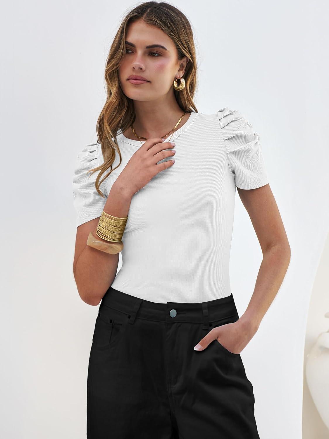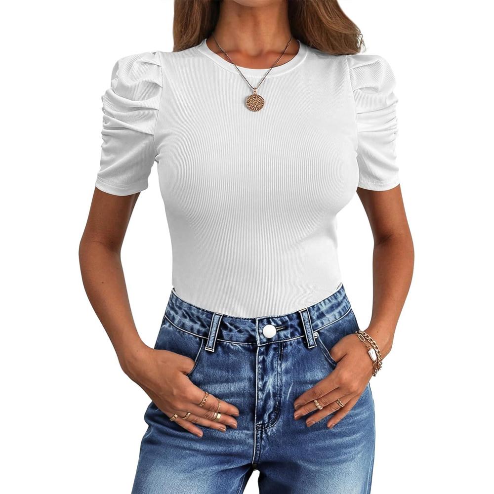 ANRABESS Women’s Puff Sleeve Crewneck Dressy Casual Tops Summer Fitted Ribbed Knit Trendy Going Out T Shirts 2026 Spring(White)