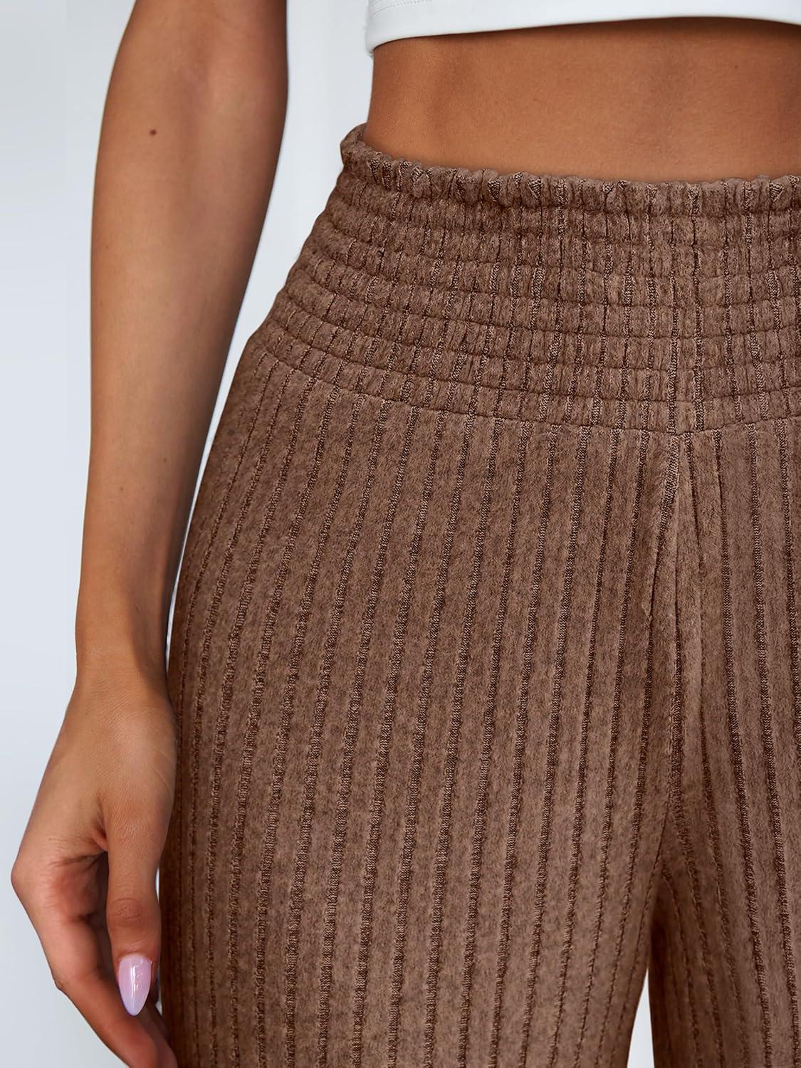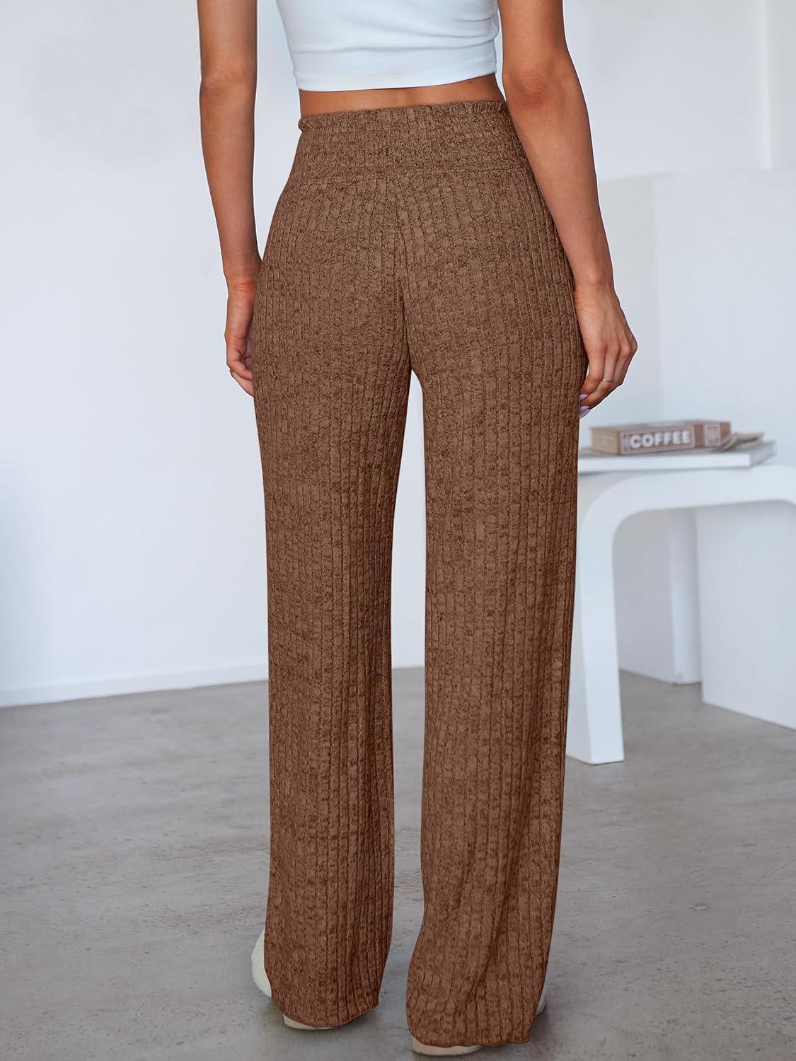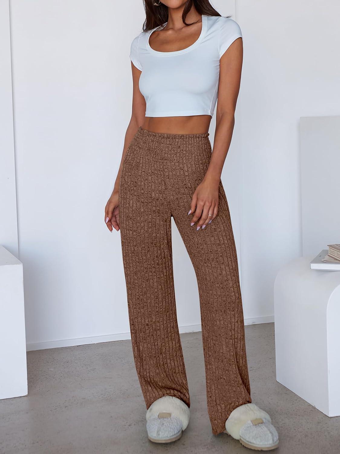 ANRABESS Womens Ribbed Knit Lounge Pajama Pants Casual Elastic High Waist Loose Wide Leg Pants 2025 Fall Comfy PJ Bottoms(Brown)