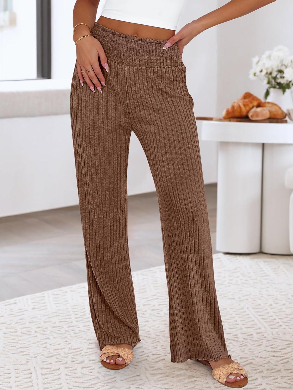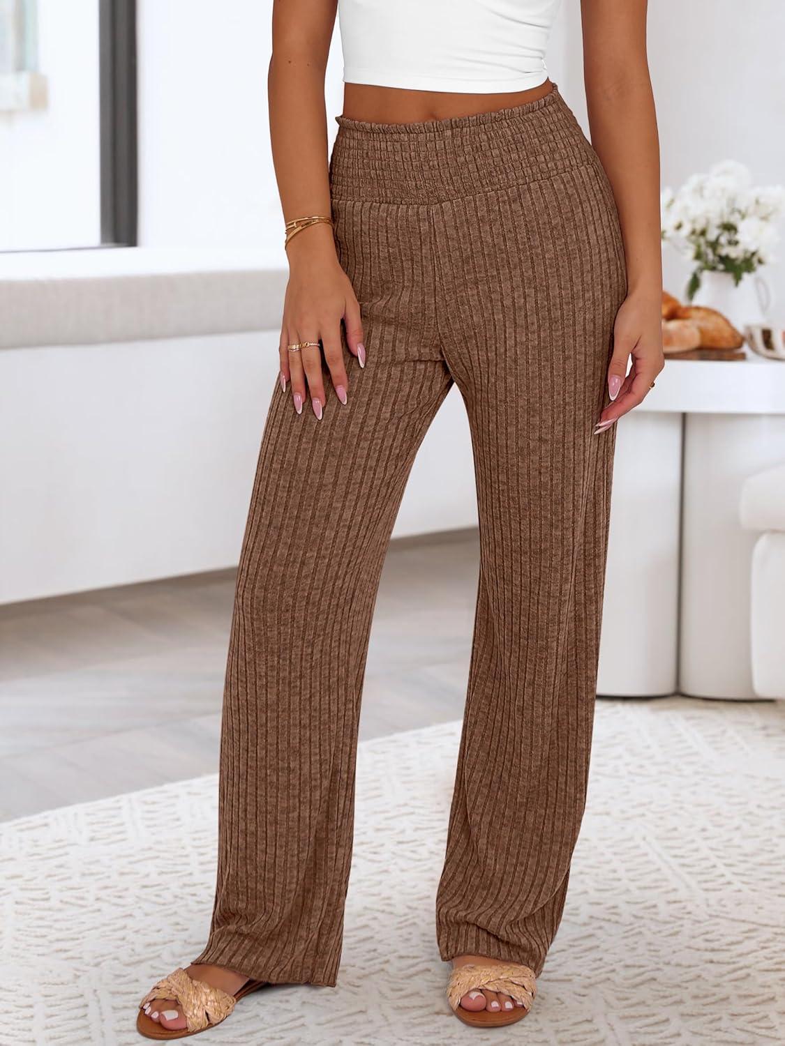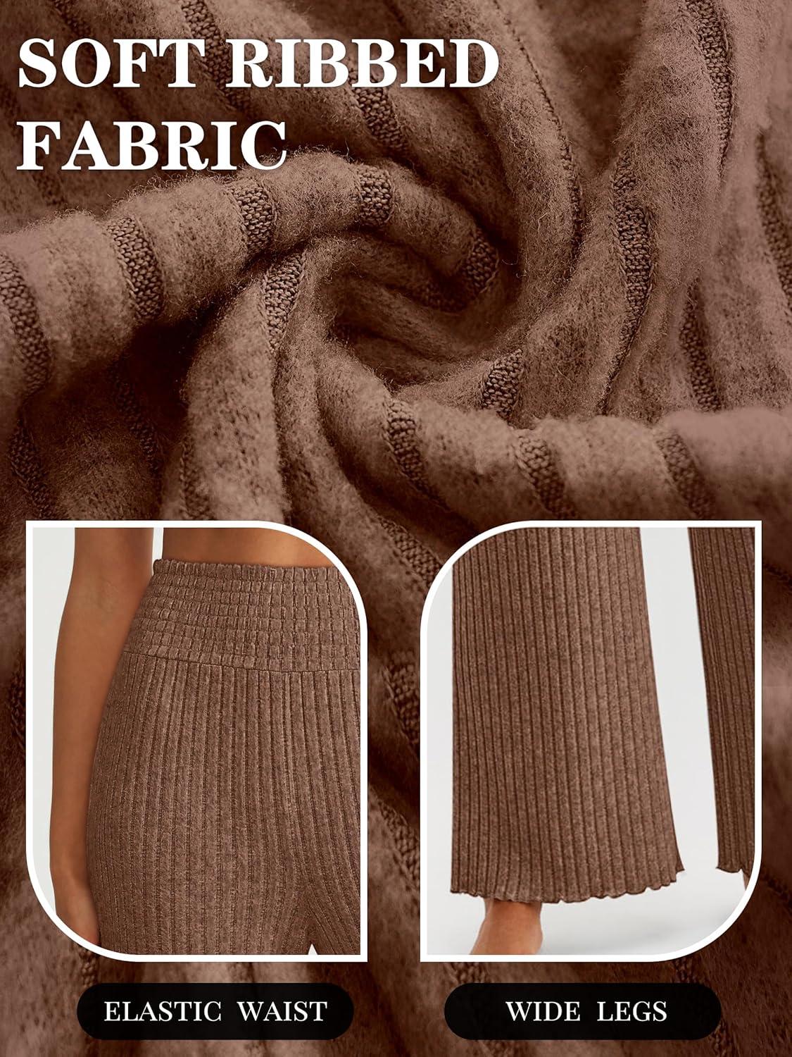 ANRABESS Womens Ribbed Knit Lounge Pajama Pants Casual Elastic High Waist Loose Wide Leg Pants 2025 Fall Comfy PJ Bottoms(Brown)