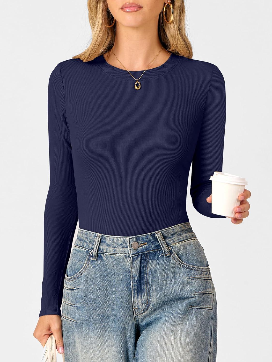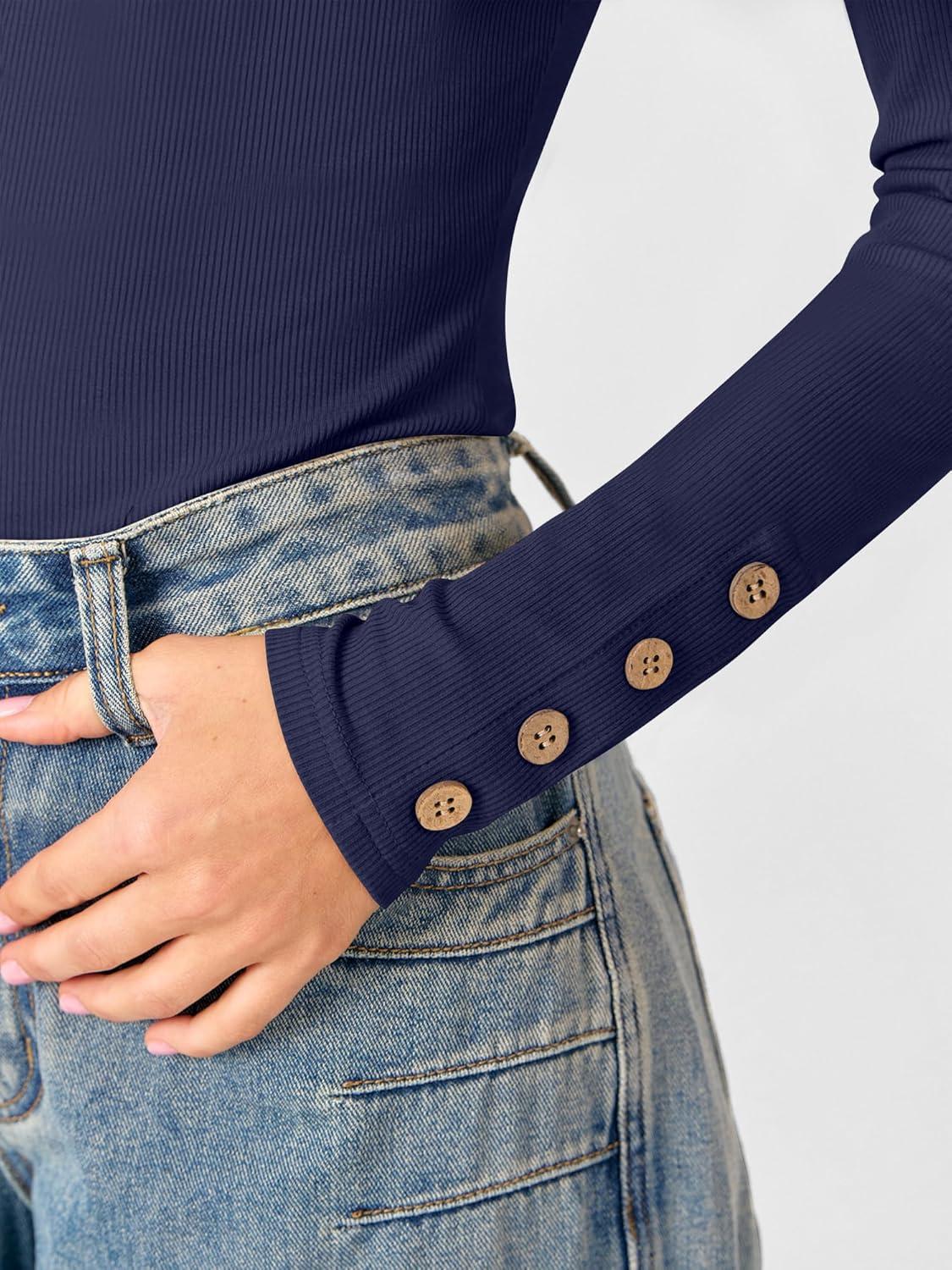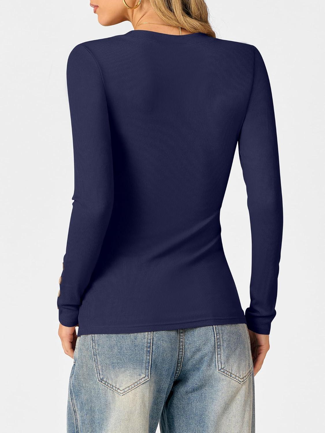 ANRABESS Womens Ribbed Long Sleeve Tops Slim Fitted Dressy Shirts Basic Tee Tshirts 2025 Fall Fasion Outfits with Buttons(Navy Blue)