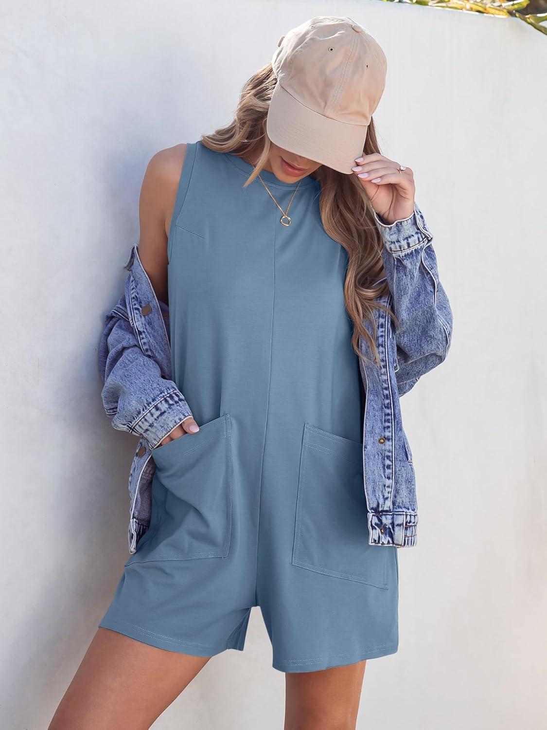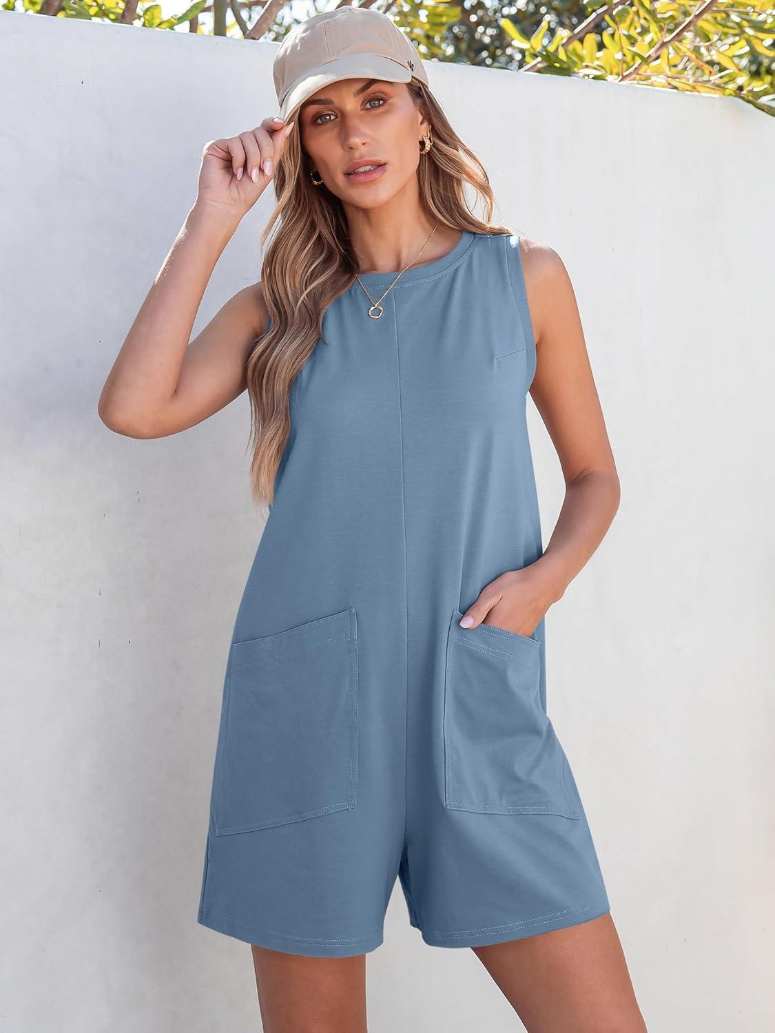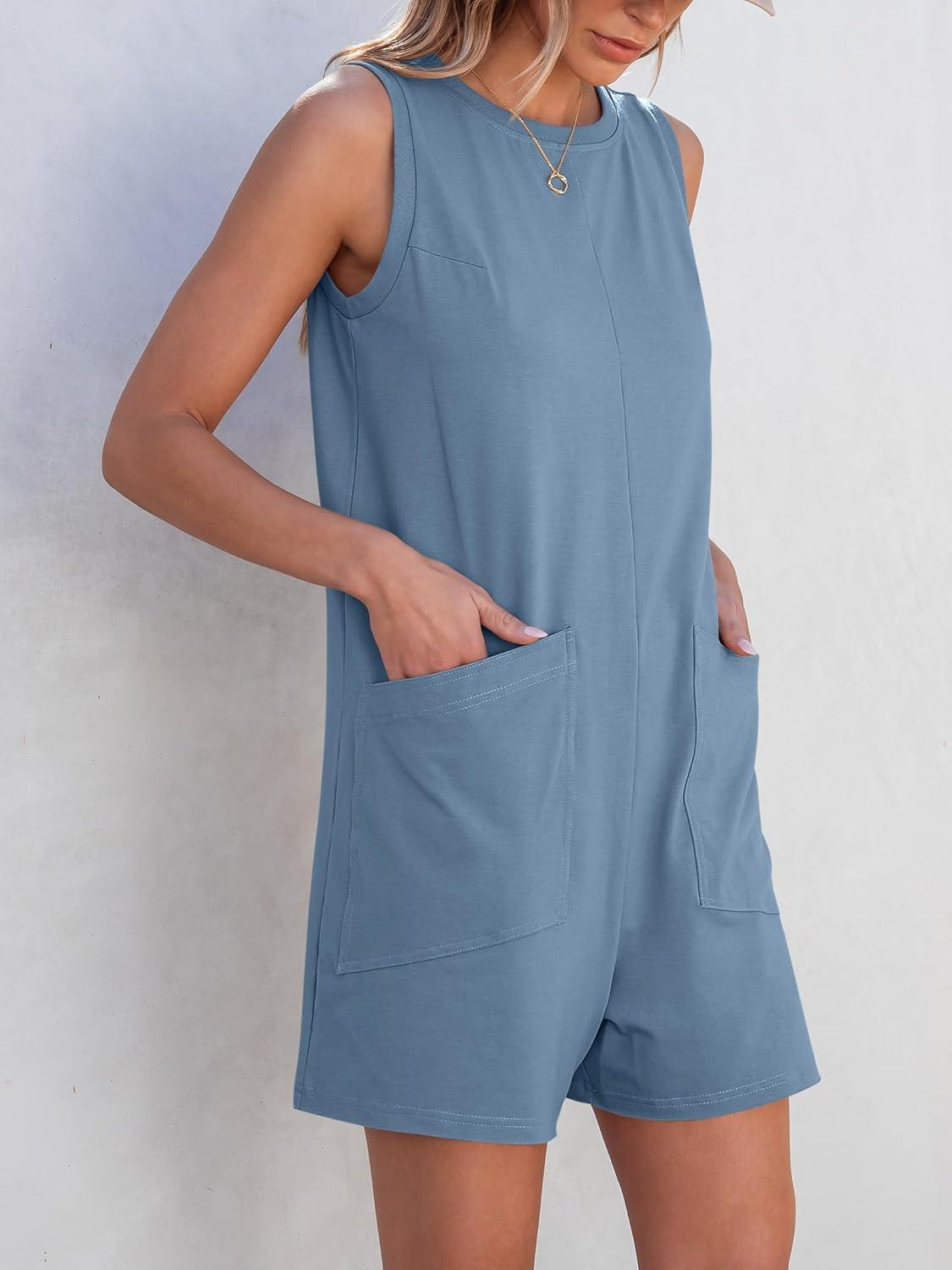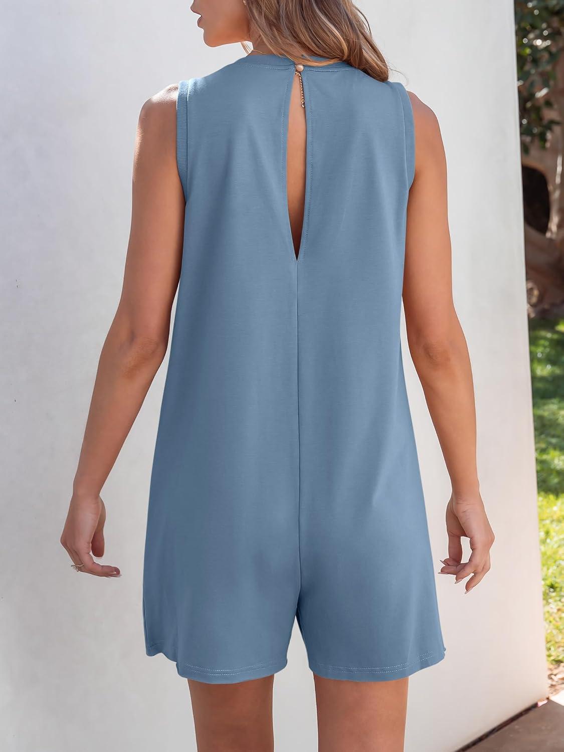 ANRABESS Womens Romper Casual Loose Sleeveless 2025 Summer One Piece Outfit Crewneck Short Jumpsuit Overall Outfits & Pockets(Light Blue)
