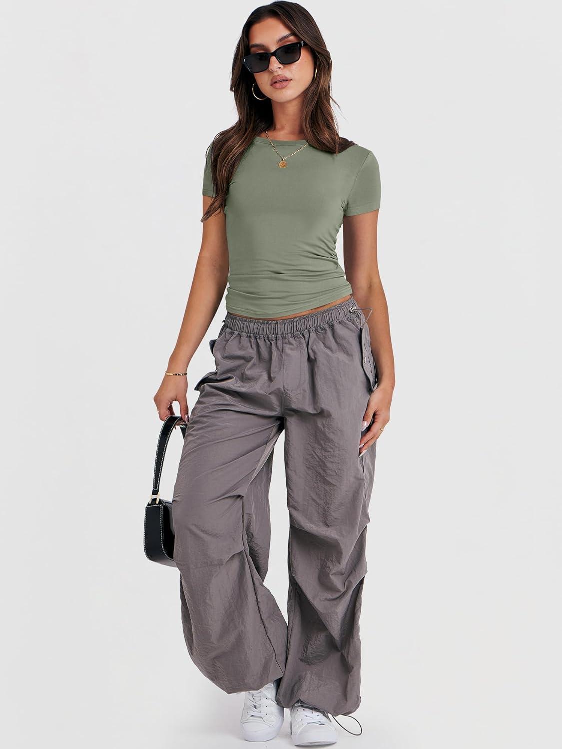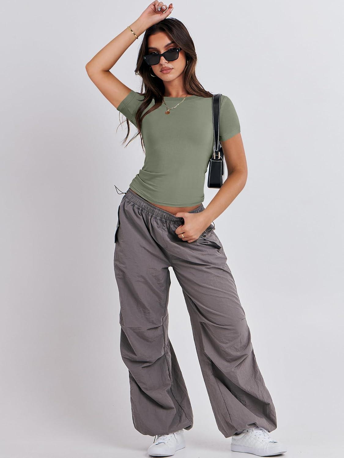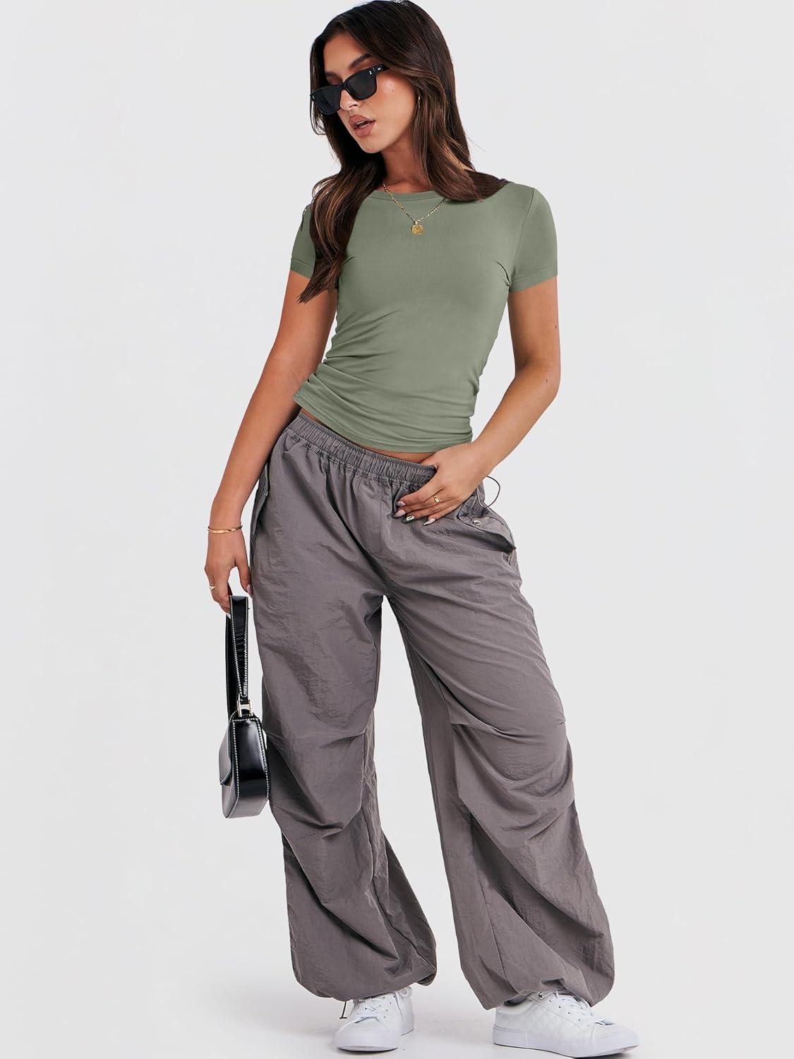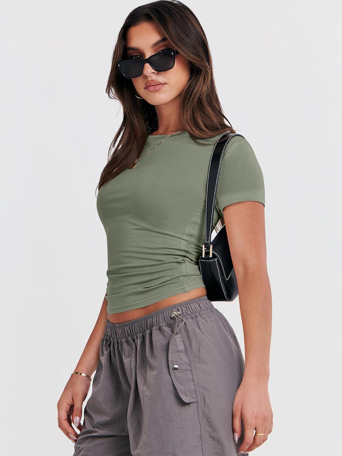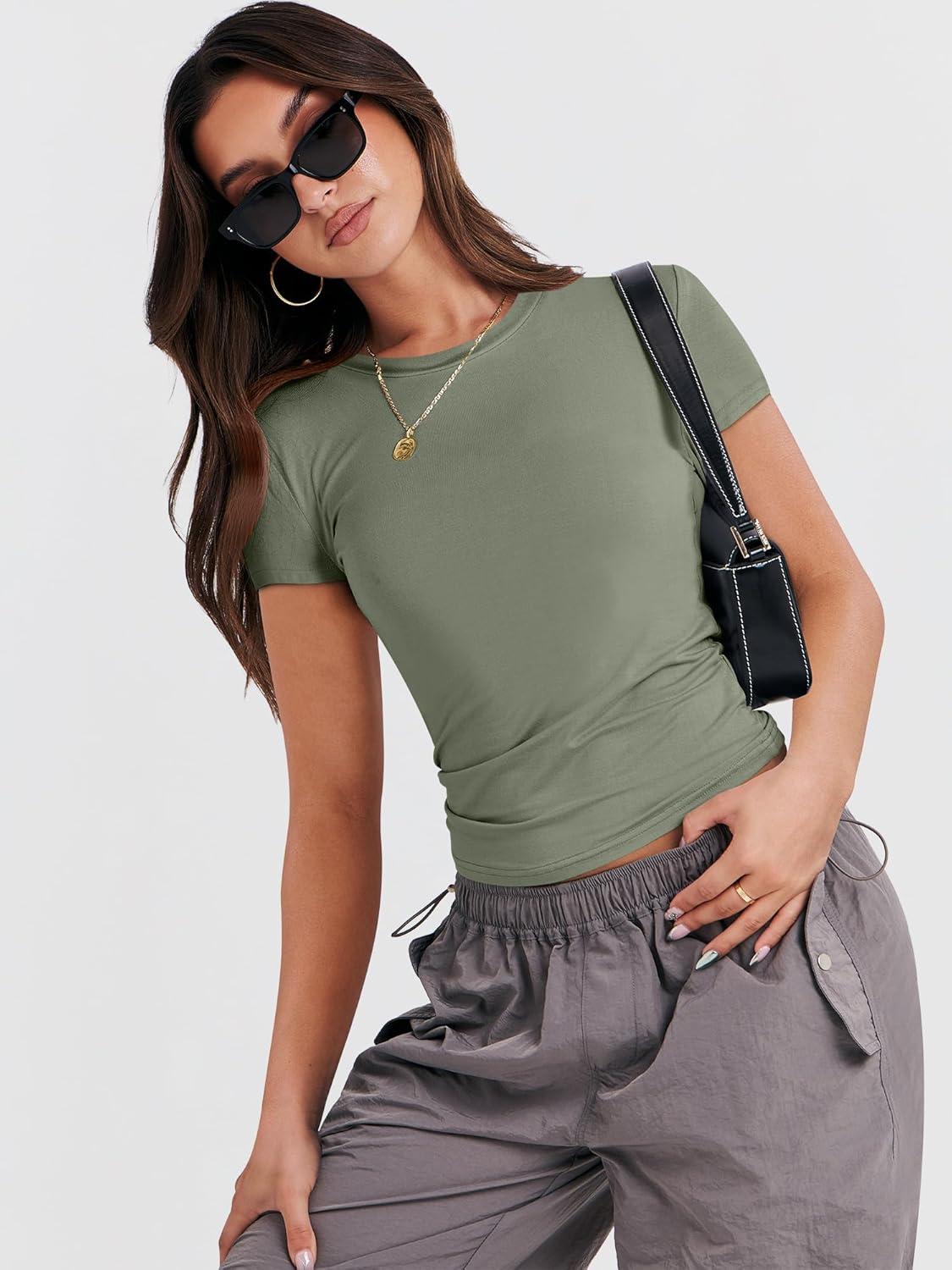 ANRABESS Women’s Short Sleeve Summer T Shirts Crew Neck Slim Fit Basic Tees 2026 Crop Tops Y2k Clothes Outfits(Army Green)